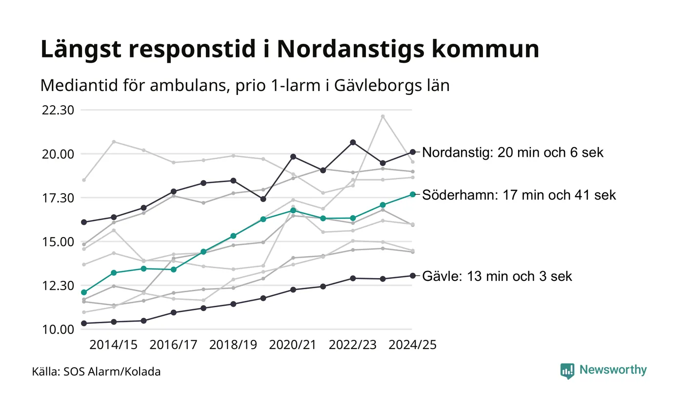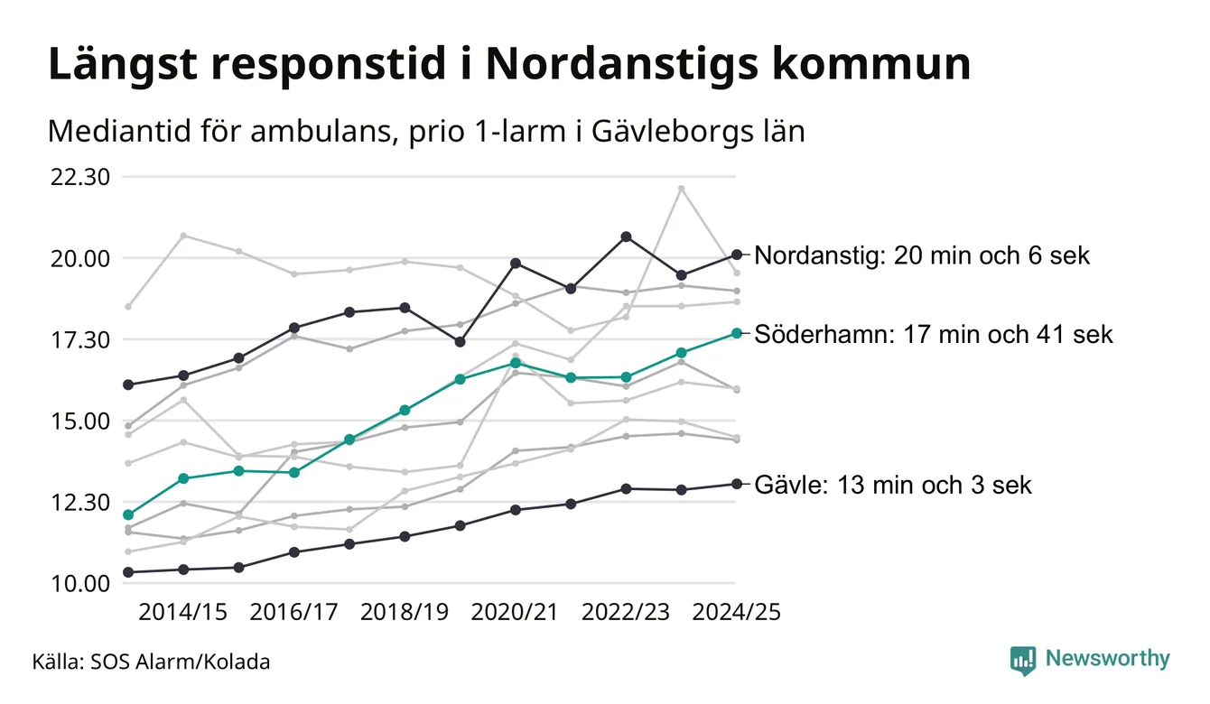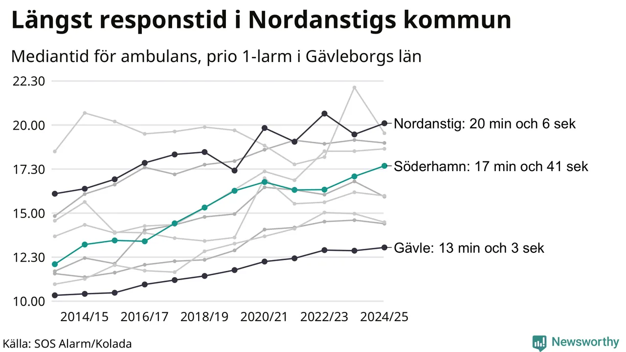 Söderhamn tillhör inte de kommuner i Region Gävleborg som får vänta längst på ambulans – men inte heller de som får snabbast hjälp. Längst är väntetiden i Nordanstigs kommun: 20 minuter och 6 sekunder. Snabbast var ambulansen framme i Gävle, där det tog 13 minuter och 3 sekunder från larmsamtalet 2024/2025.