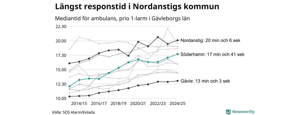 Det tar 17 minuter och 41 sekunder från att 112-samtalet når larmcentralen till att ambulansen är på plats i Söderhamns kommun. Det visar de senaste siffrorna från SOS Alarm. Tiden är en mediantid för alla prio 1-larm mellan 1 juni 2024 och 31 maj 2025 och ett nyckeltal som redovisas varje år.