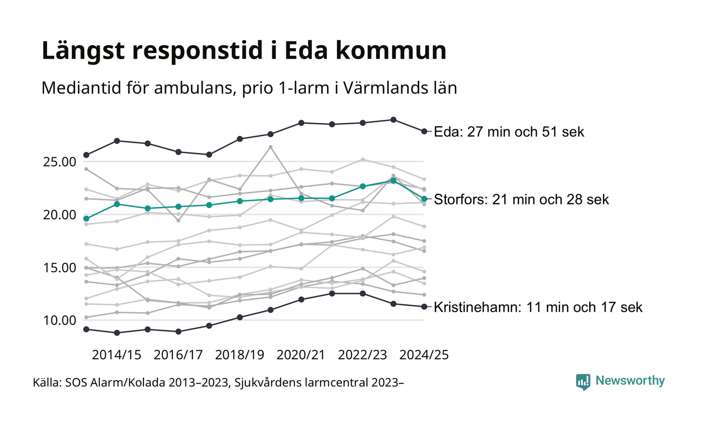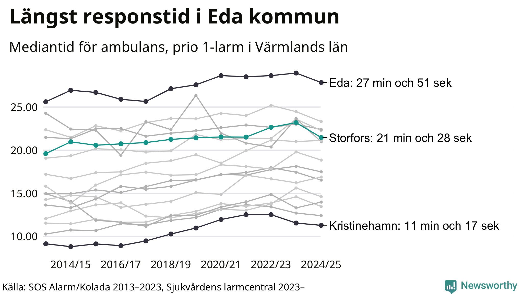 Eda är alltså en av de kommuner som får vänta längst på ambulans i landet. Längst är väntan på ambulans i Pajala kommun, 37 minuter och 55 sekunder. Kommunerna med längst responstid finns i Norrlands inland eller i glesbygd.