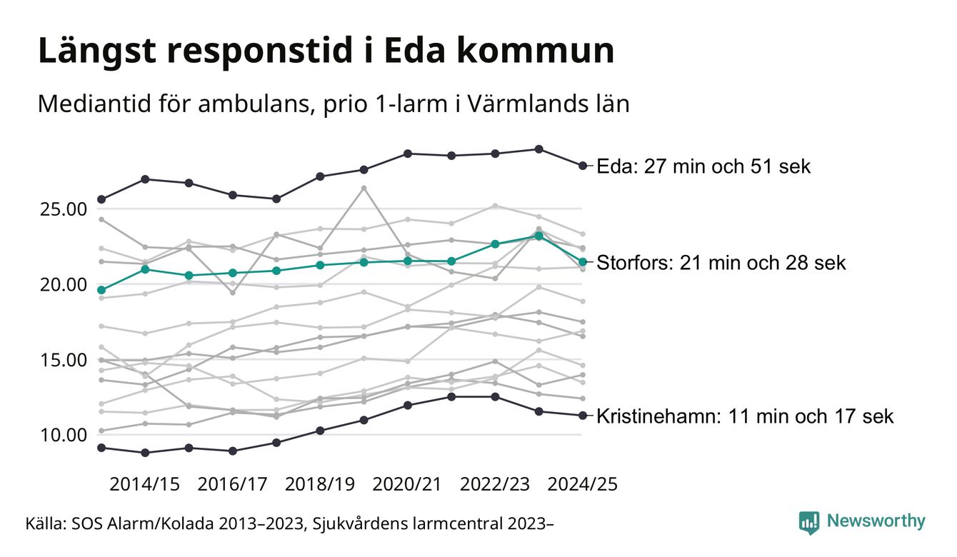 Det tar 21 minuter och 28 sekunder från att 112-samtalet når larmcentralen till att ambulansen är på plats i Storfors kommun. Det visar de senaste siffrorna från Sjukvårdens larmcentral. Tiden är en mediantid för alla prio 1-larm mellan 1 juni 2024 och 31 maj 2025 och ett nyckeltal som redovisas varje år.