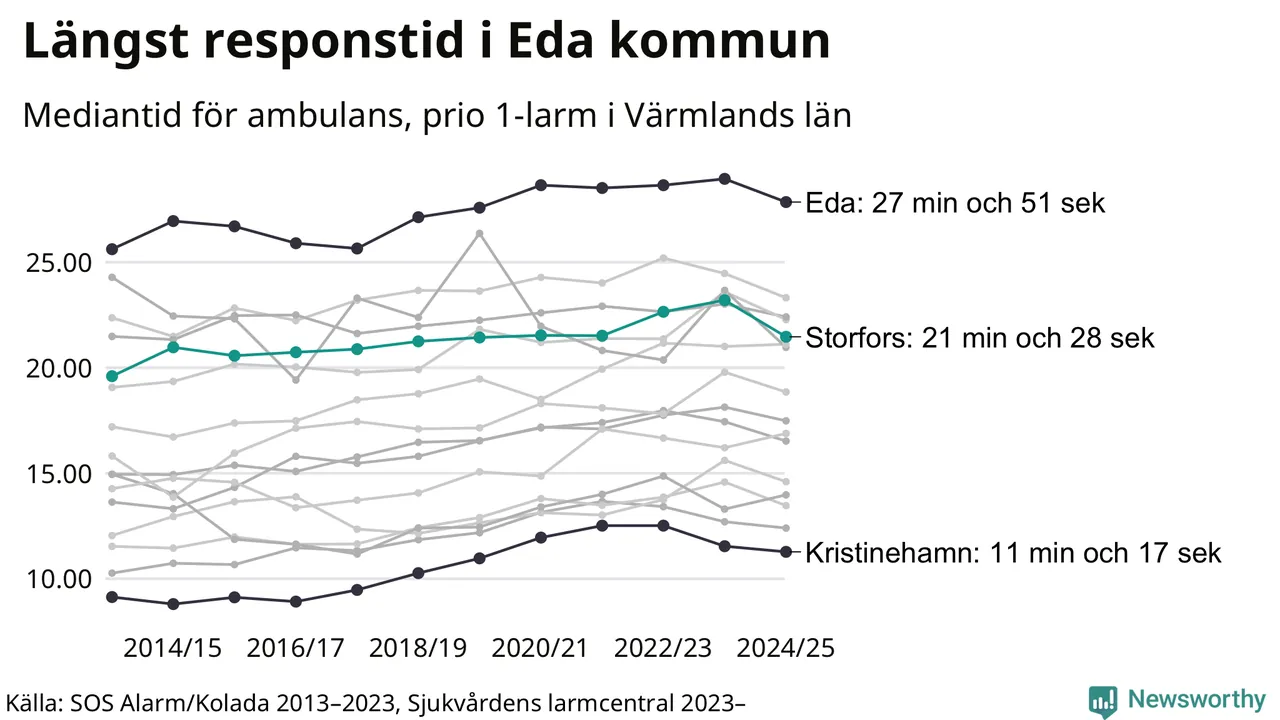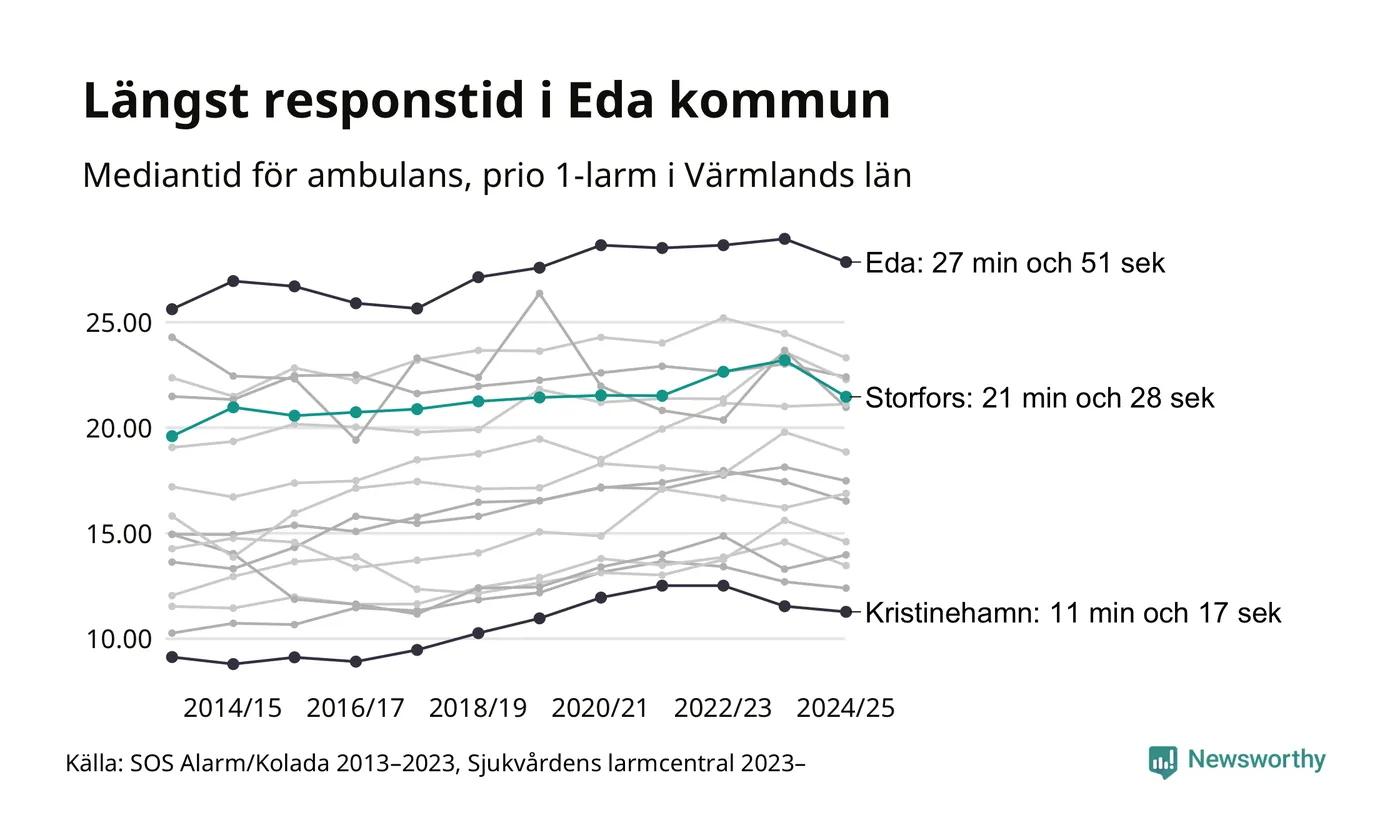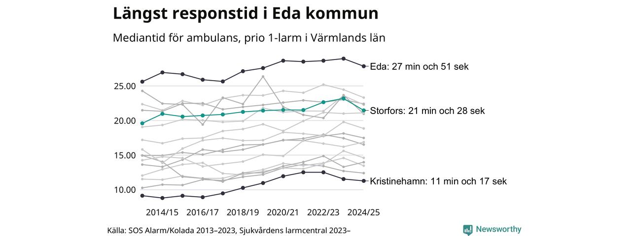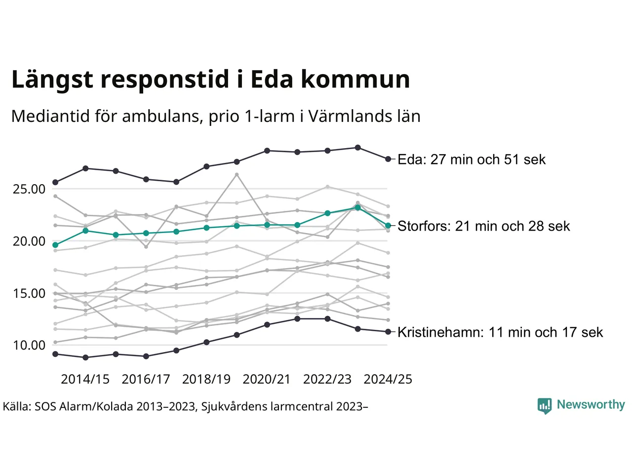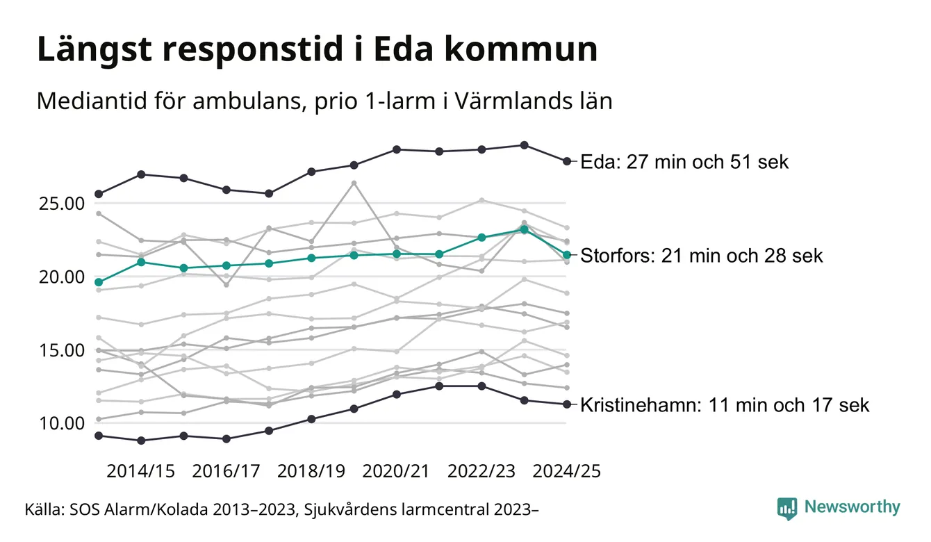Storfors tillhör de kommuner i Region Värmland som får vänta längst på ambulansen. Längst är väntetiden i Eda kommun, som också tillhör de tio kommuner i landet som får vänta längst på ambulans: 27 minuter och 51 sekunder. Snabbast var ambulansen framme i Kristinehamn, där det tog 11 minuter och 17 sekunder från larmsamtalet 2024/2025.