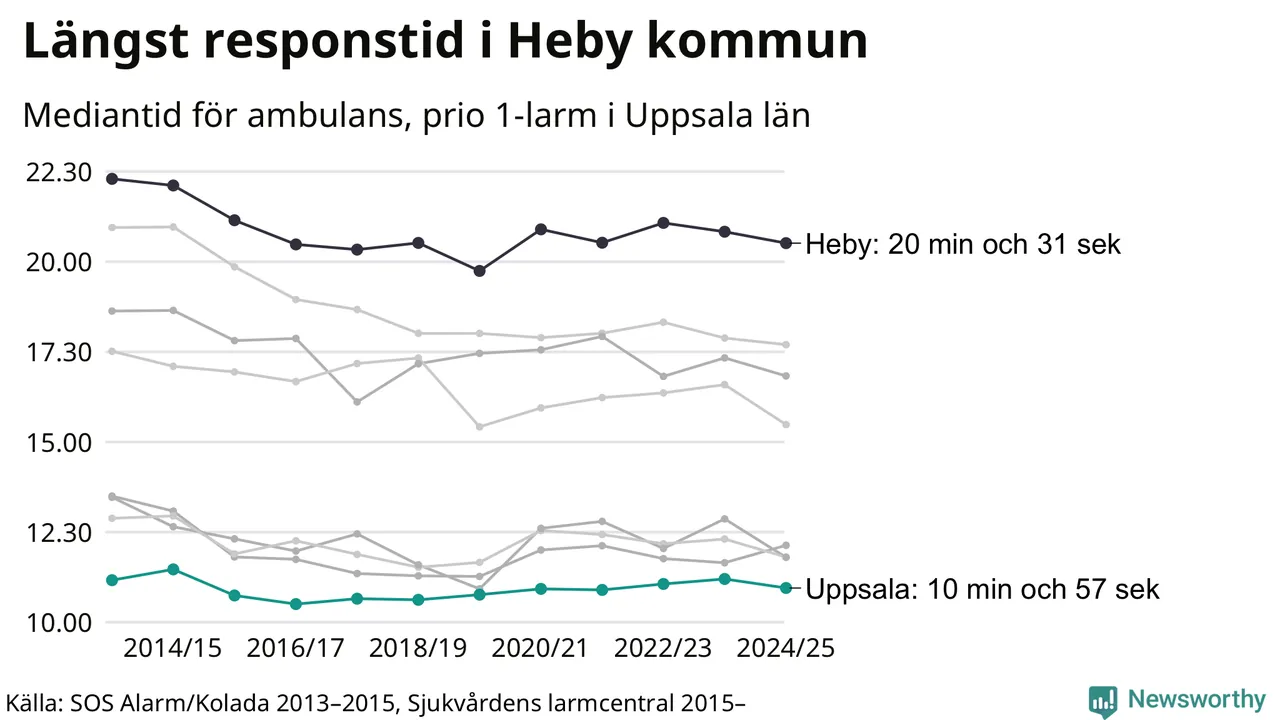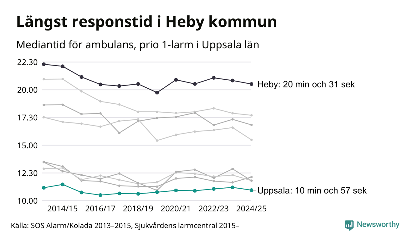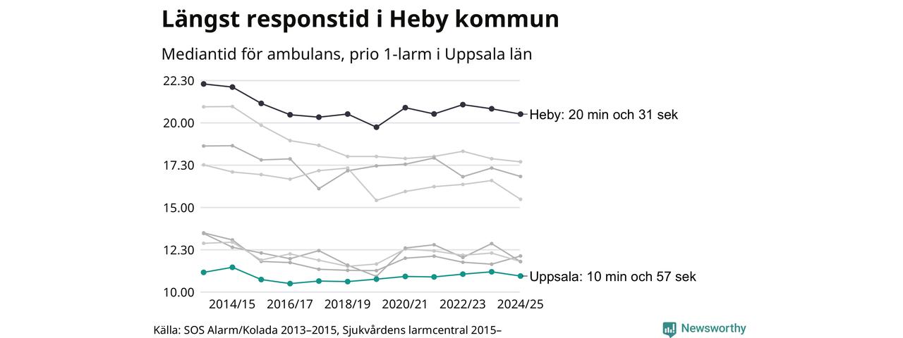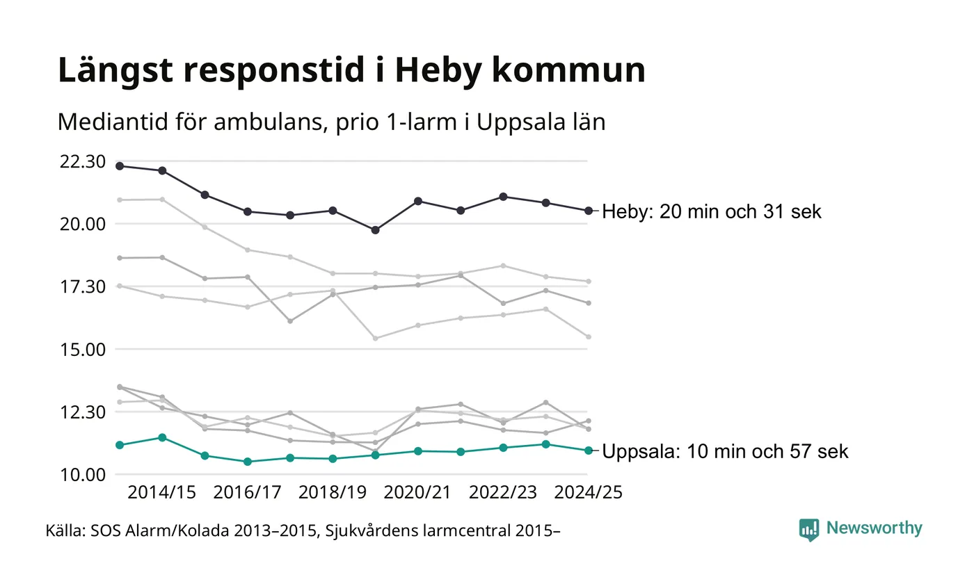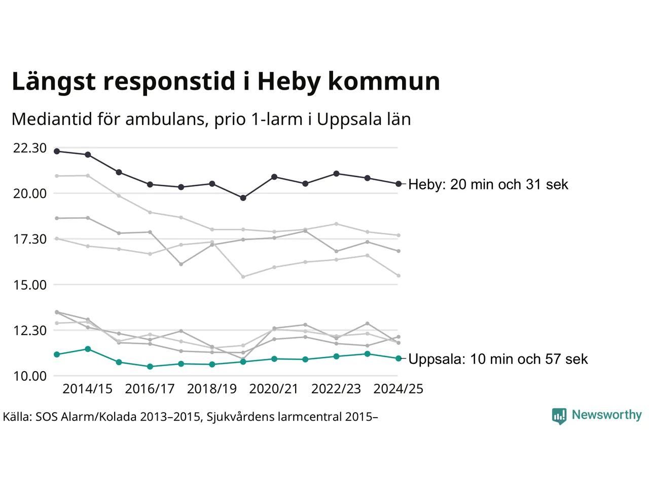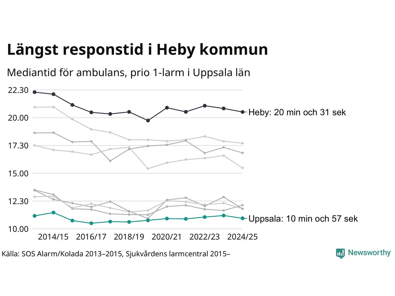 Även om väntan i Heby är lång för att vara Region Uppsala krävs ytterligare 4 minuter och 35 sekunder för att ta sig in på topp tiolistan över kommuerna i landet med längst väntetid. Längst är väntan på ambulans i Pajala kommun, 37 minuter och 55 sekunder. Kommunerna med längst responstid finns i Norrlands inland eller i glesbygd.