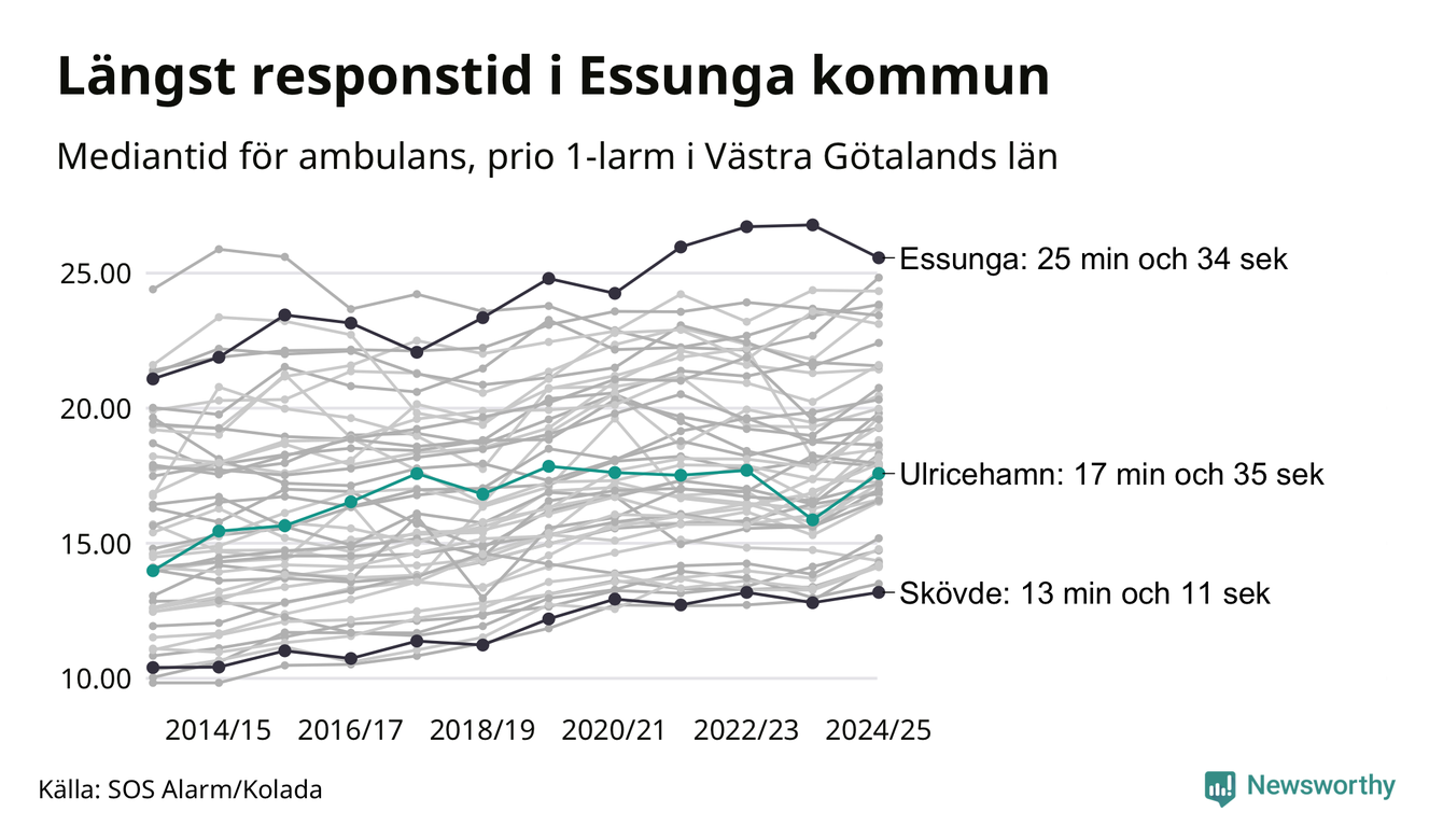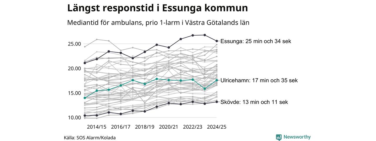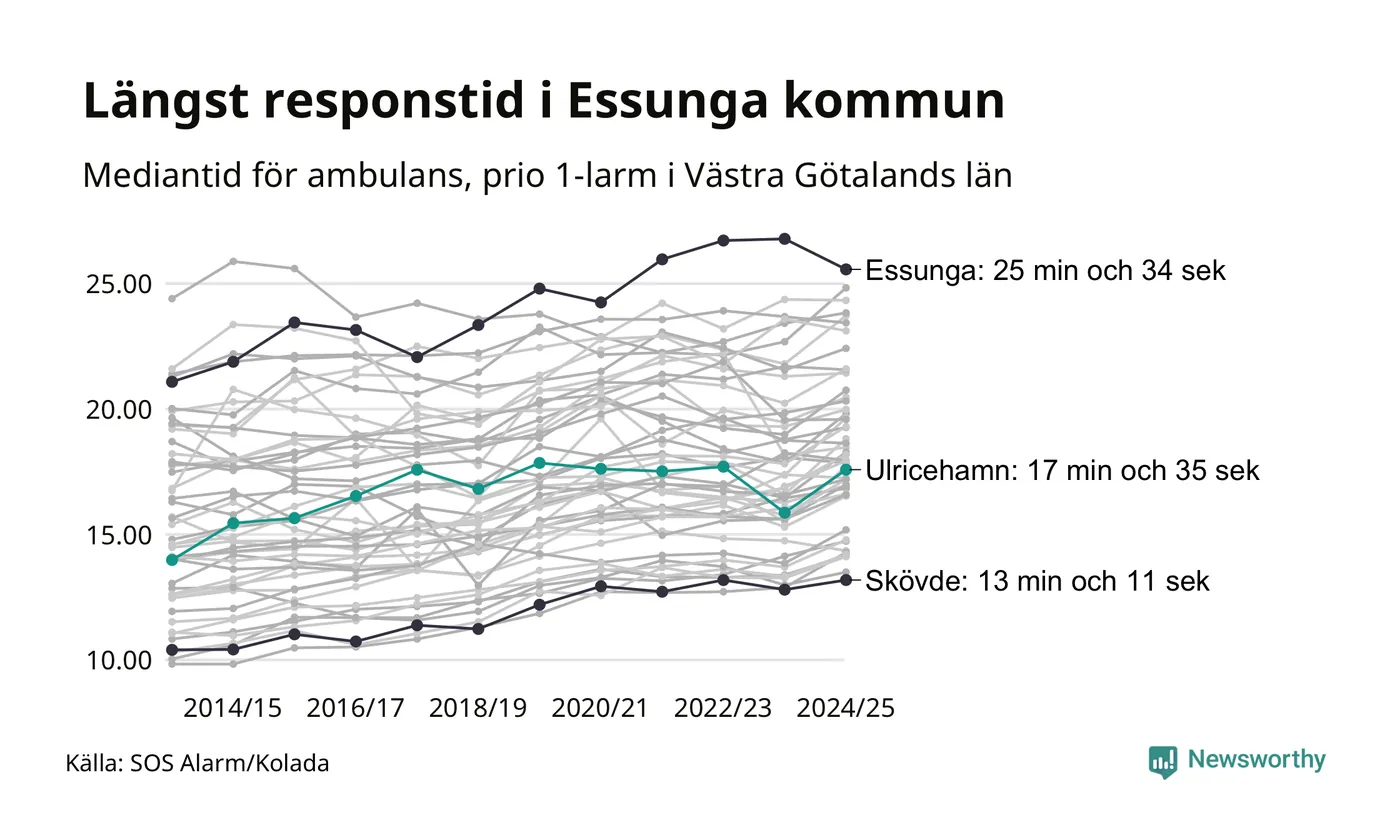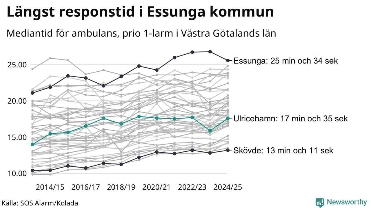 Ulricehamn tillhör inte de kommuner i Västra Götalandsregionen som får vänta längst på ambulans – men inte heller de som får snabbast hjälp. Längst är väntetiden i Essunga kommun, som också tillhör de tio kommuner i landet som får vänta längst på ambulans: 25 minuter och 34 sekunder. Snabbast var ambulansen framme i Skövde, där det tog 13 minuter och 11 sekunder från larmsamtalet 2024/2025.
