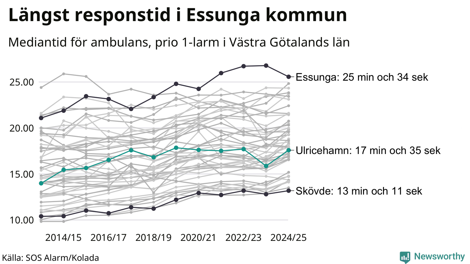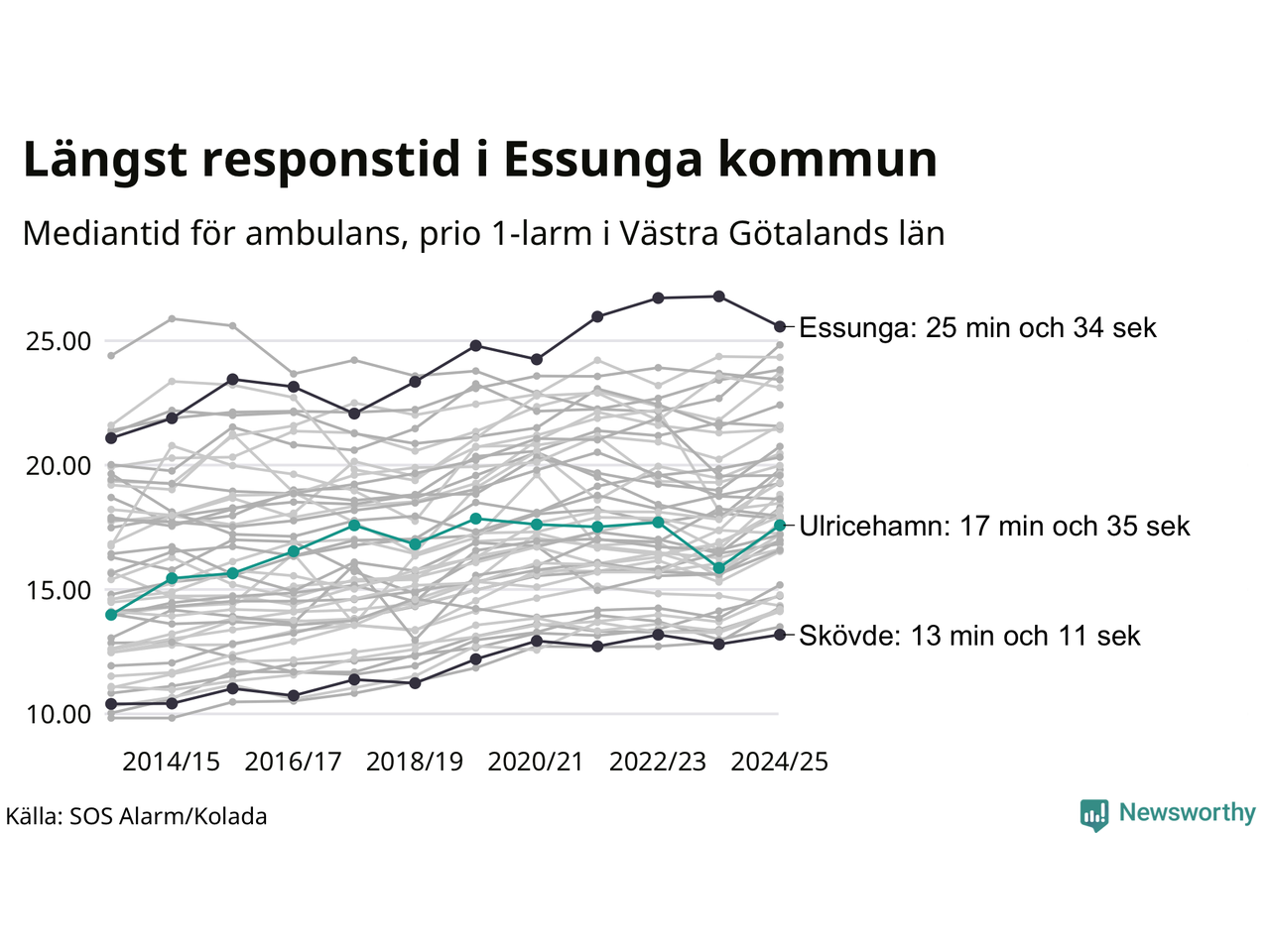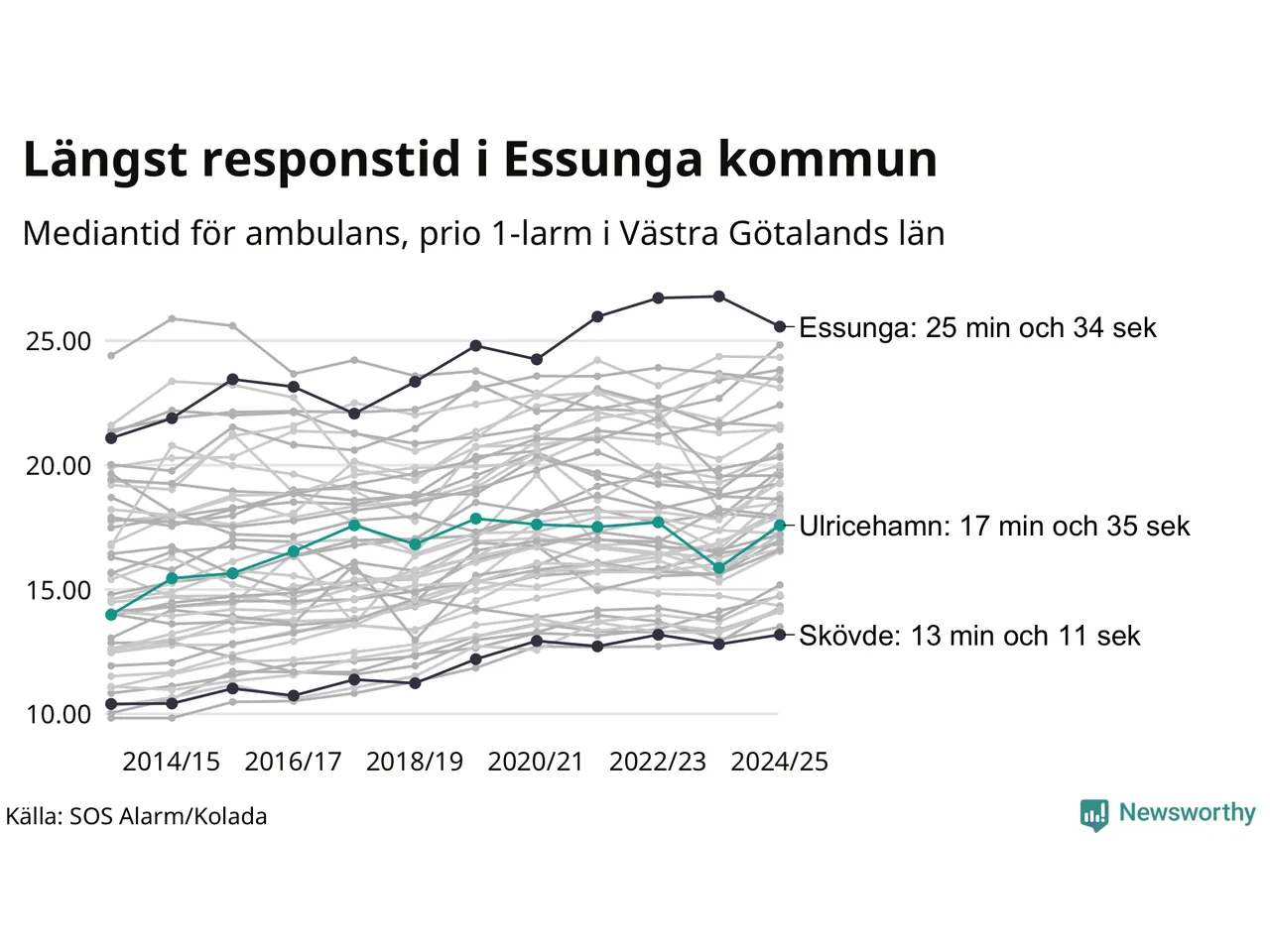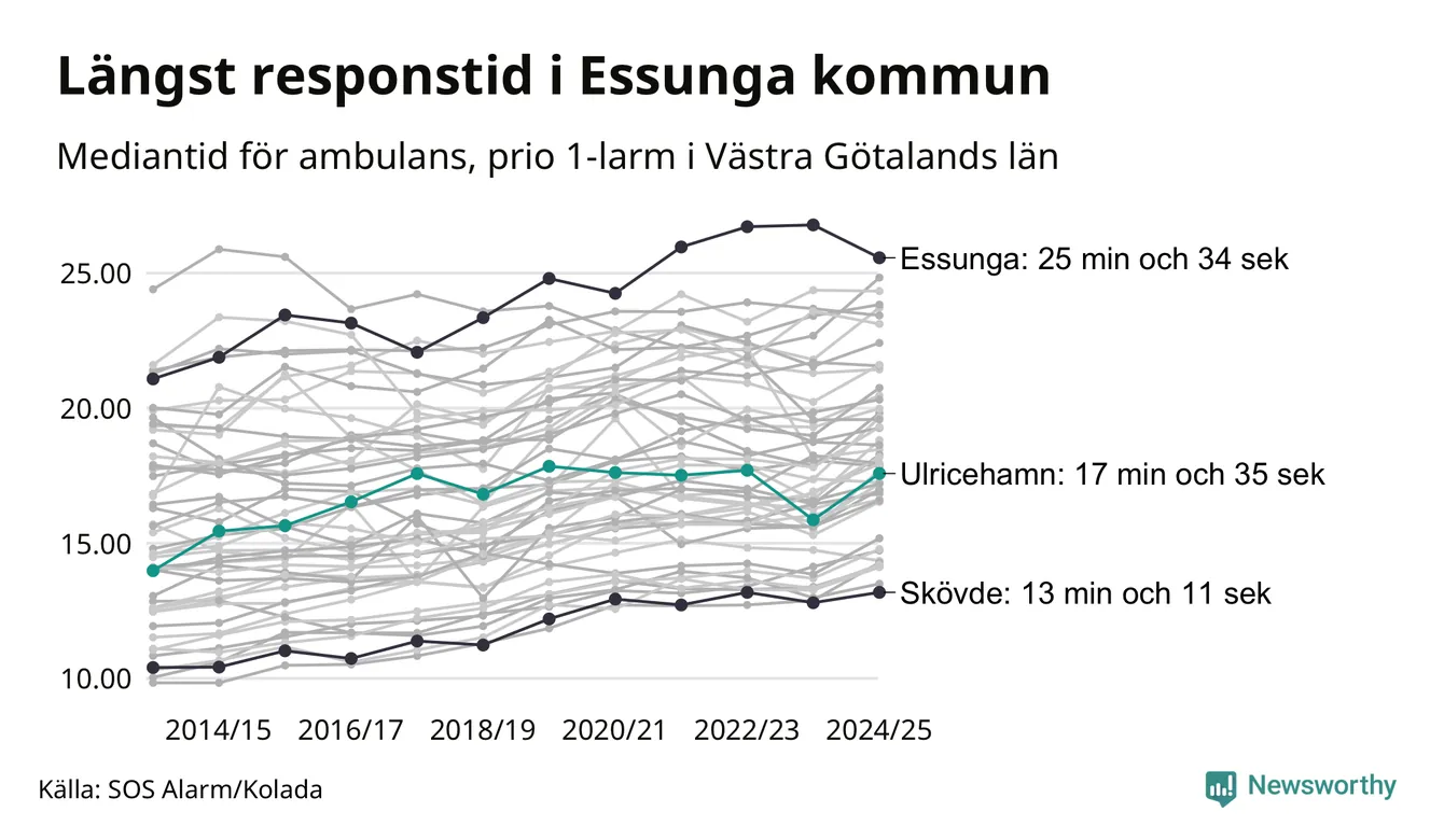Essunga är alltså en av de kommuner som får vänta längst på ambulans i landet. Längst är väntan på ambulans i Pajala kommun, 37 minuter och 55 sekunder. Kommunerna med längst responstid finns i Norrlands inland eller i glesbygd.