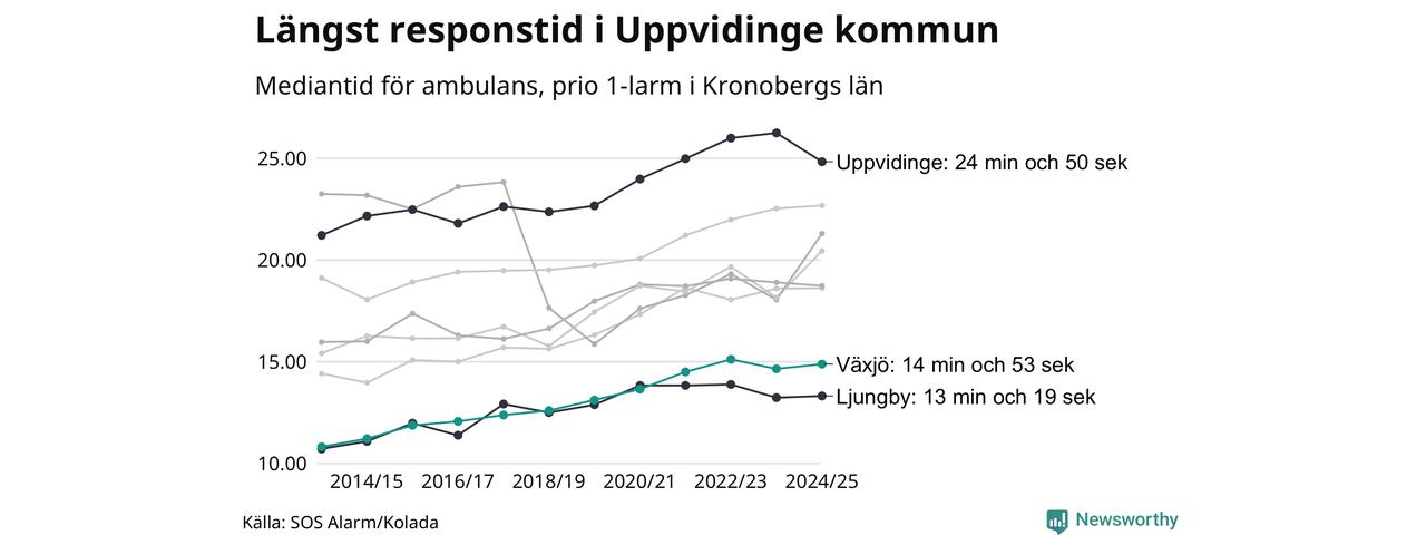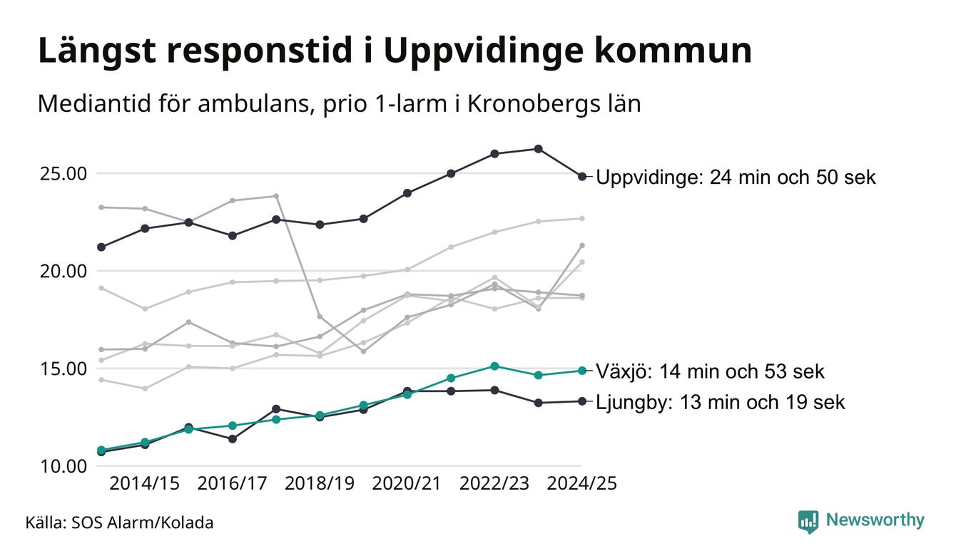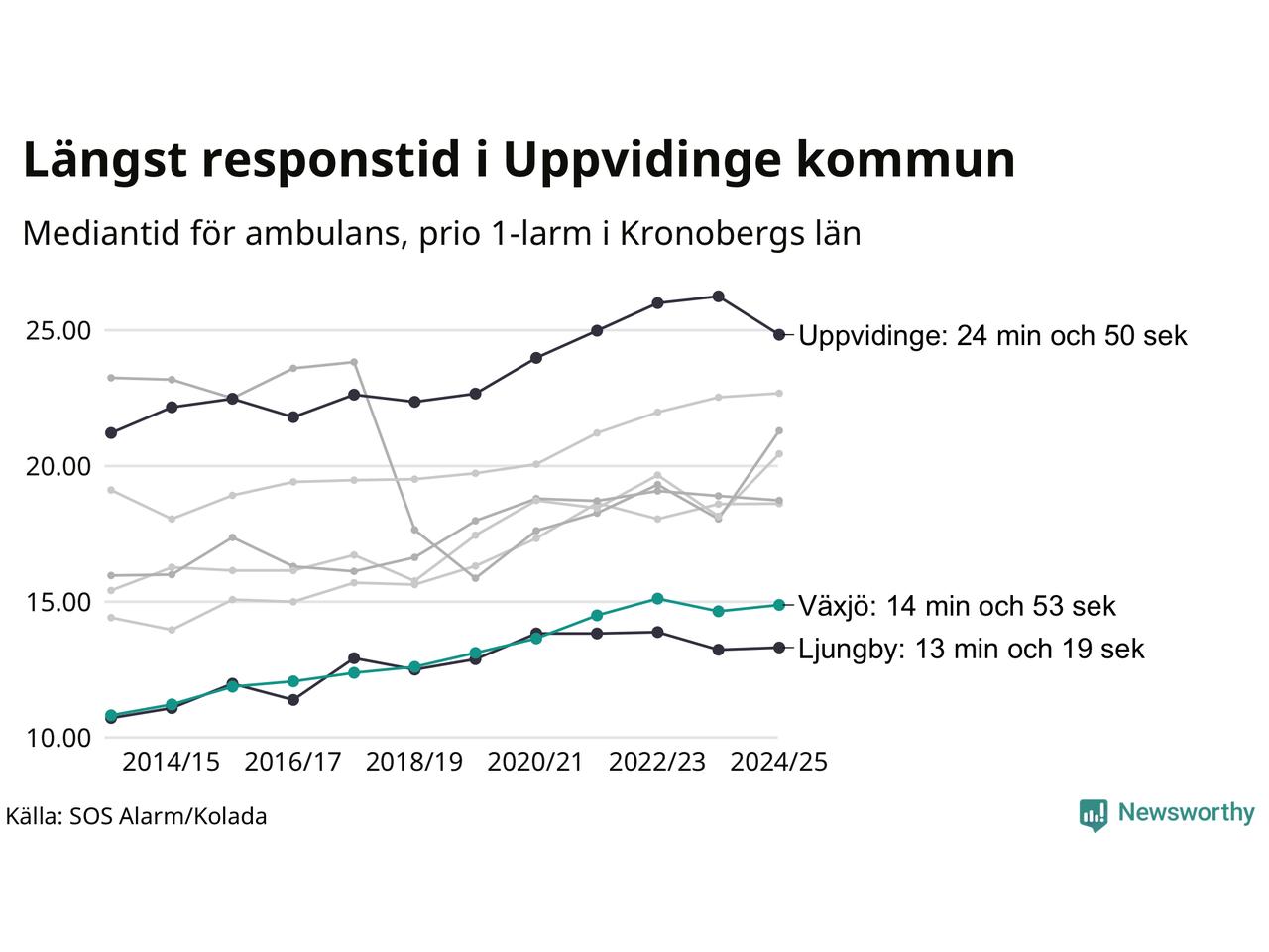 Bland kommunerna i Region Kronoberg nåddes Växjö näst snabbast av ambulans under 2024/2025. Bara i Ljungby kommer ambulansen snabbare. Längst är väntetiden i Uppvidinge kommun: 24 minuter och 50 sekunder. Där har väntetiden ändå kapats med 1 minut och 25 sekunder jämfört med året innan.
