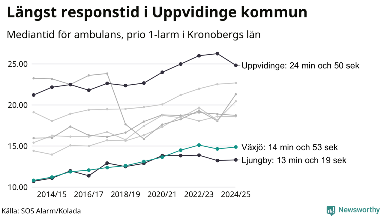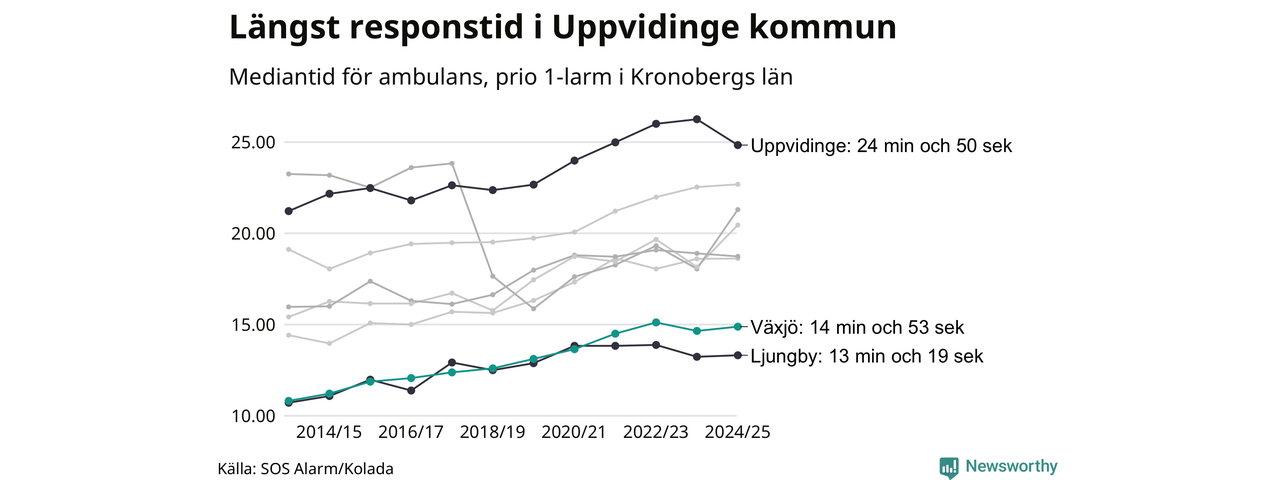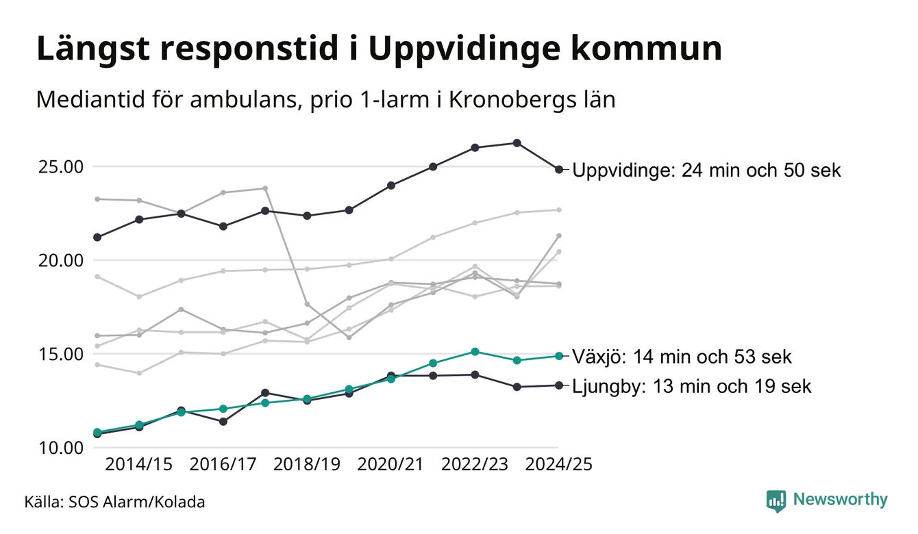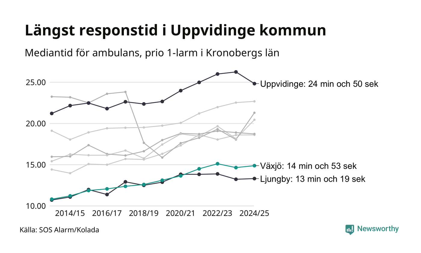 Bland kommunerna i Region Kronoberg nåddes Växjö näst snabbast av ambulans under 2024/2025. Bara i Ljungby kommer ambulansen snabbare. Längst är väntetiden i Uppvidinge kommun: 24 minuter och 50 sekunder. Där har väntetiden ändå kapats med 1 minut och 25 sekunder jämfört med året innan.