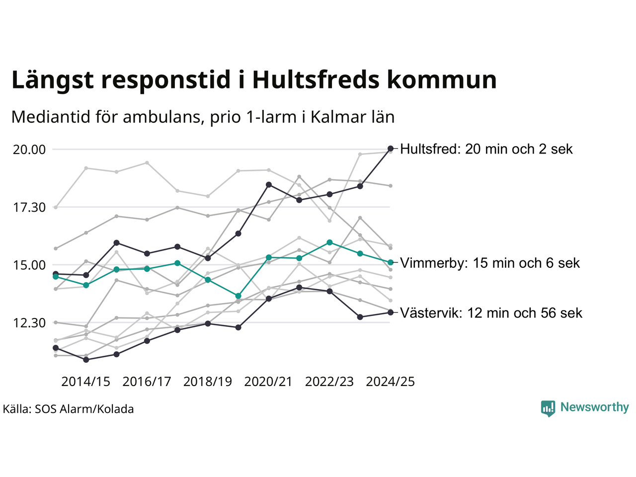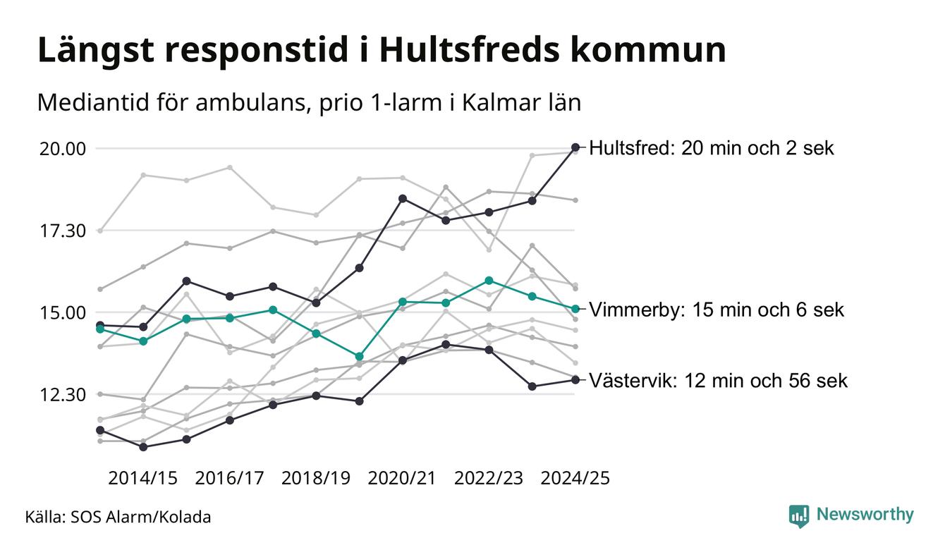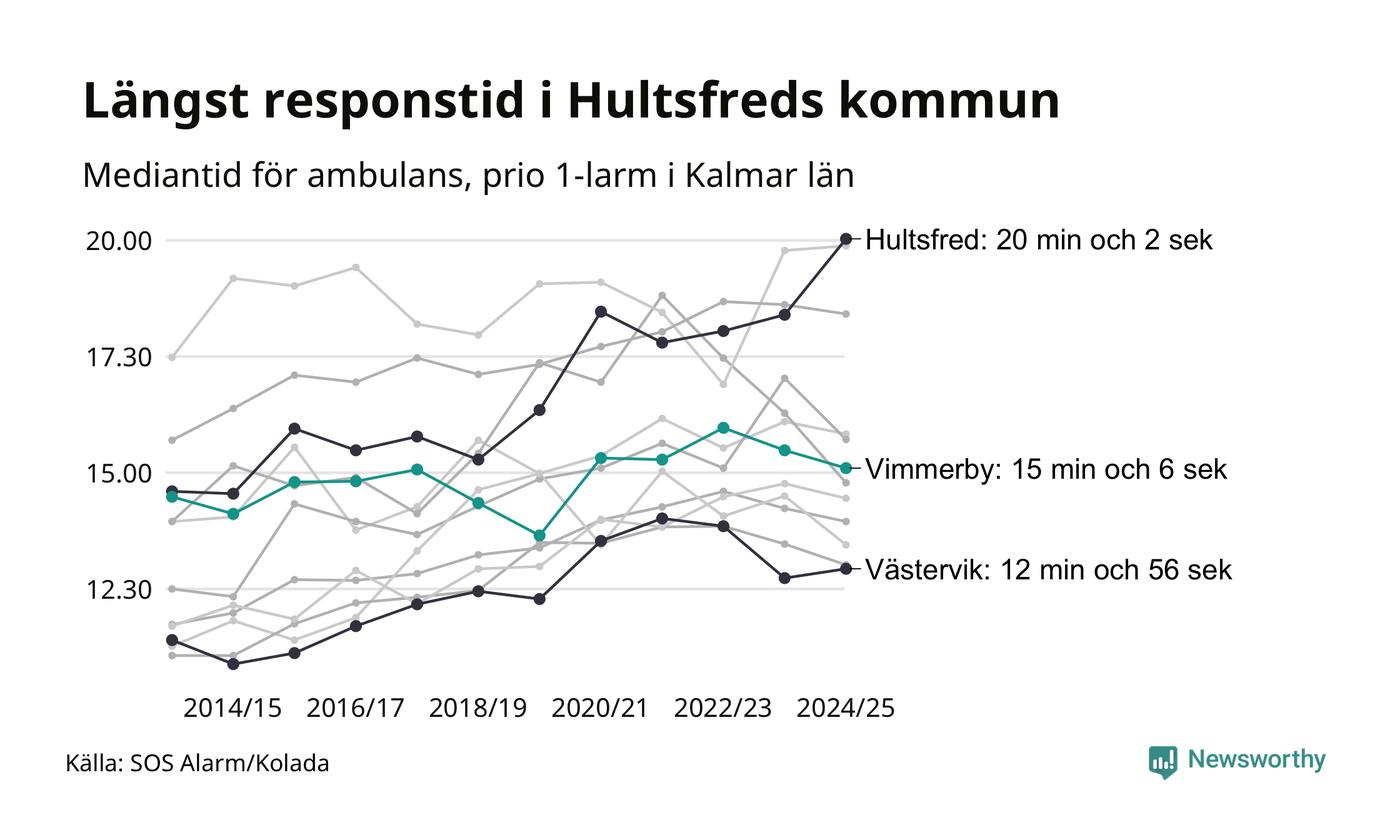 Även om väntan i Hultsfred är lång för att vara Region Kalmar krävs ytterligare 5 minuter och 4 sekunder för att ta sig in på topp tiolistan över kommuerna i landet med längst väntetid. Längst är väntan på ambulans i Pajala kommun, 37 minuter och 55 sekunder. Kommunerna med längst responstid finns i Norrlands inland eller i glesbygd.