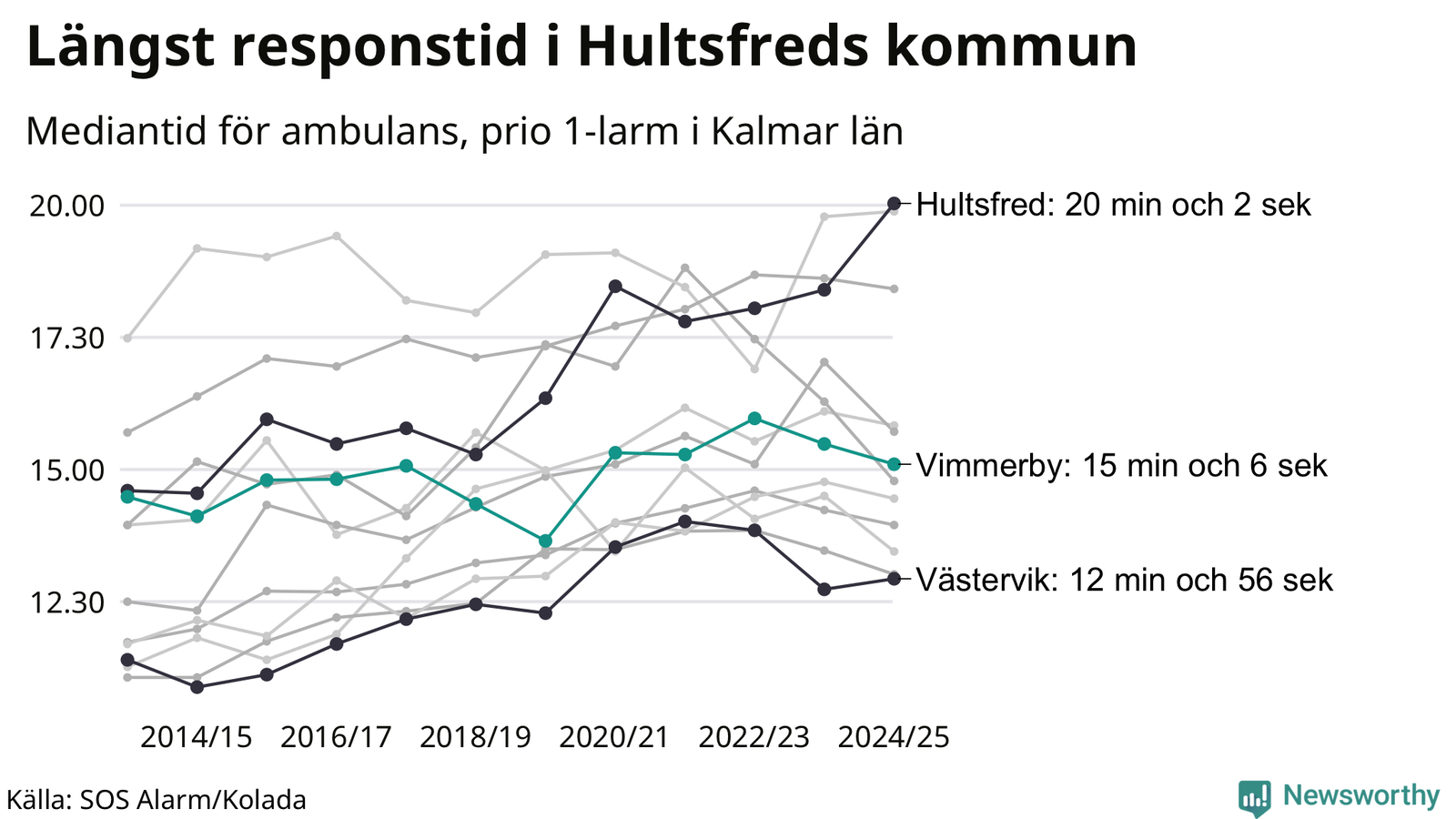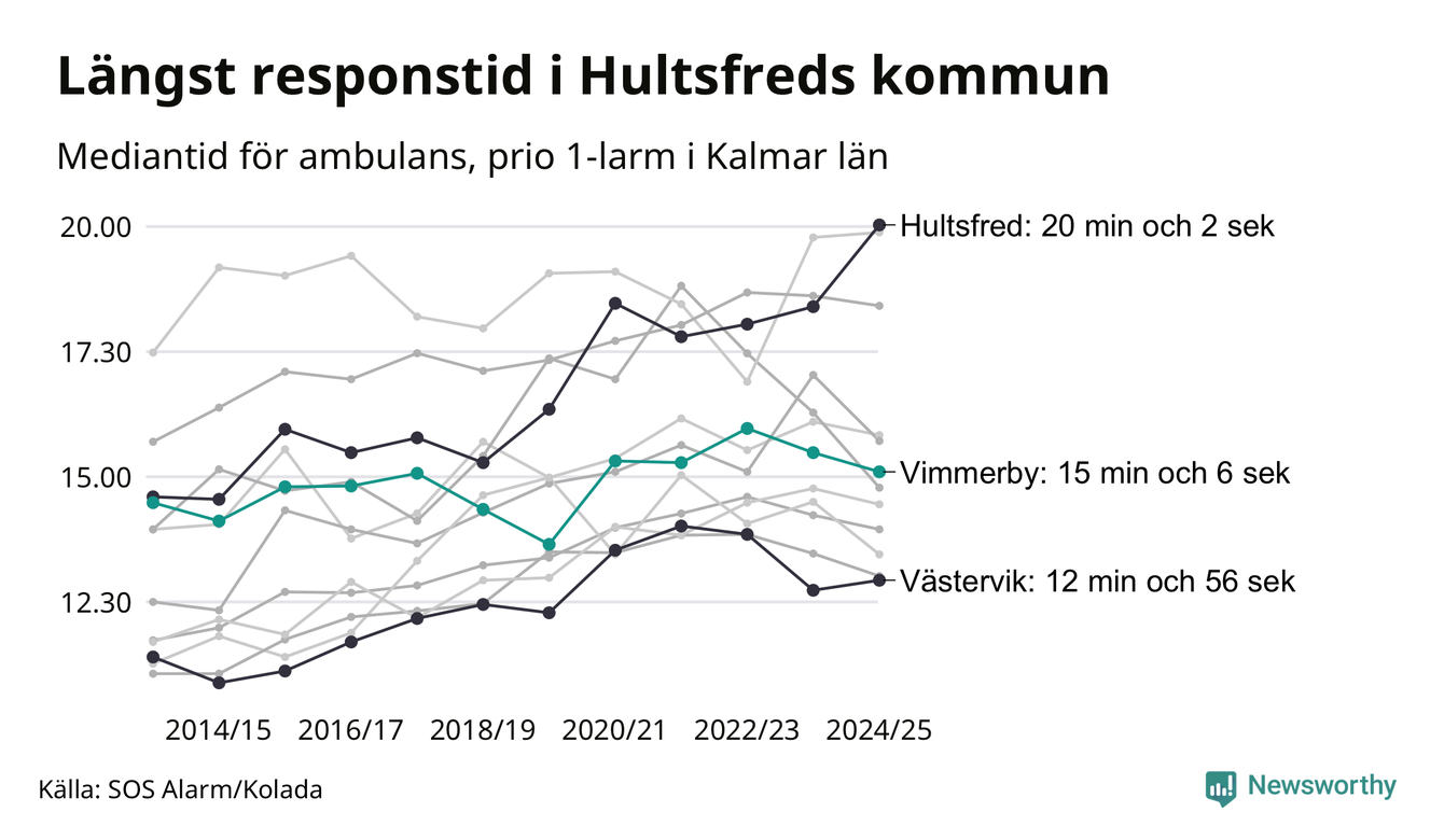 Det tar 15 minuter och 6 sekunder från att 112-samtalet når larmcentralen till att ambulansen är på plats i Vimmerby kommun. Det visar de senaste siffrorna från SOS Alarm. Tiden är en mediantid för alla prio 1-larm mellan 1 juni 2024 och 31 maj 2025 och ett nyckeltal som redovisas varje år.