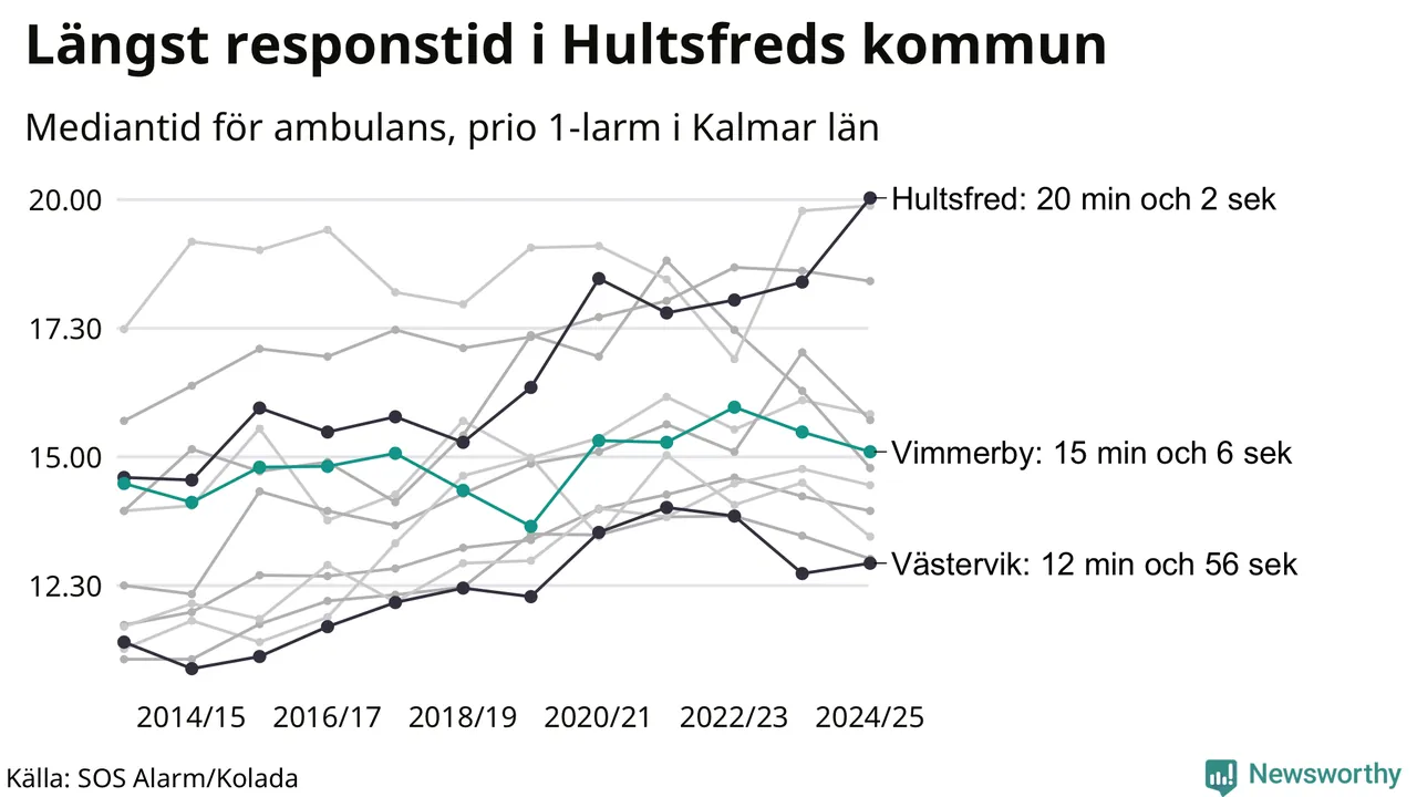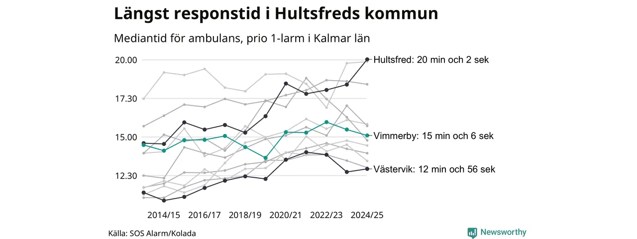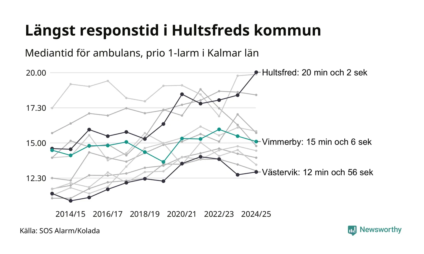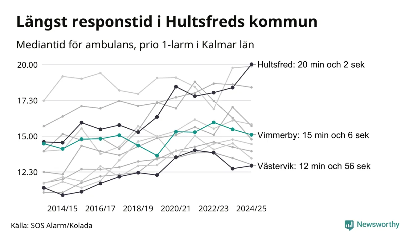Vimmerby tillhör inte de kommuner i Region Kalmar som får vänta längst på ambulans – men inte heller de som får snabbast hjälp. Längst är väntetiden i Hultsfreds kommun: 20 minuter och 2 sekunder. Snabbast var ambulansen framme i Västervik, där det tog 12 minuter och 56 sekunder från larmsamtalet 2024/2025.