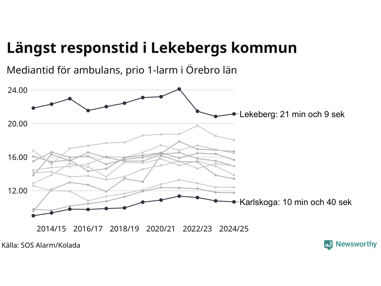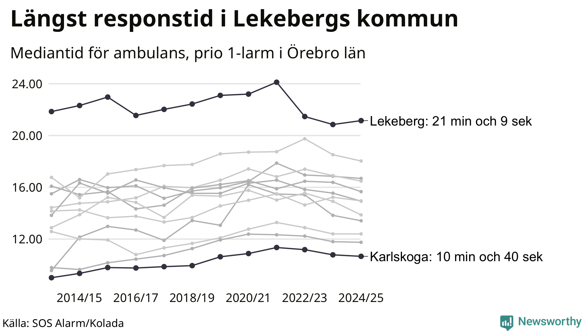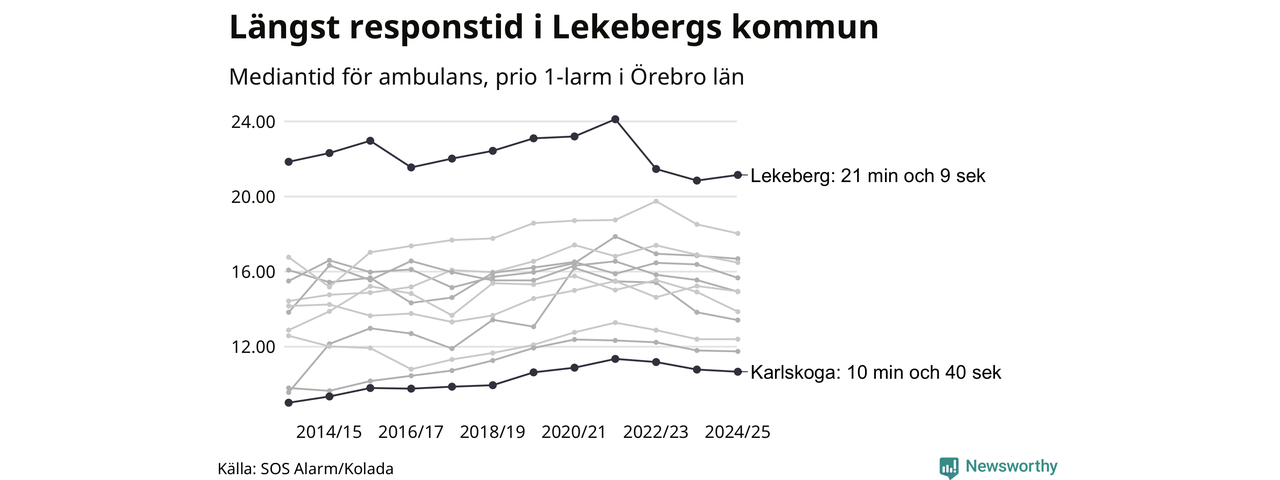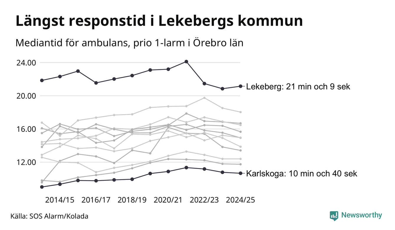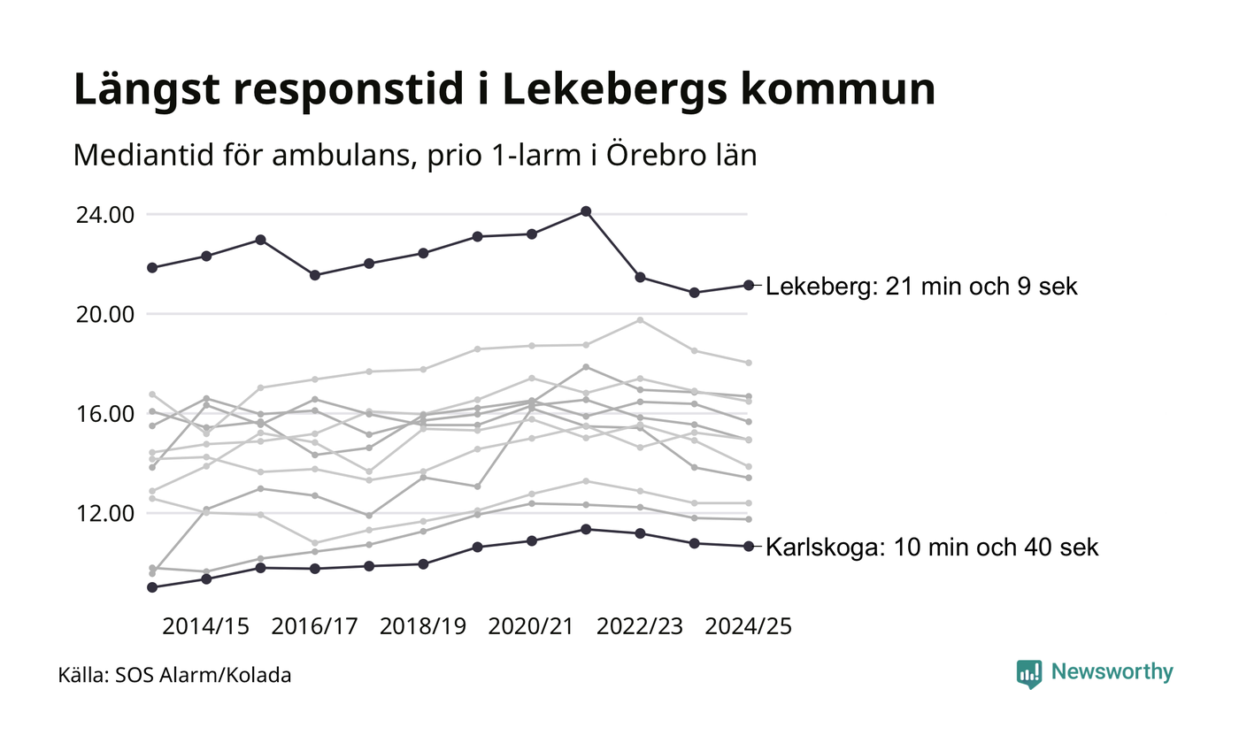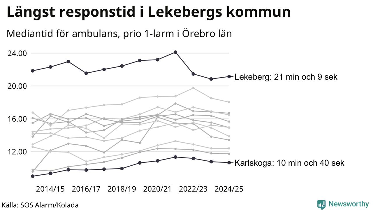 Det tar 21 minuter och 9 sekunder från att 112-samtalet når larmcentralen till att ambulansen är på plats i Lekebergs kommun. I Karlskoga dröjer den 10 minuter och 40 sekunder. Det visar de senaste siffrorna från SOS Alarm. Tiden är en mediantid för alla prio 1-larm mellan 1 juni 2024 och 31 maj 2025 och ett nyckeltal som redovisas varje år.