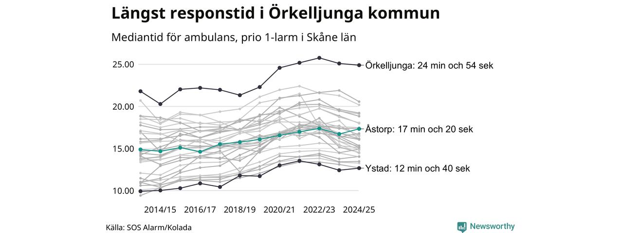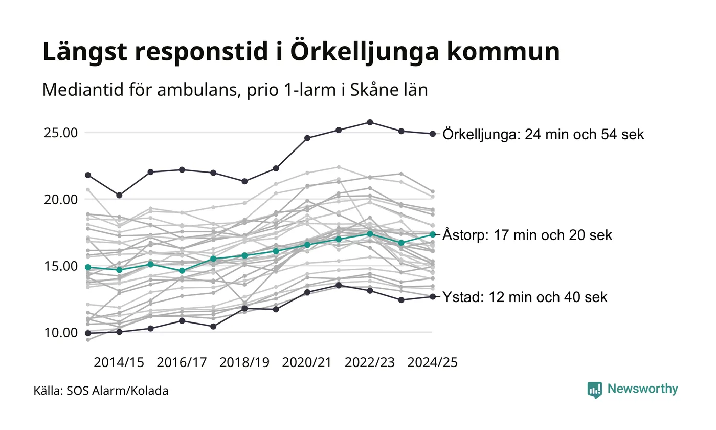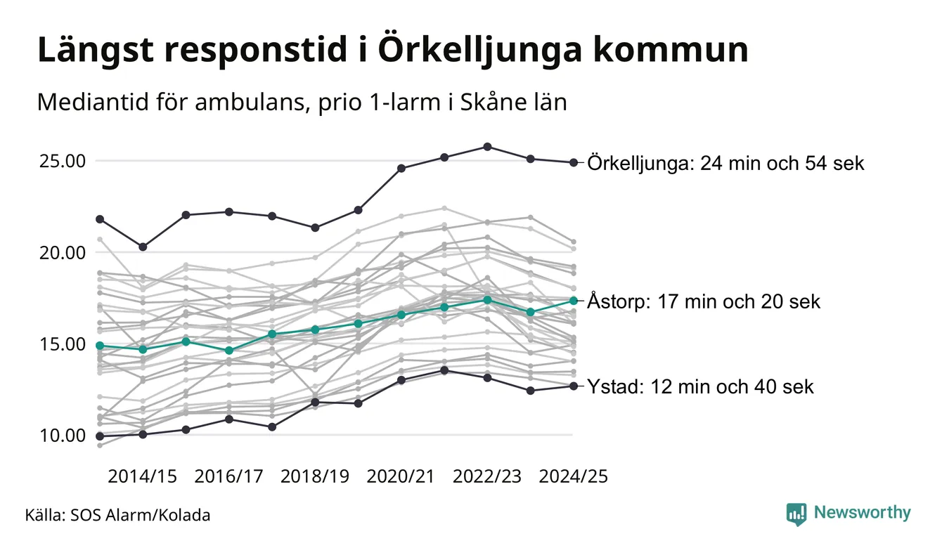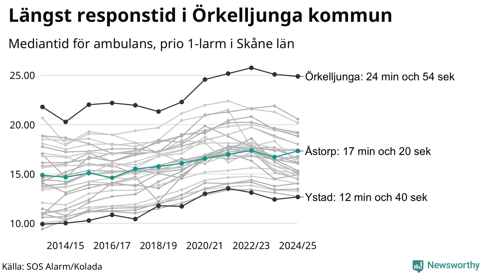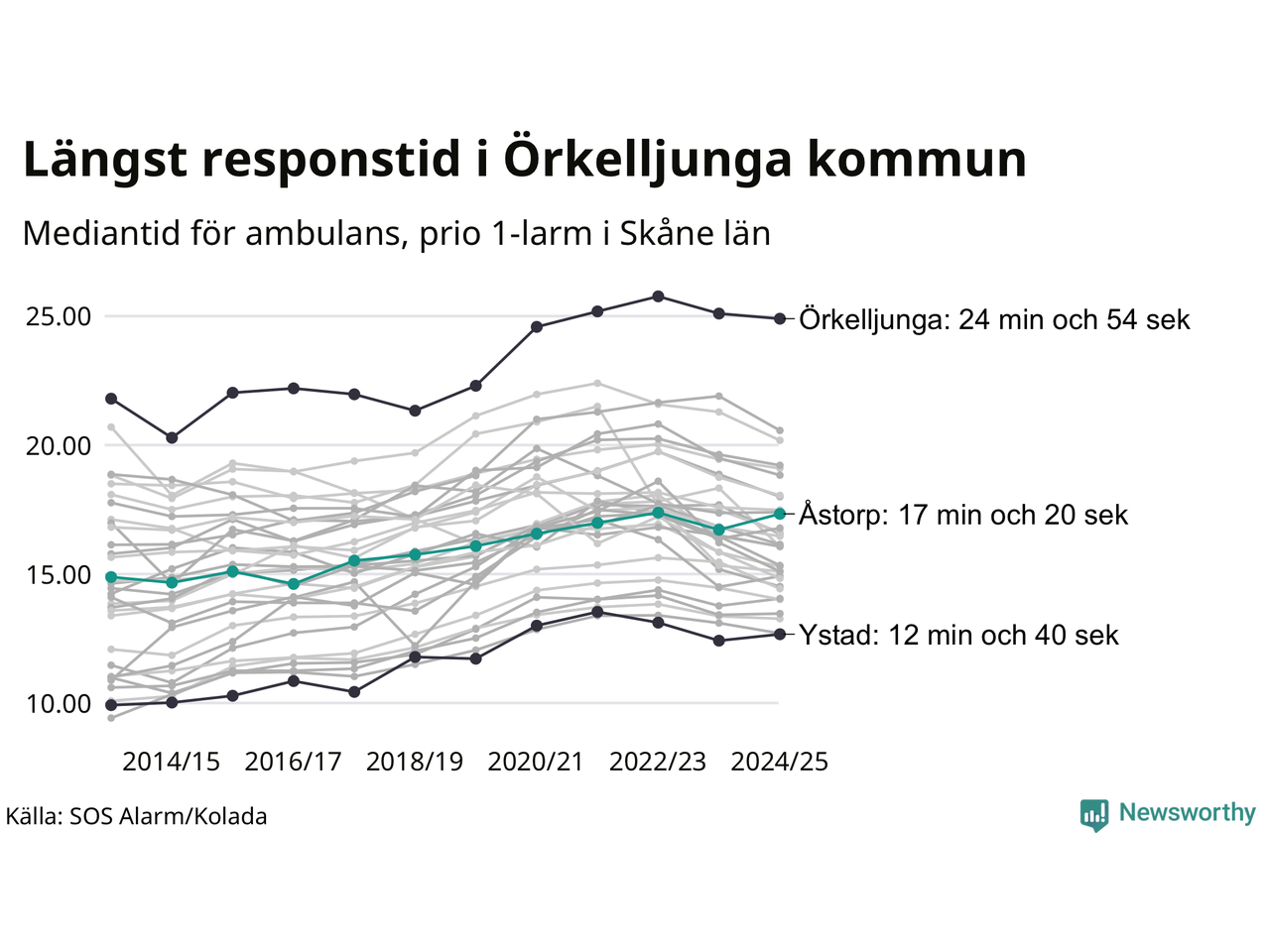 Åstorp tillhör inte de kommuner i Region Skåne som får vänta längst på ambulans – men inte heller de som får snabbast hjälp. Längst är väntetiden i Örkelljunga kommun: 24 minuter och 54 sekunder. Snabbast var ambulansen framme i Ystad, där det tog 12 minuter och 40 sekunder från larmsamtalet 2024/2025.