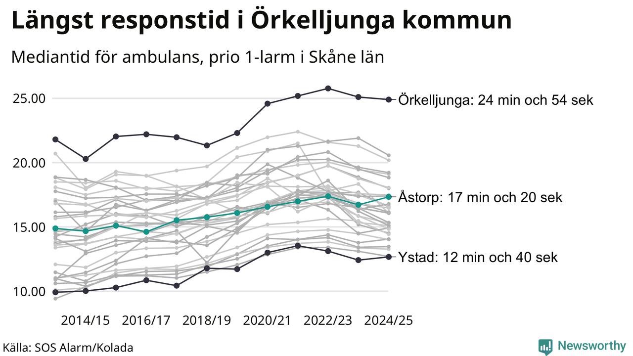 Det tar 17 minuter och 20 sekunder från att 112-samtalet når larmcentralen till att ambulansen är på plats i Åstorps kommun. Det visar de senaste siffrorna från SOS Alarm. Tiden är en mediantid för alla prio 1-larm mellan 1 juni 2024 och 31 maj 2025 och ett nyckeltal som redovisas varje år.