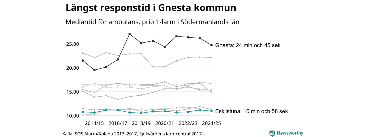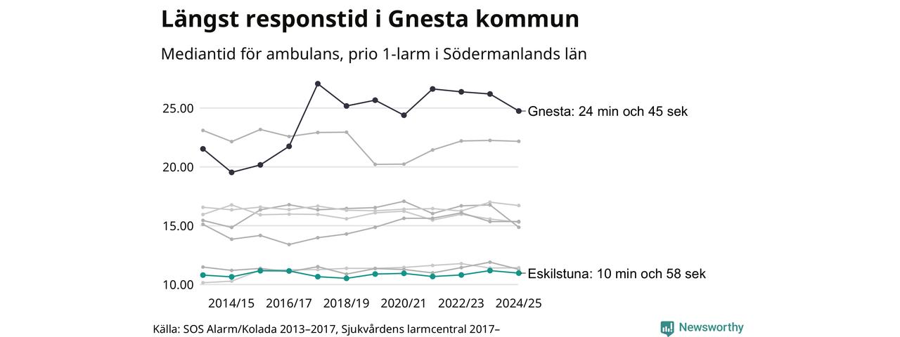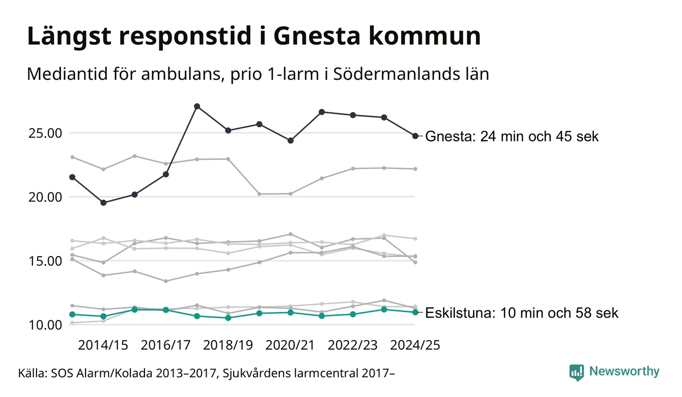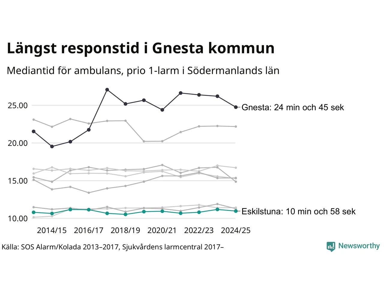 Bland kommunerna i Region Sörmland nåddes Eskilstuna snabbast av ambulans under 2024/2025. Längst är väntetiden i Gnesta kommun: 24 minuter och 45 sekunder. Där har väntetiden ändå kapats med 1 minut och 27 sekunder jämfört med året innan.