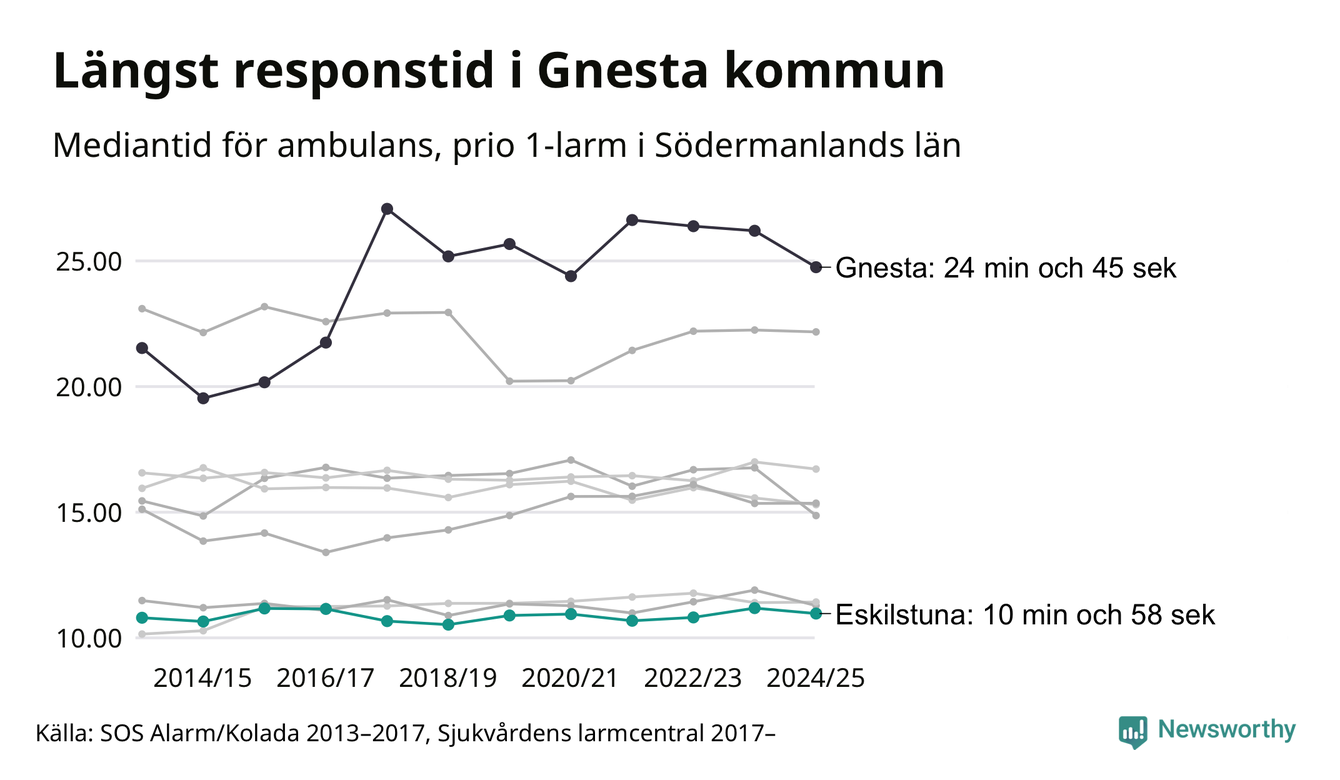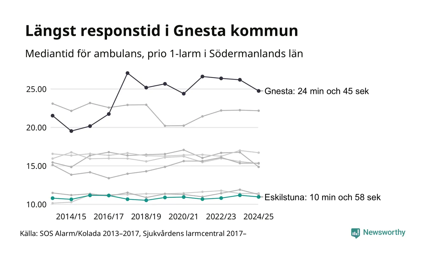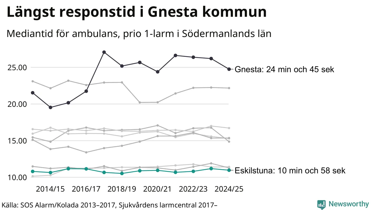 Bland kommunerna i Region Sörmland nåddes Eskilstuna snabbast av ambulans under 2024/2025. Längst är väntetiden i Gnesta kommun: 24 minuter och 45 sekunder. Där har väntetiden ändå kapats med 1 minut och 27 sekunder jämfört med året innan.