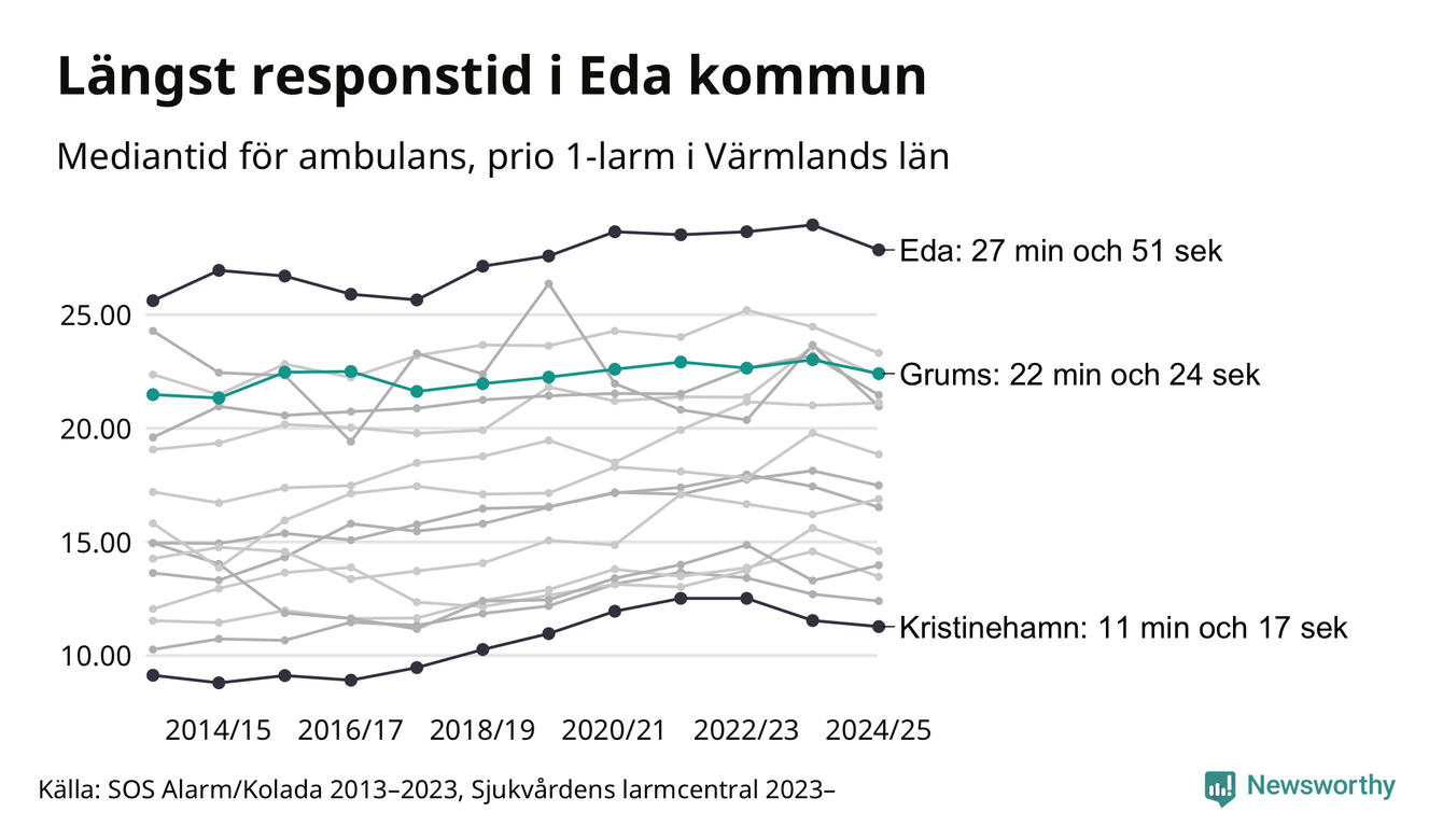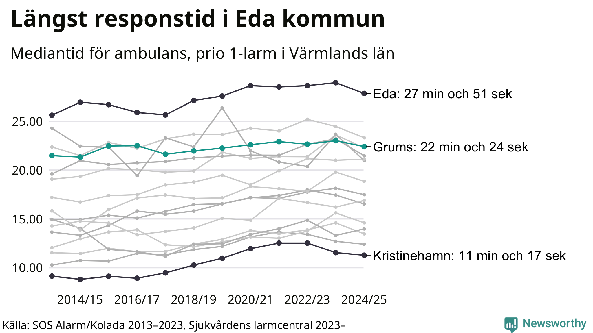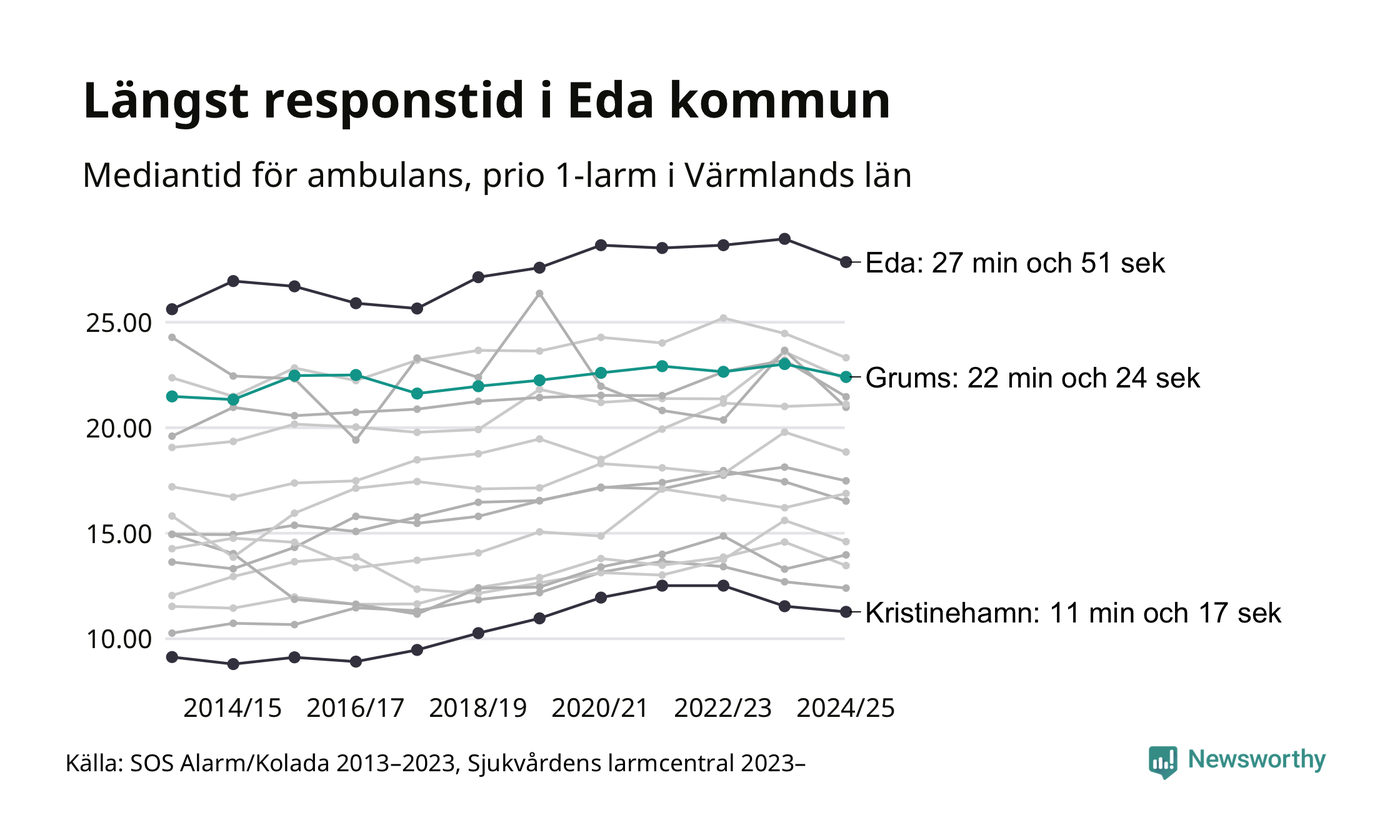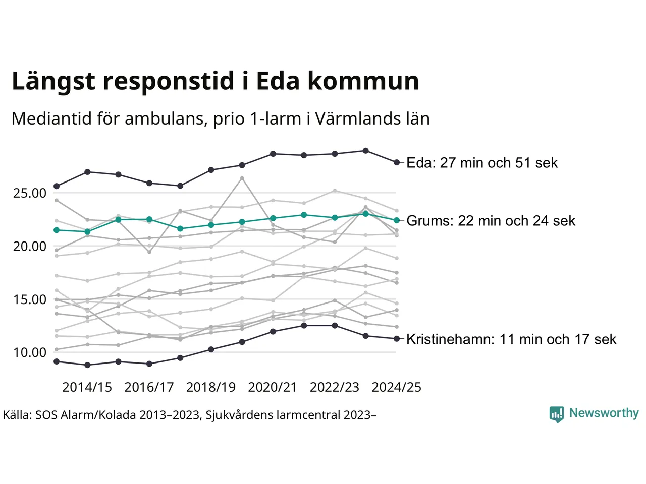 Eda är alltså en av de kommuner som får vänta längst på ambulans i landet. Längst är väntan på ambulans i Pajala kommun, 37 minuter och 55 sekunder. Kommunerna med längst responstid finns i Norrlands inland eller i glesbygd.