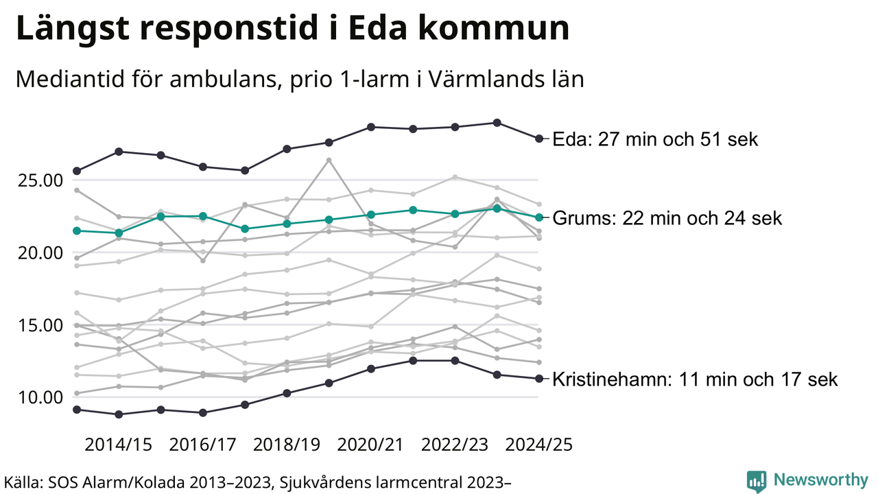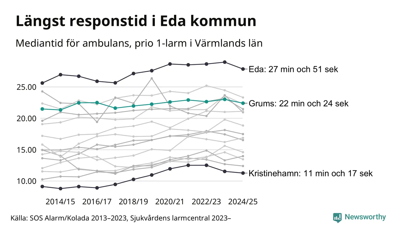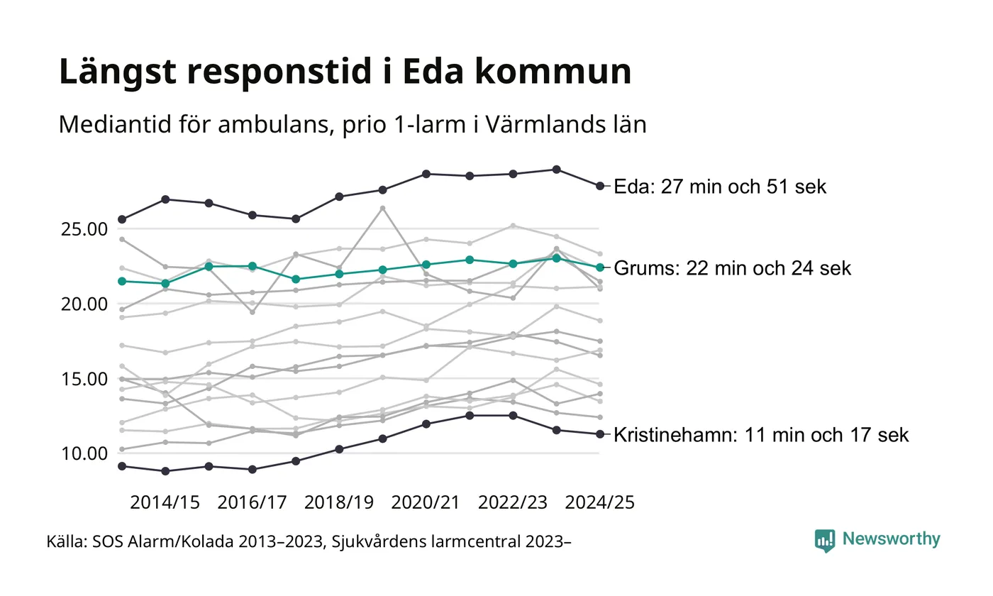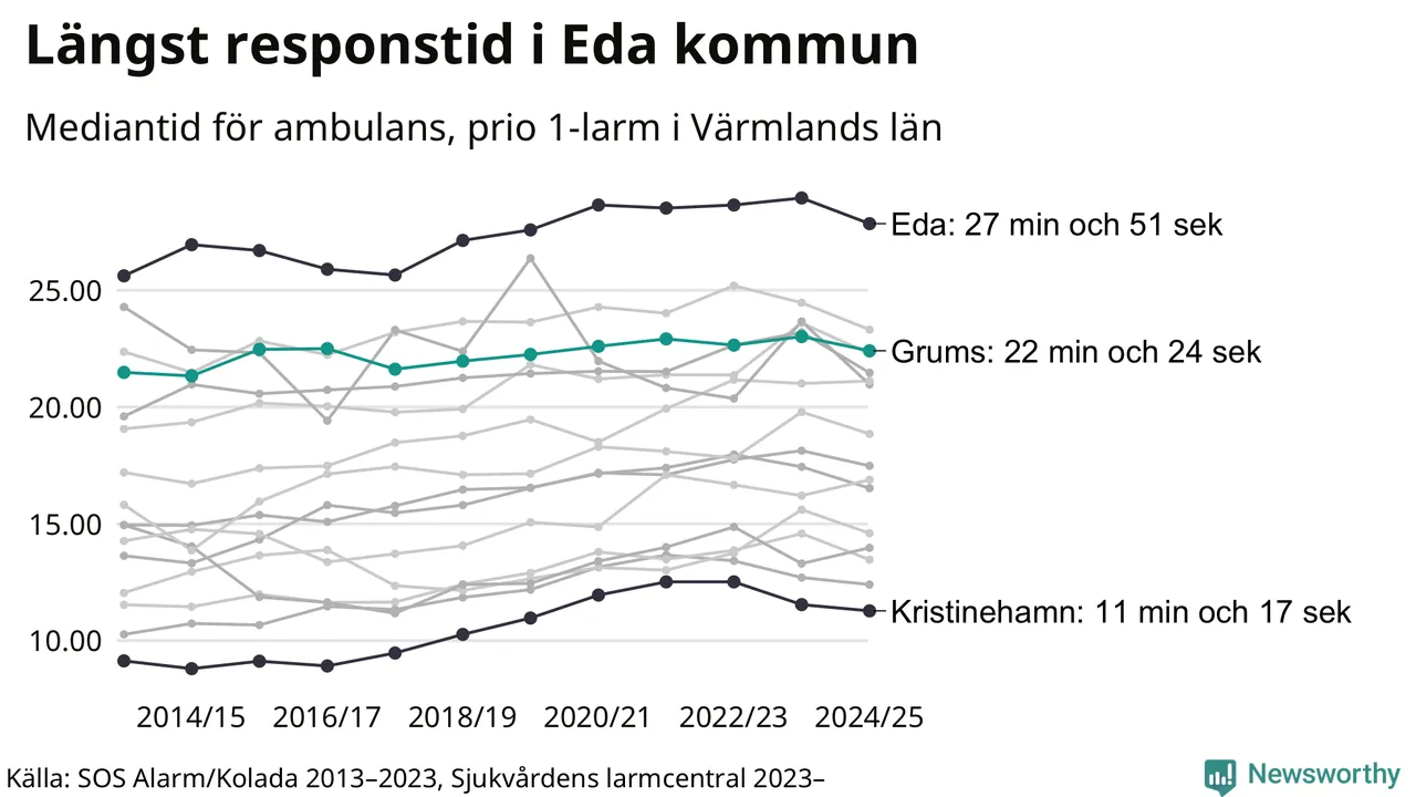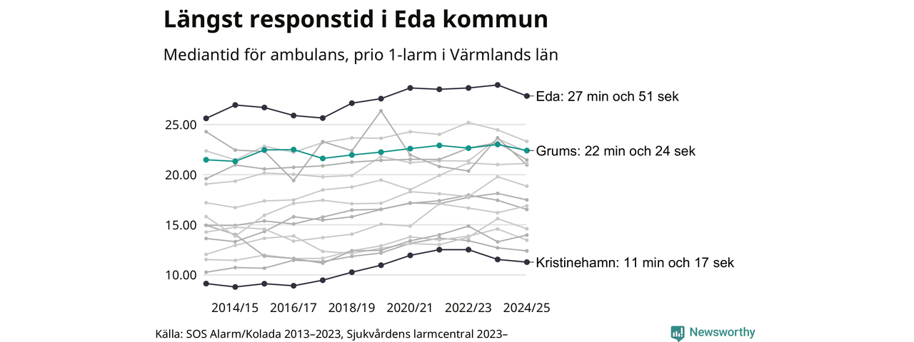 Grums tillhör de kommuner i Region Värmland som får vänta längst på ambulansen. Längst är väntetiden i Eda kommun, som också tillhör de tio kommuner i landet som får vänta längst på ambulans: 27 minuter och 51 sekunder. Snabbast var ambulansen framme i Kristinehamn, där det tog 11 minuter och 17 sekunder från larmsamtalet 2024/2025.