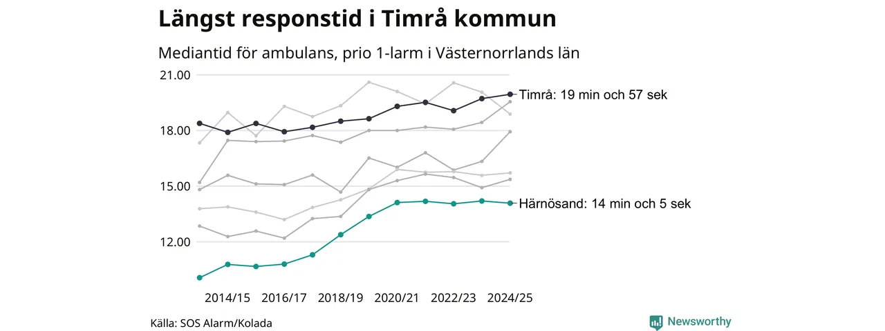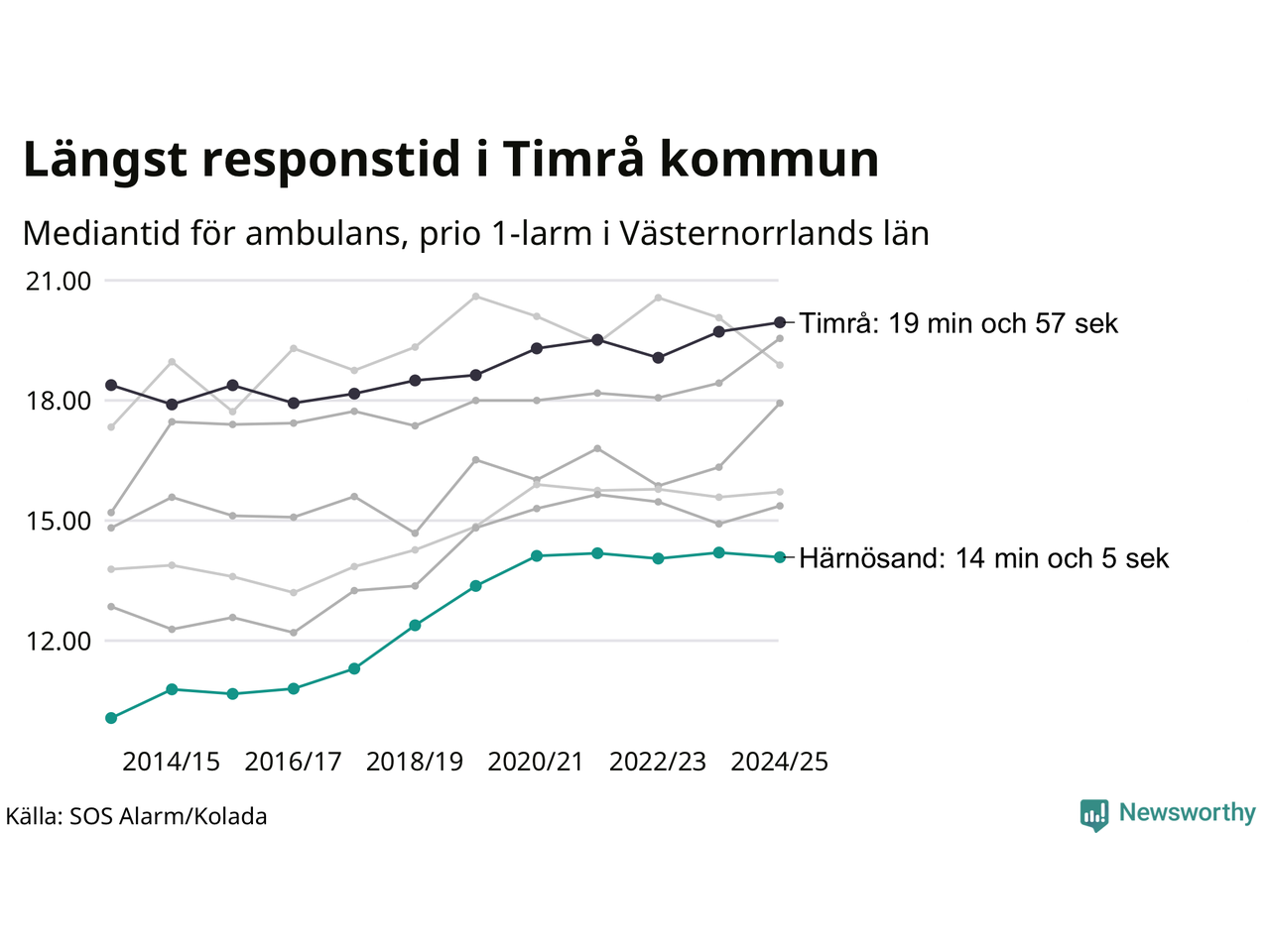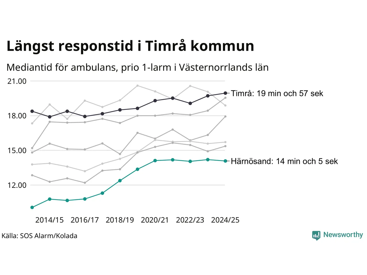 Även om väntan i Timrå är lång för att vara Region Västernorrland krävs ytterligare 5 minuter och 9 sekunder för att ta sig in på topp tiolistan över kommuerna i landet med längst väntetid. Längst är väntan på ambulans i Pajala kommun, 37 minuter och 55 sekunder. Kommunerna med längst responstid finns i Norrlands inland eller i glesbygd.