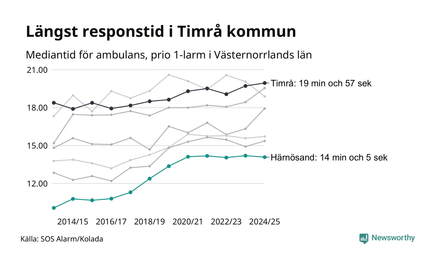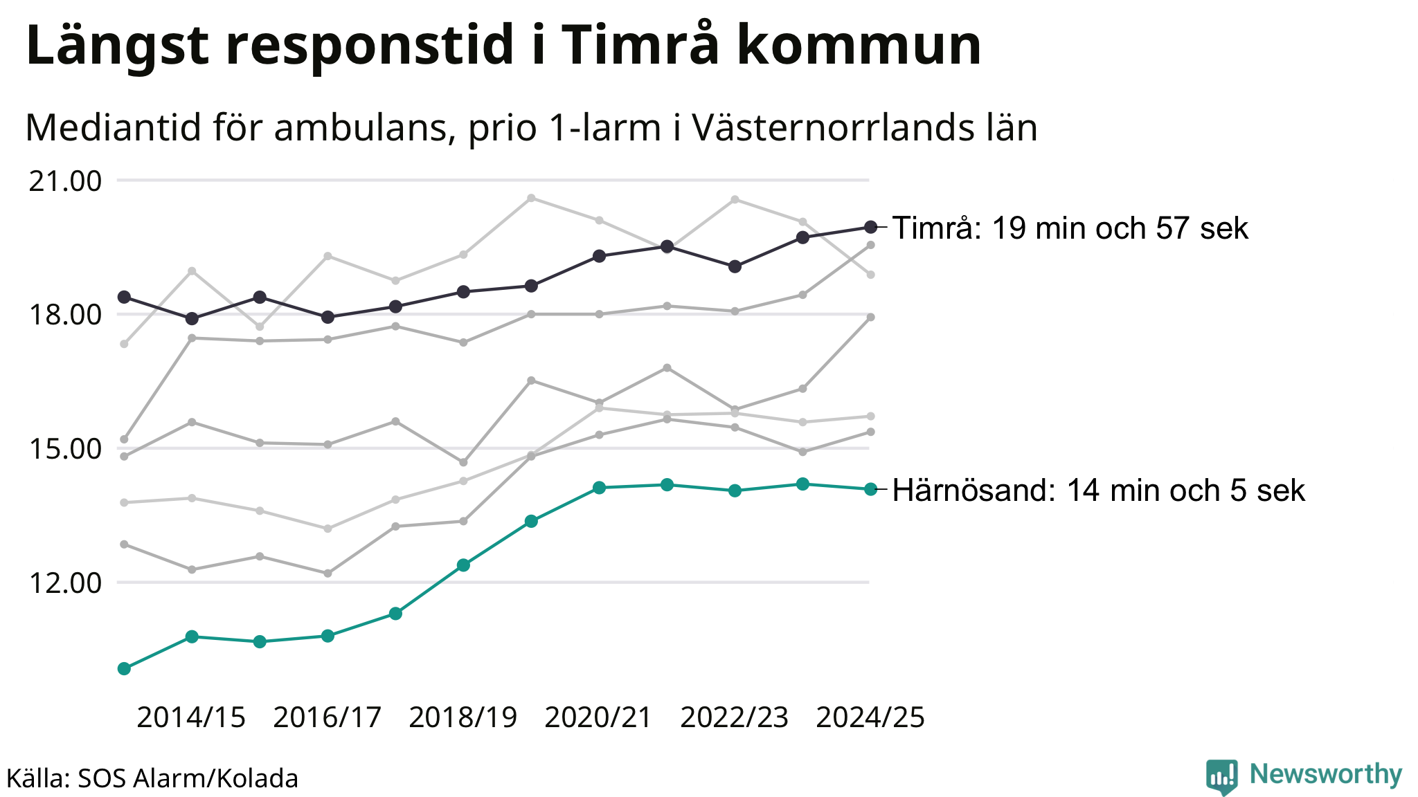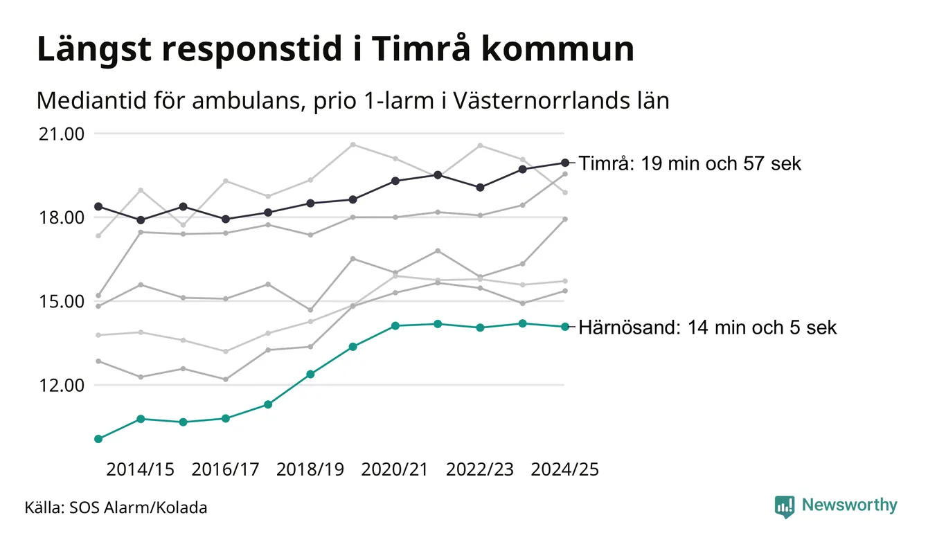 Även om väntan i Timrå är lång för att vara Region Västernorrland krävs ytterligare 5 minuter och 9 sekunder för att ta sig in på topp tiolistan över kommuerna i landet med längst väntetid. Längst är väntan på ambulans i Pajala kommun, 37 minuter och 55 sekunder. Kommunerna med längst responstid finns i Norrlands inland eller i glesbygd.