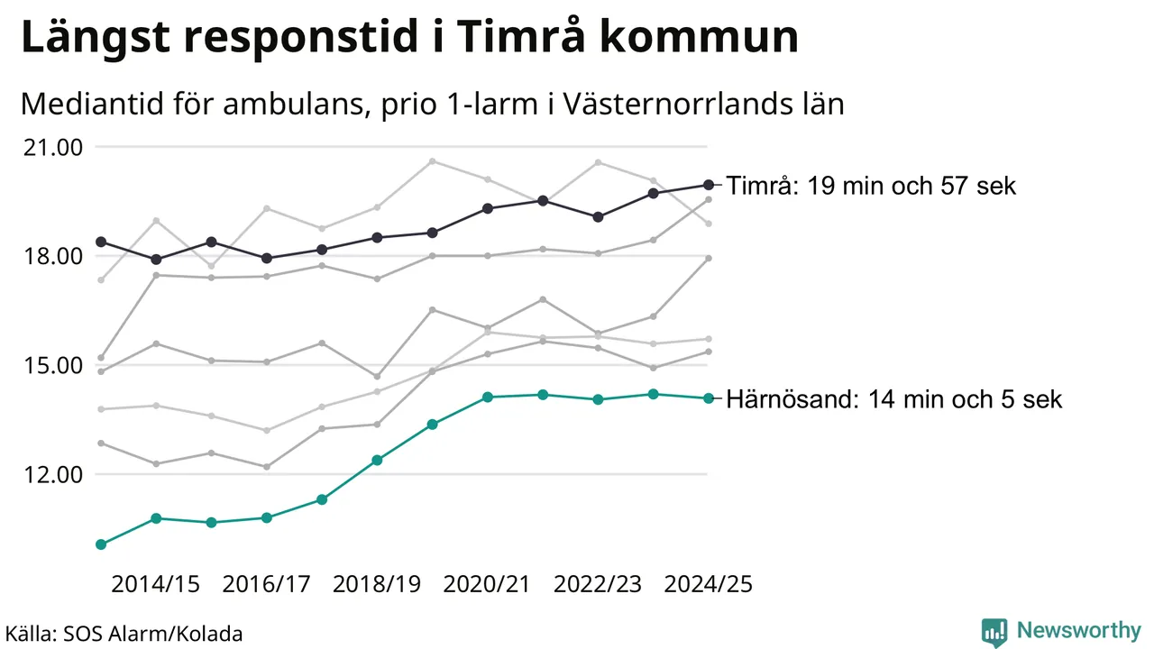 Bland kommunerna i Region Västernorrland nåddes Härnösand snabbast av ambulans under 2024/2025. Längst är väntetiden i Timrå kommun: 19 minuter och 57 sekunder.