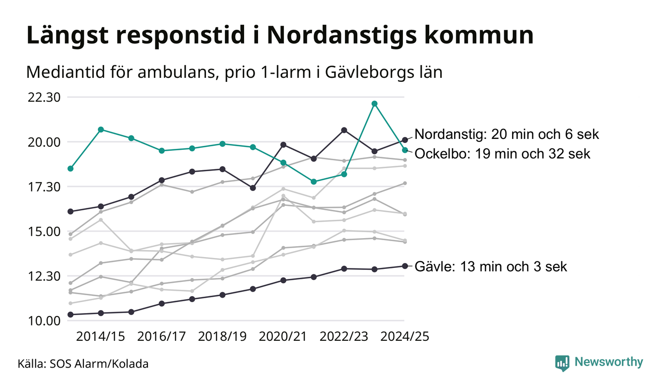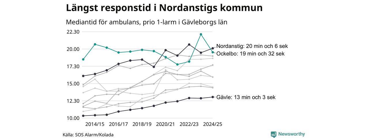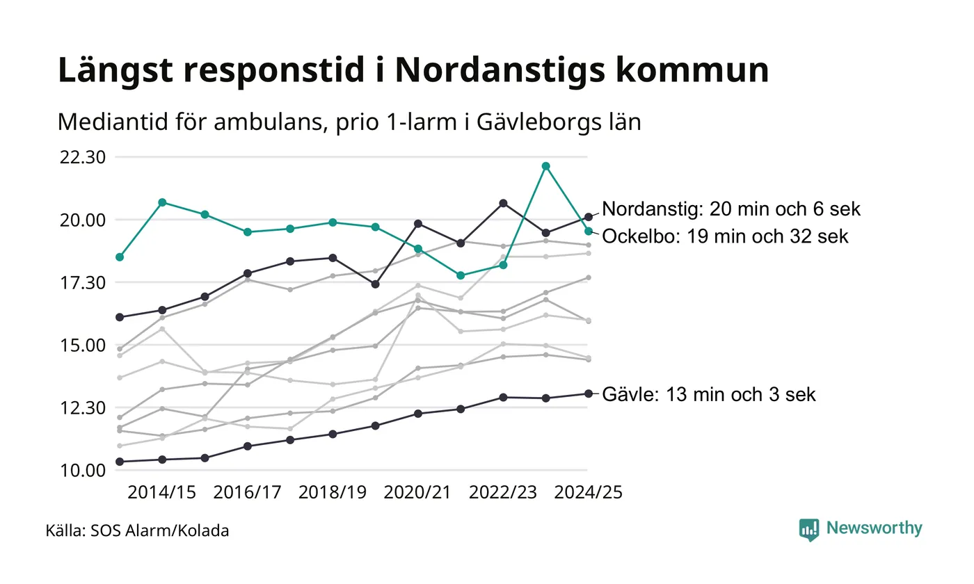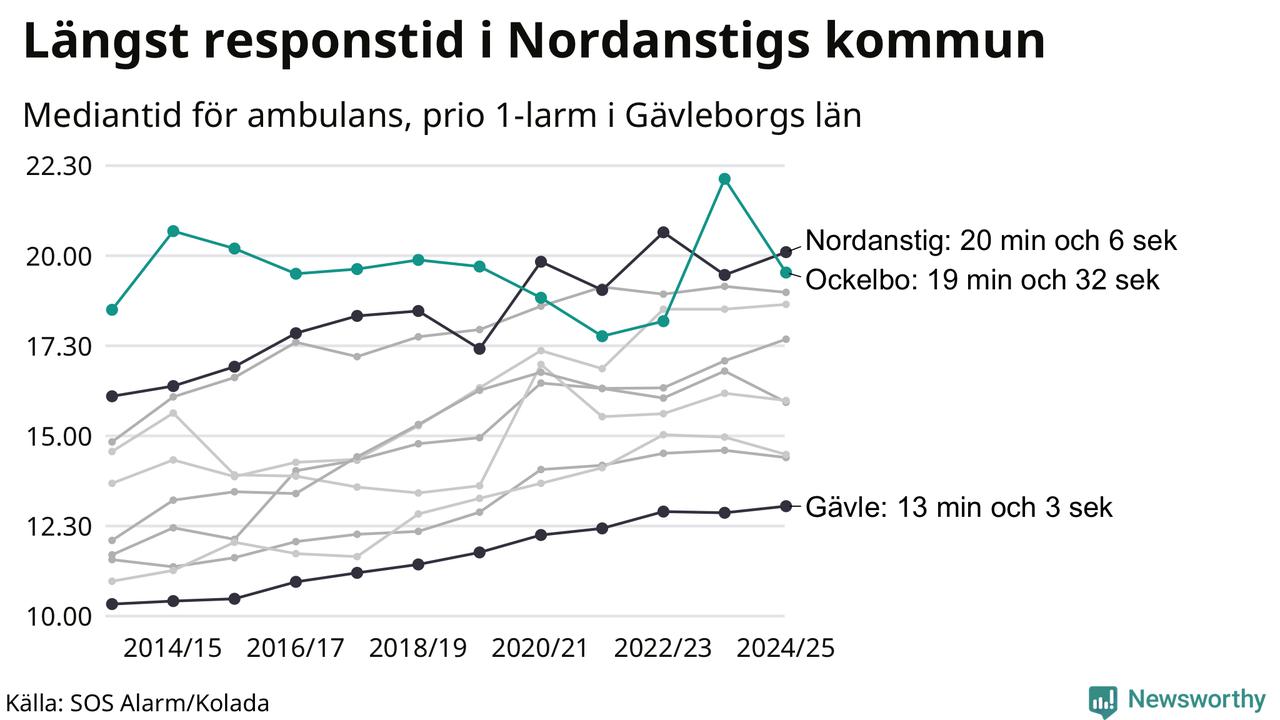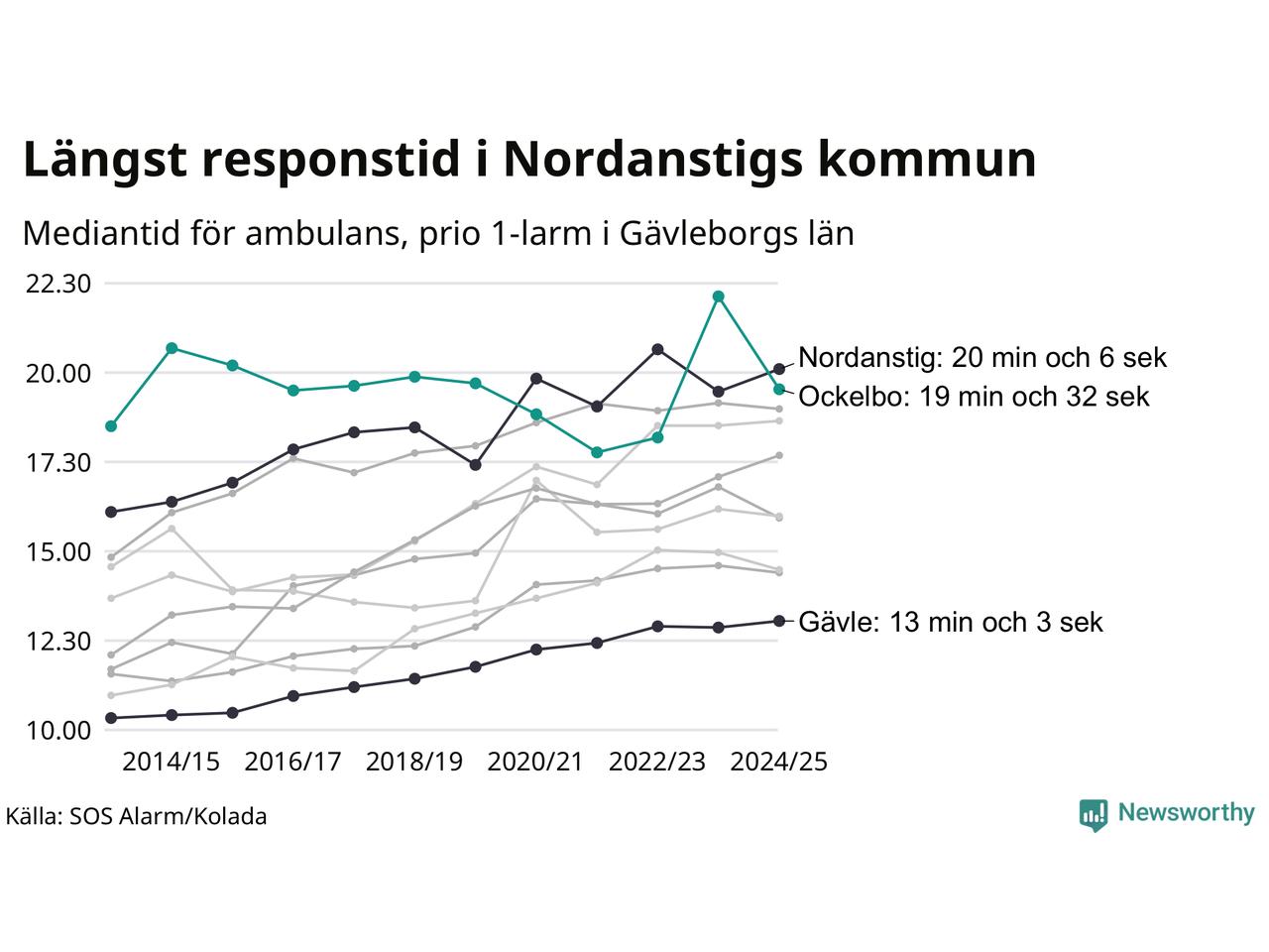 Det tar 19 minuter och 32 sekunder från att 112-samtalet når larmcentralen till att ambulansen är på plats i Ockelbo kommun. Det visar de senaste siffrorna från SOS Alarm. Tiden är en mediantid för alla prio 1-larm mellan 1 juni 2024 och 31 maj 2025 och ett nyckeltal som redovisas varje år.