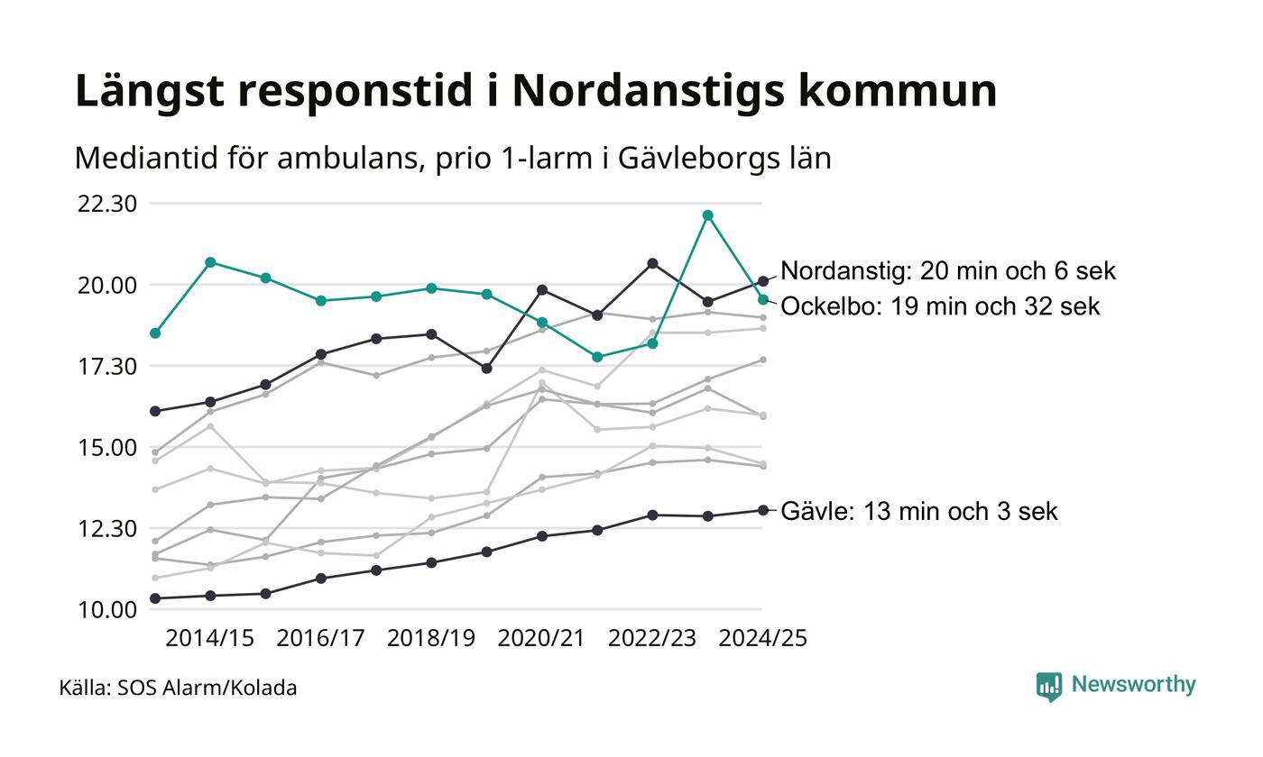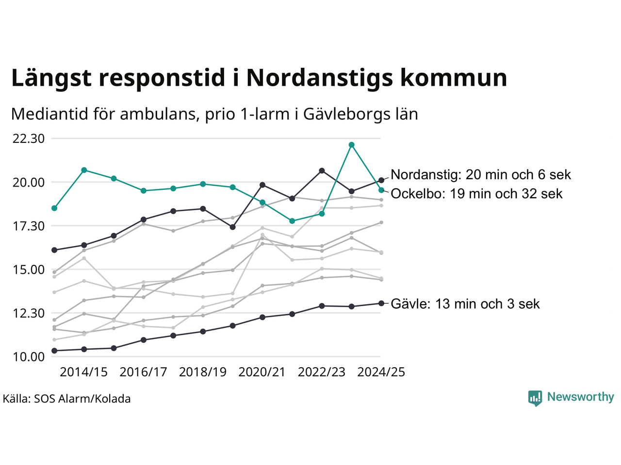 Även om väntan i Nordanstig är lång för att vara Region Gävleborg krävs ytterligare 5 minuter för att ta sig in på topp tiolistan över kommuerna i landet med längst väntetid. Längst är väntan på ambulans i Pajala kommun, 37 minuter och 55 sekunder. Kommunerna med längst responstid finns i Norrlands inland eller i glesbygd.
