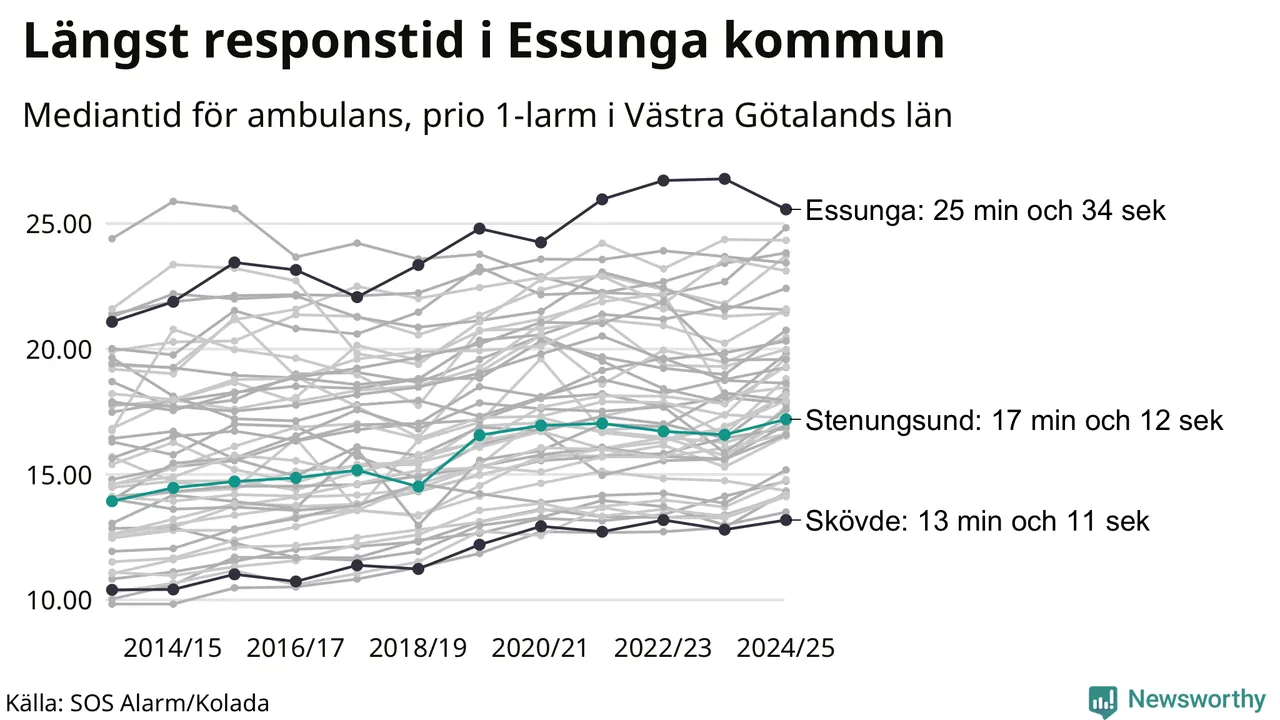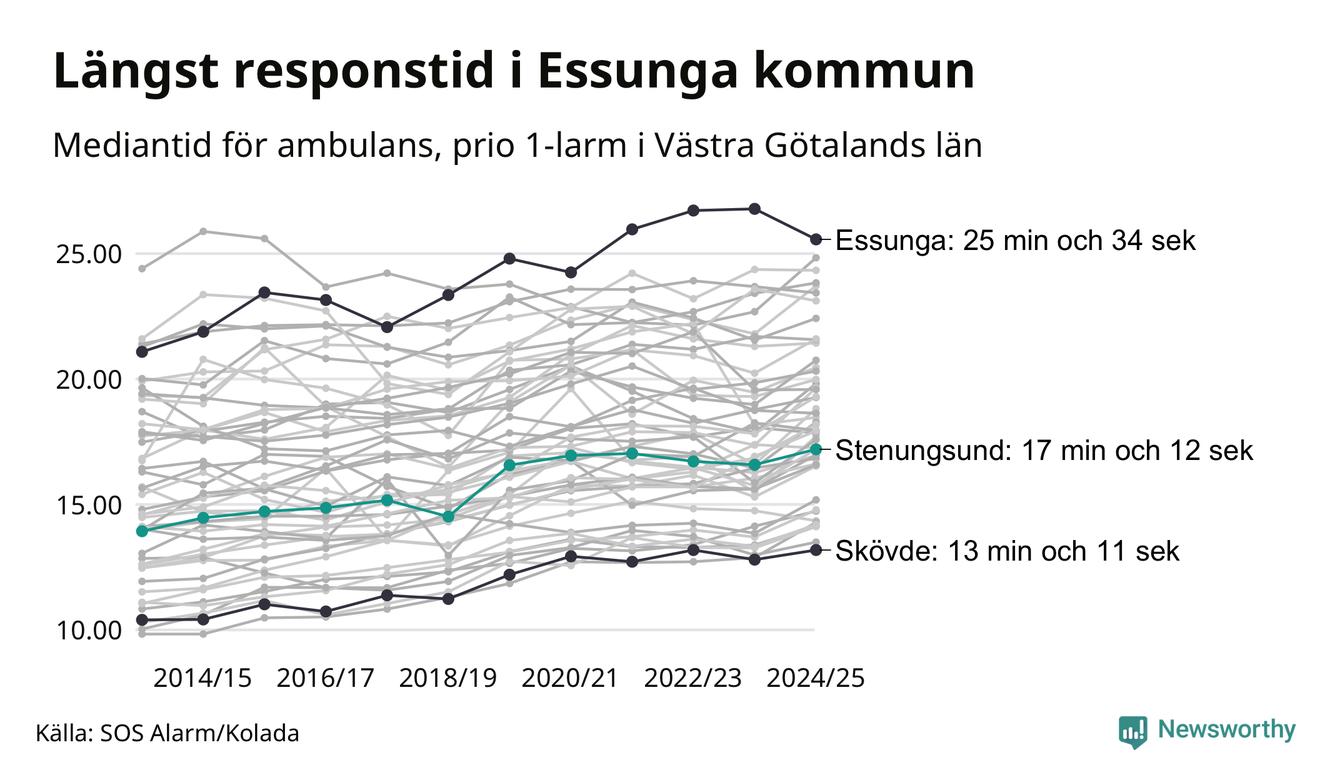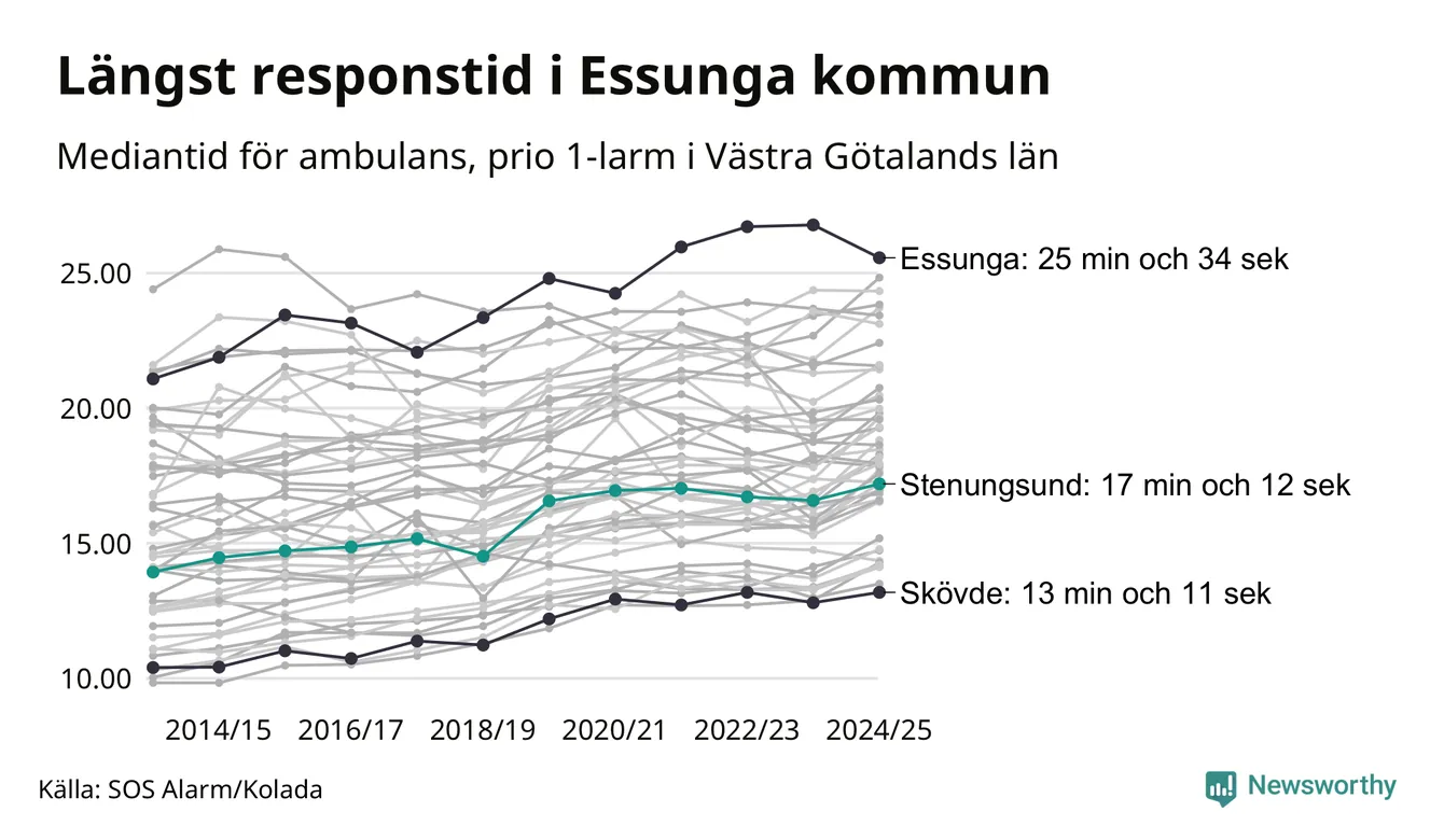 Essunga är alltså en av de kommuner som får vänta längst på ambulans i landet. Längst är väntan på ambulans i Pajala kommun, 37 minuter och 55 sekunder. Kommunerna med längst responstid finns i Norrlands inland eller i glesbygd.