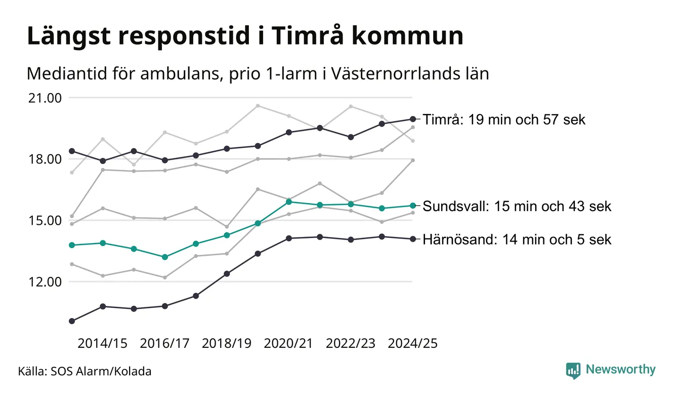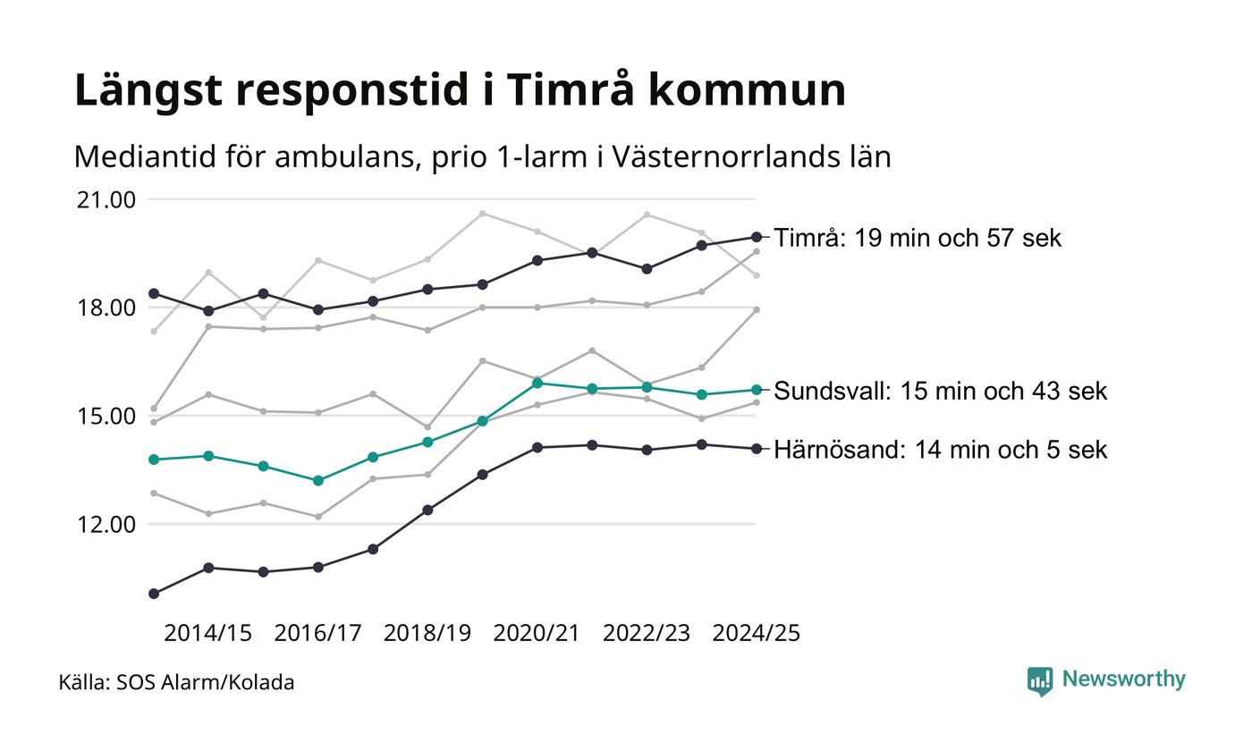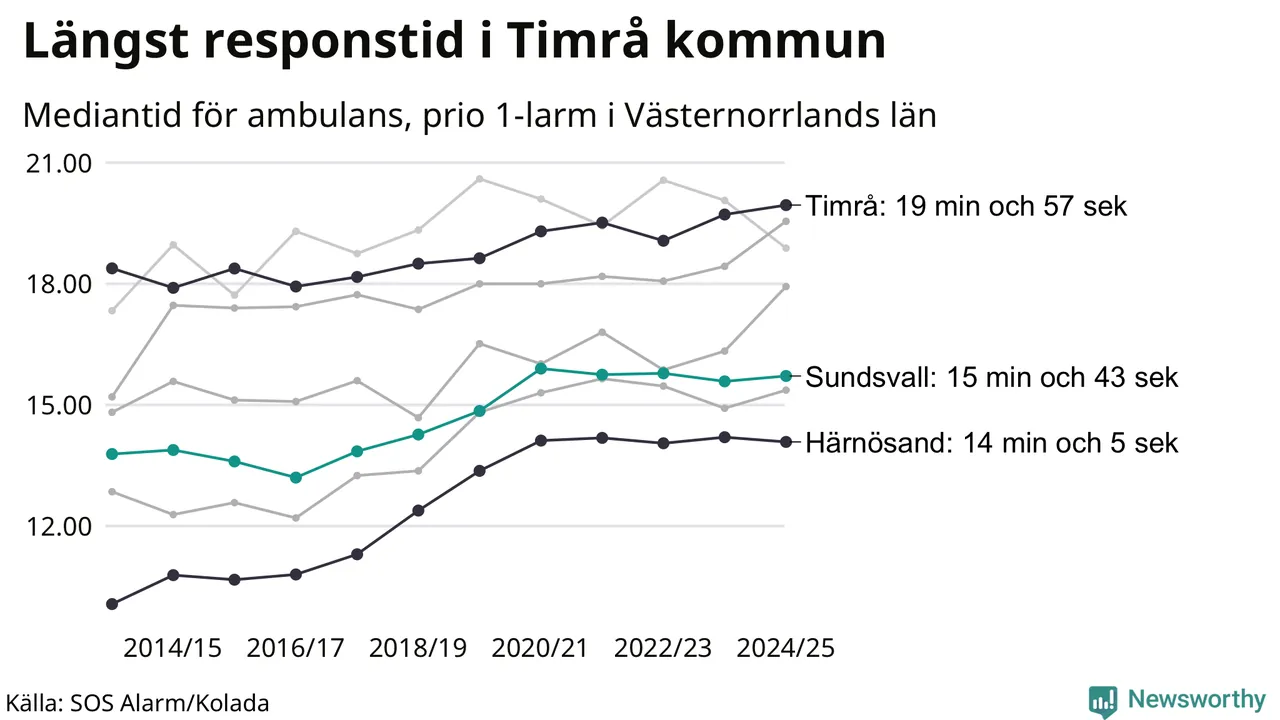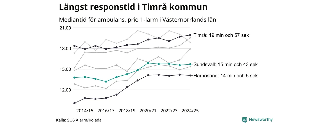 Sundsvall tillhör inte de kommuner i Region Västernorrland som får vänta längst på ambulans – men inte heller de som får snabbast hjälp. Längst är väntetiden i Timrå kommun: 19 minuter och 57 sekunder. Snabbast var ambulansen framme i Härnösand, där det tog 14 minuter och 5 sekunder från larmsamtalet 2024/2025.