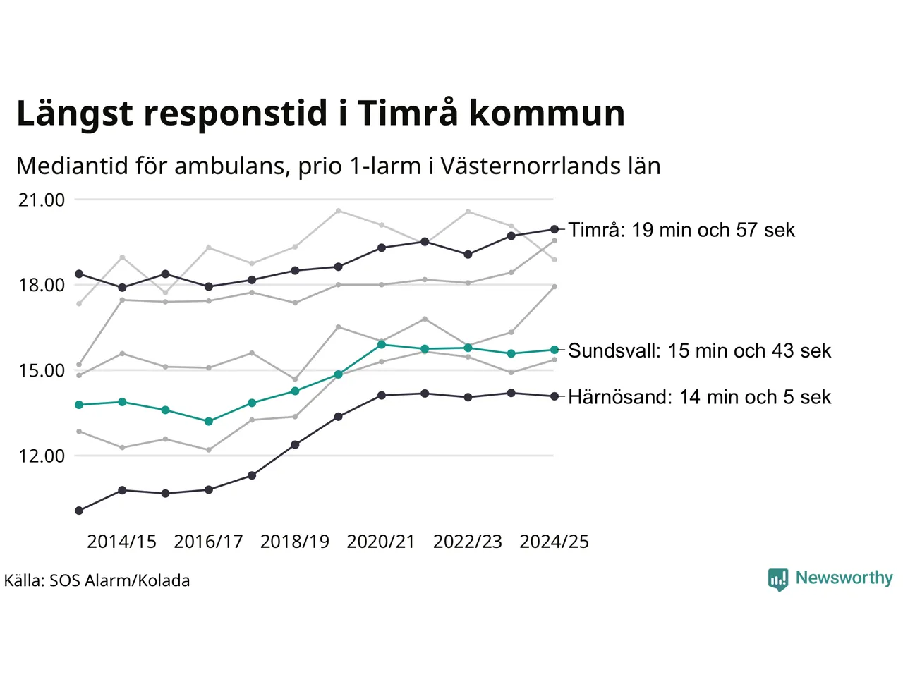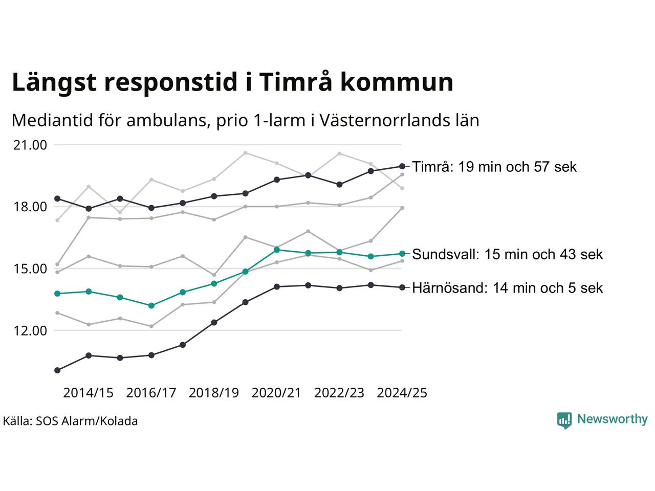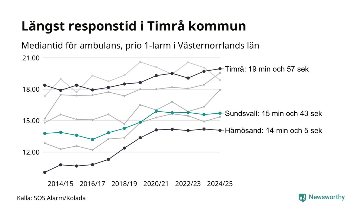 Även om väntan i Timrå är lång för att vara Region Västernorrland krävs ytterligare 5 minuter och 9 sekunder för att ta sig in på topp tiolistan över kommuerna i landet med längst väntetid. Längst är väntan på ambulans i Pajala kommun, 37 minuter och 55 sekunder. Kommunerna med längst responstid finns i Norrlands inland eller i glesbygd.