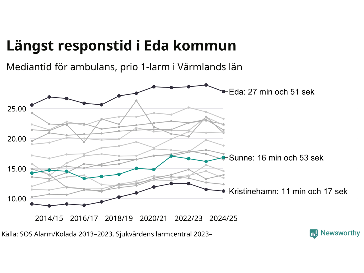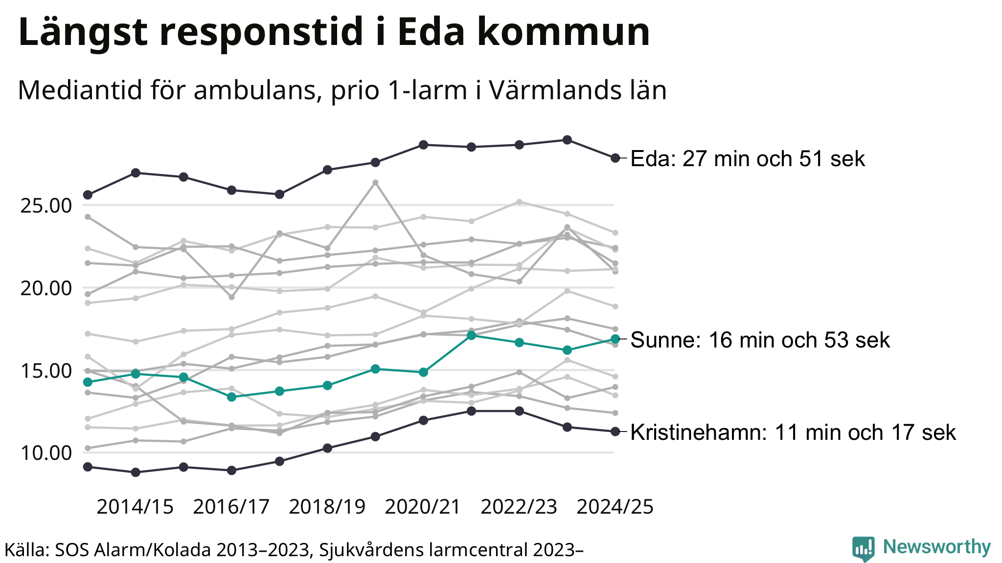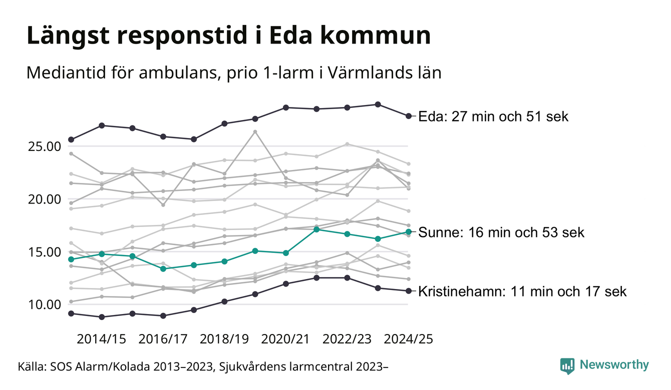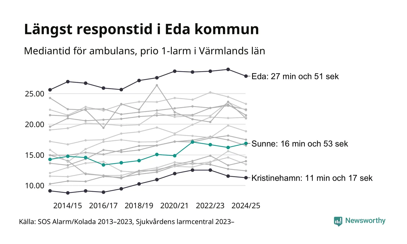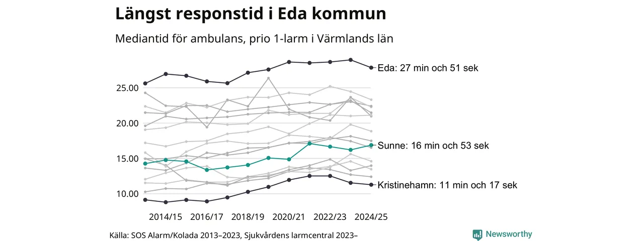Sunne tillhör inte de kommuner i Region Värmland som får vänta längst på ambulans – men inte heller de som får snabbast hjälp. Längst är väntetiden i Eda kommun, som också tillhör de tio kommuner i landet som får vänta längst på ambulans: 27 minuter och 51 sekunder. Snabbast var ambulansen framme i Kristinehamn, där det tog 11 minuter och 17 sekunder från larmsamtalet 2024/2025.