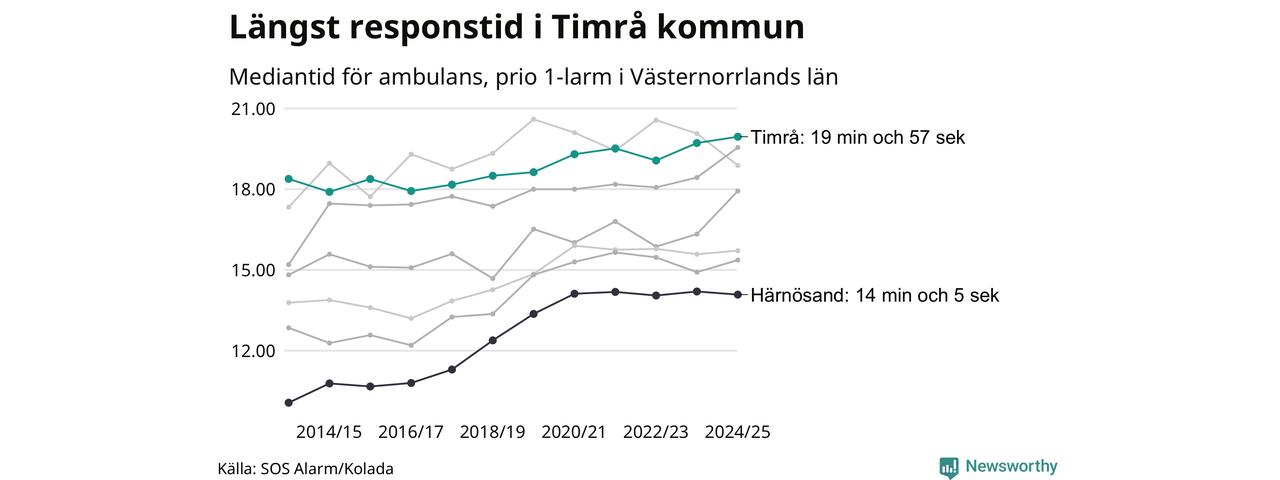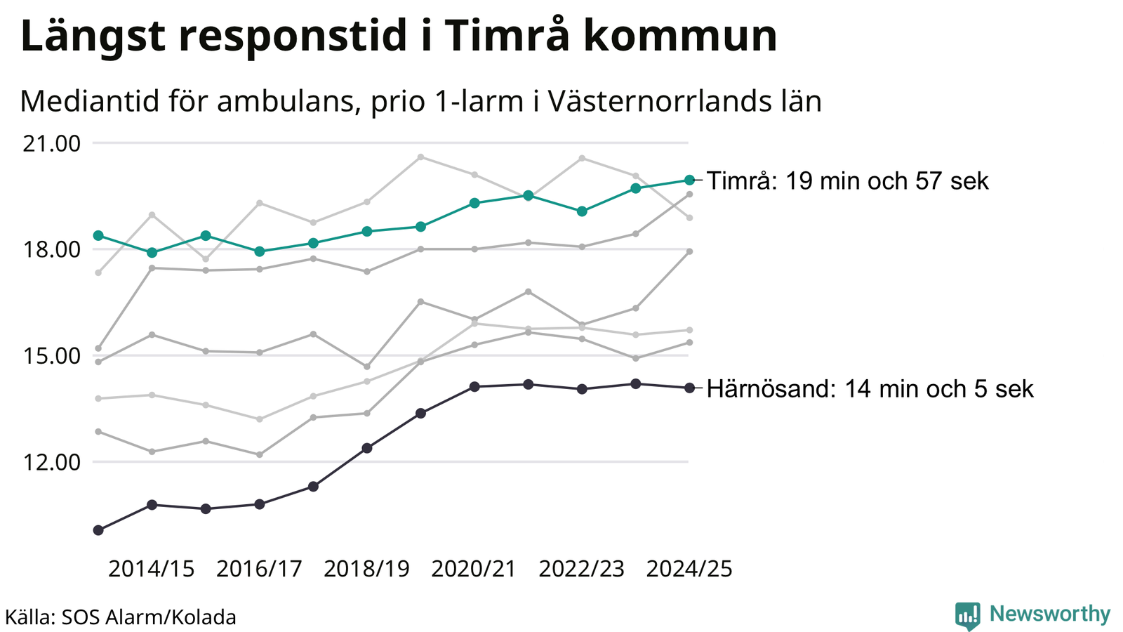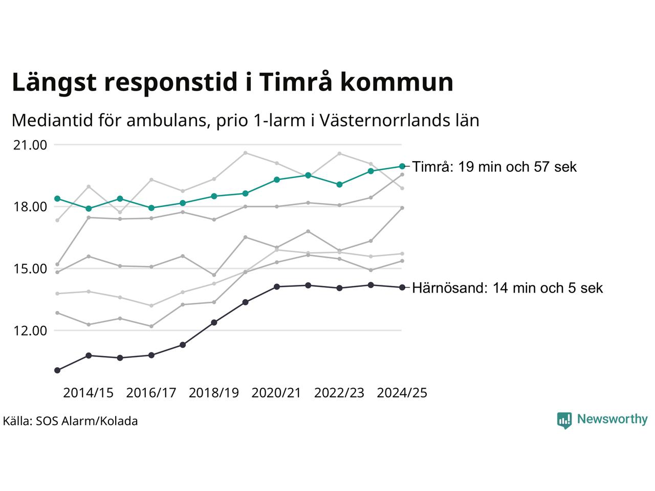 Det tar 19 minuter och 57 sekunder från att 112-samtalet når larmcentralen till att ambulansen är på plats i Timrå kommun. Det visar de senaste siffrorna från SOS Alarm. Tiden är en mediantid för alla prio 1-larm mellan 1 juni 2024 och 31 maj 2025 och ett nyckeltal som redovisas varje år.
