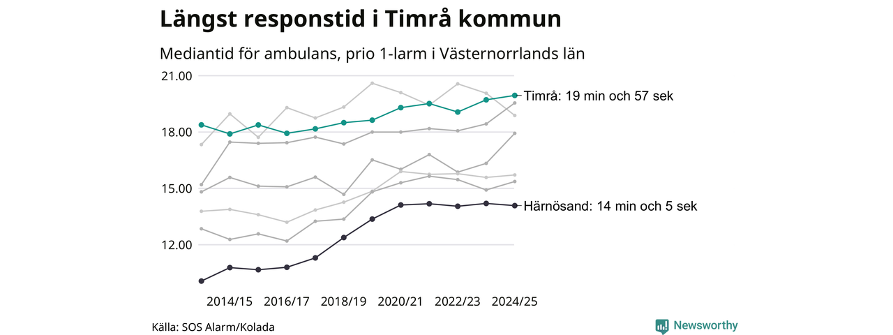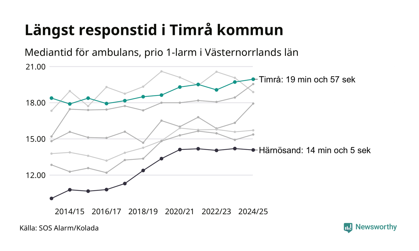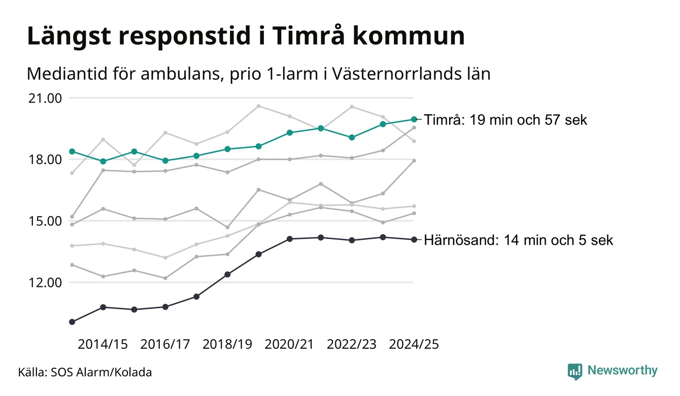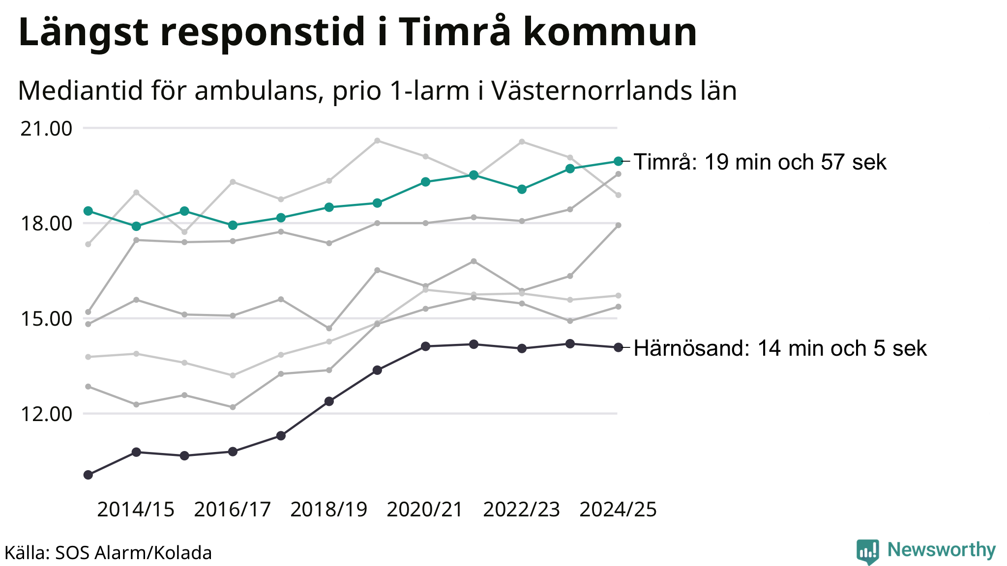 Det tar 19 minuter och 57 sekunder från att 112-samtalet når larmcentralen till att ambulansen är på plats i Timrå kommun. Det visar de senaste siffrorna från SOS Alarm. Tiden är en mediantid för alla prio 1-larm mellan 1 juni 2024 och 31 maj 2025 och ett nyckeltal som redovisas varje år.