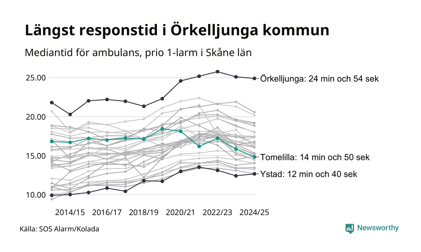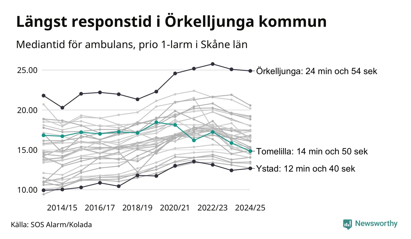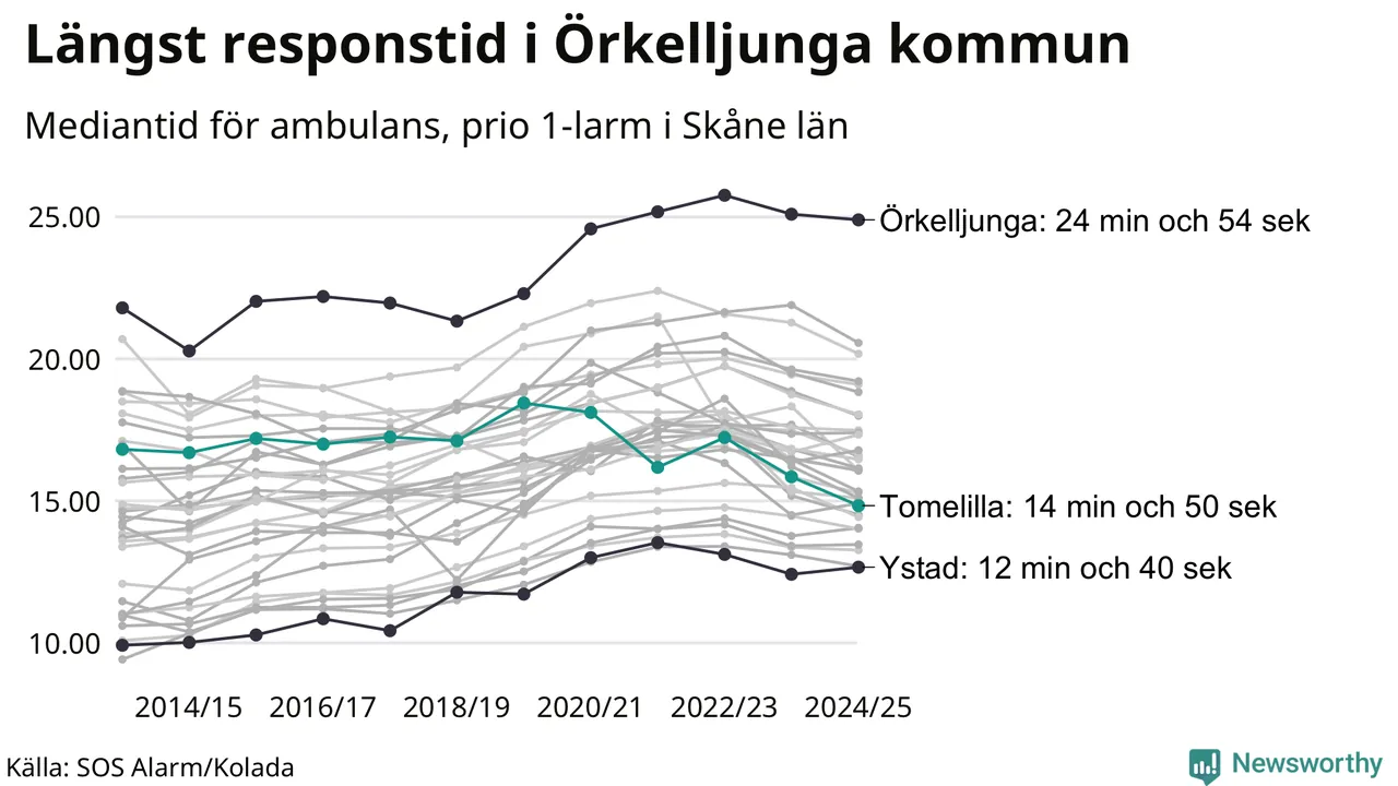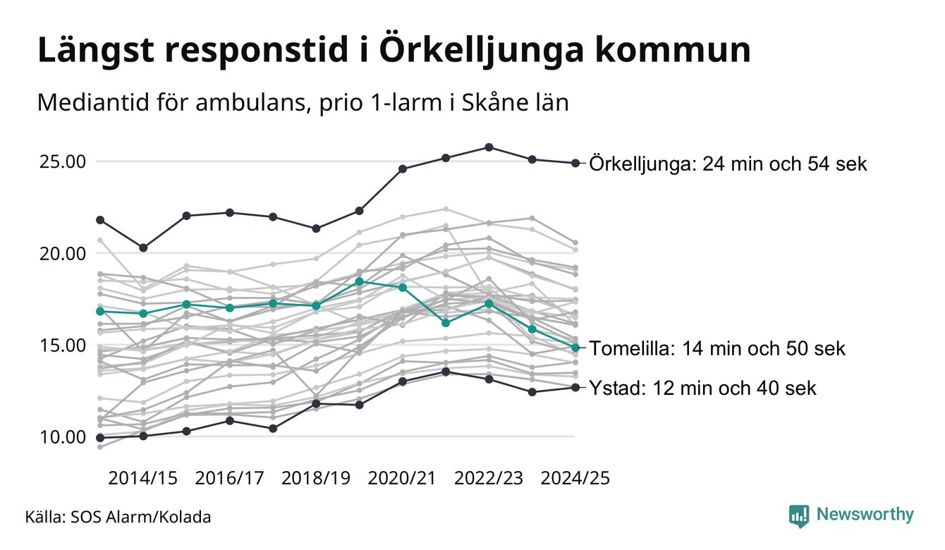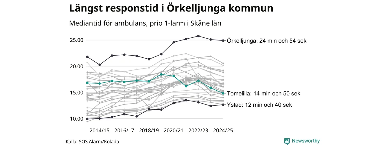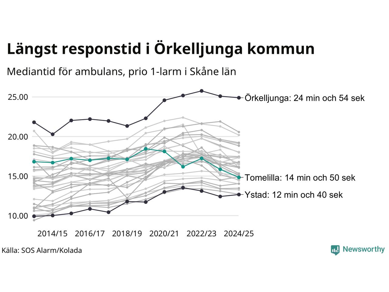 Det tar 14 minuter och 50 sekunder från att 112-samtalet når larmcentralen till att ambulansen är på plats i Tomelilla kommun. Det visar de senaste siffrorna från SOS Alarm. Tiden är en mediantid för alla prio 1-larm mellan 1 juni 2024 och 31 maj 2025 och ett nyckeltal som redovisas varje år.