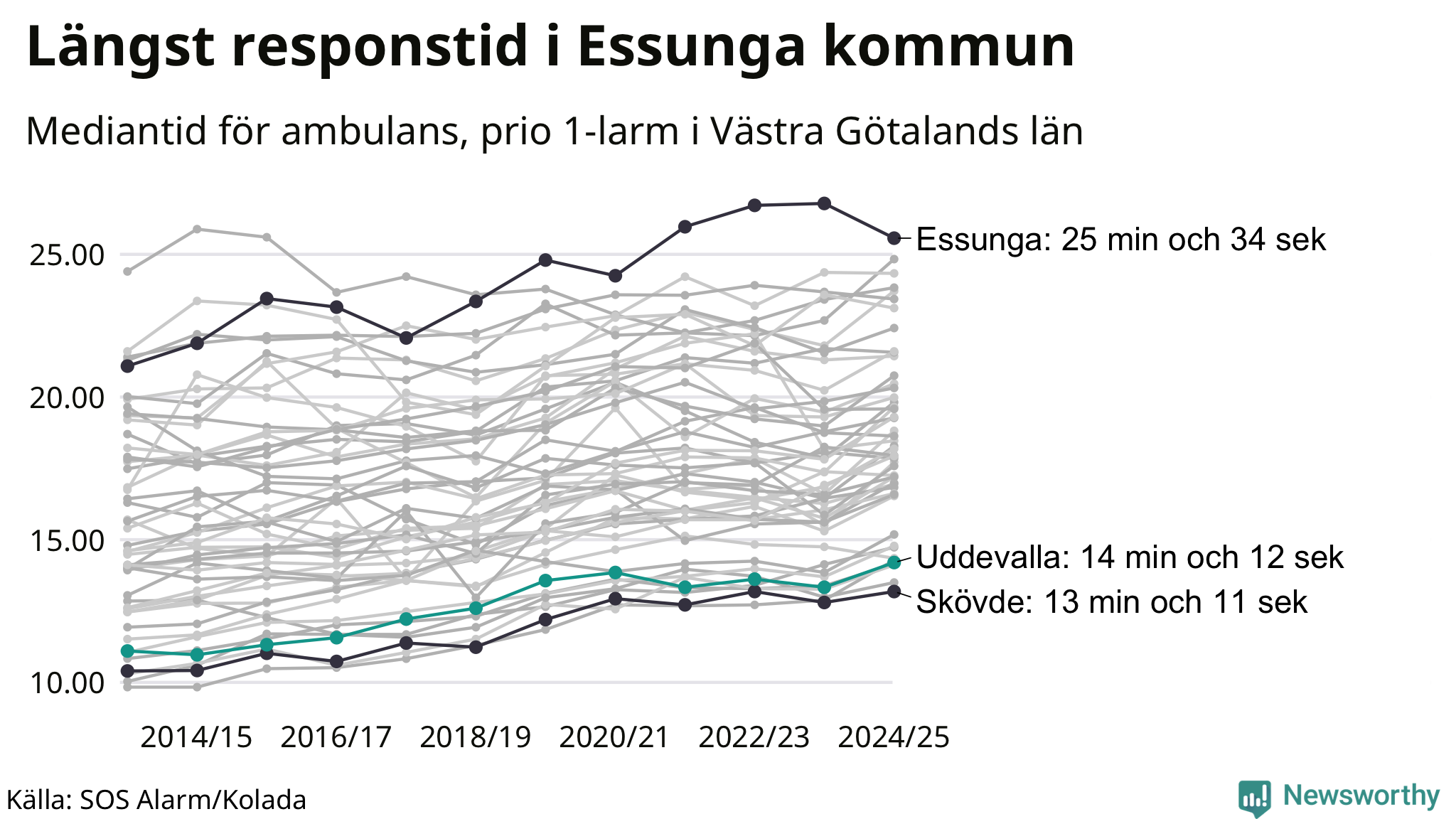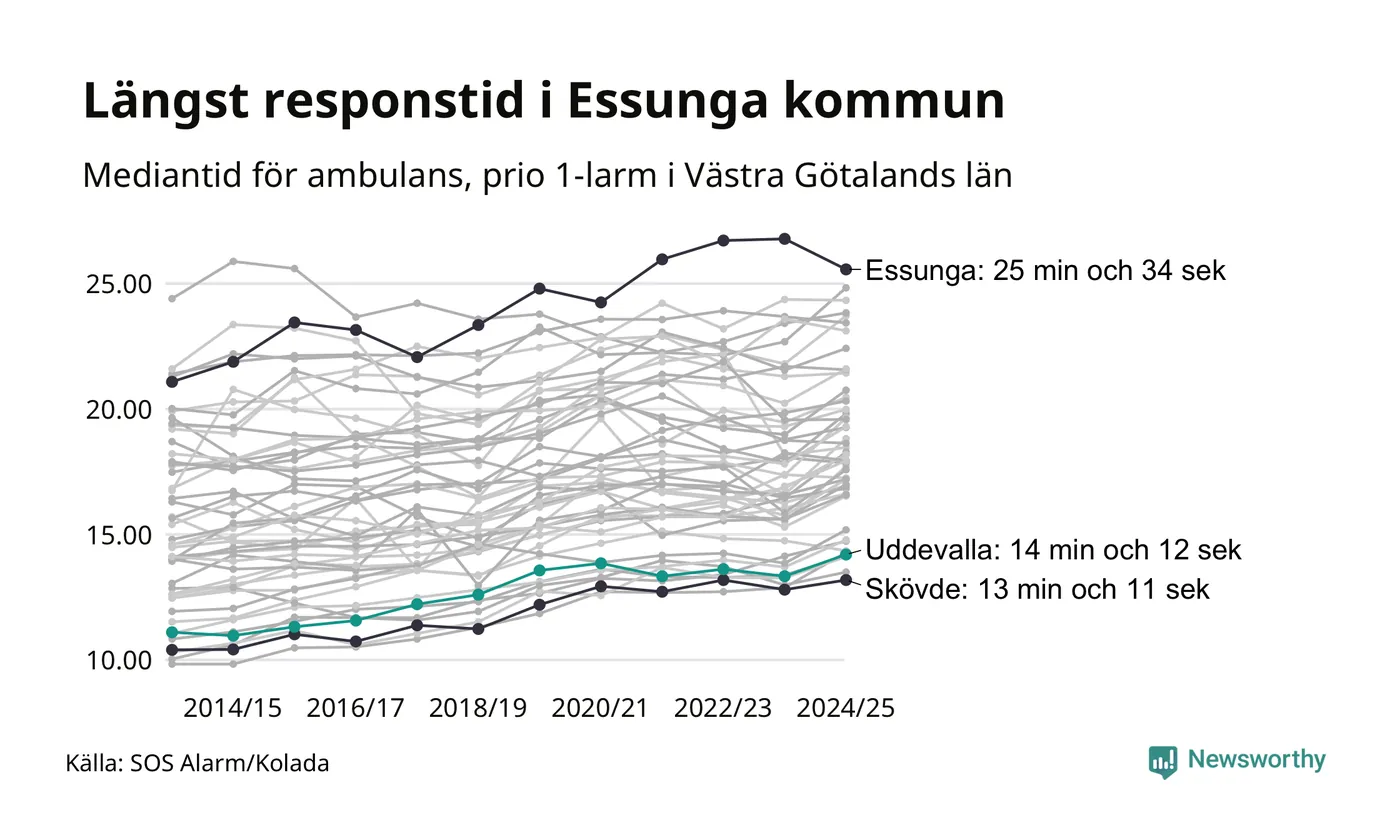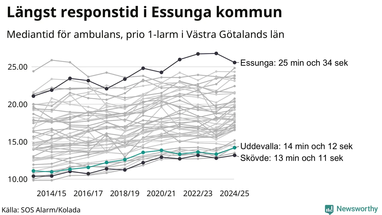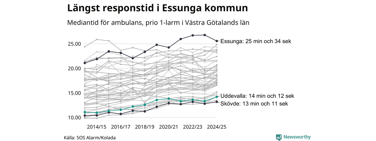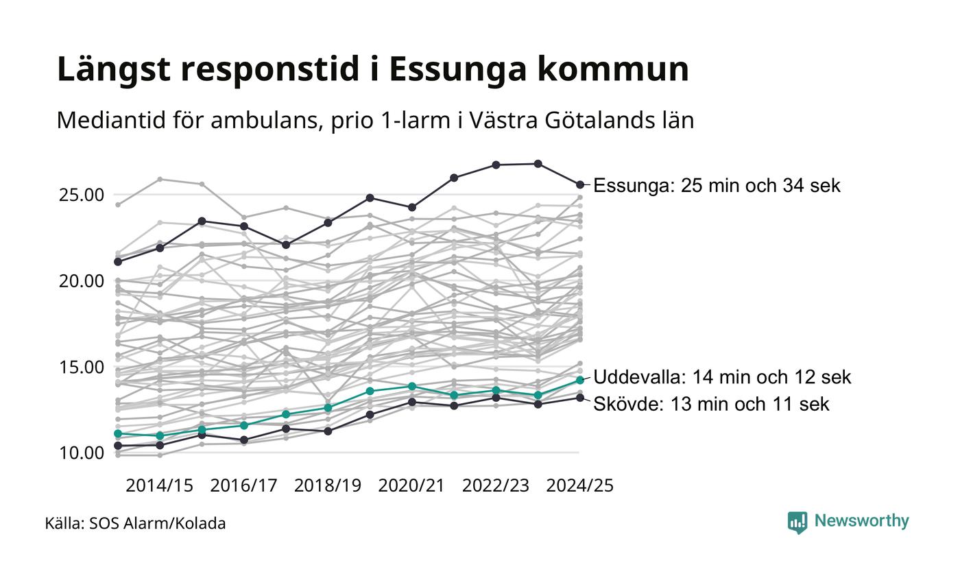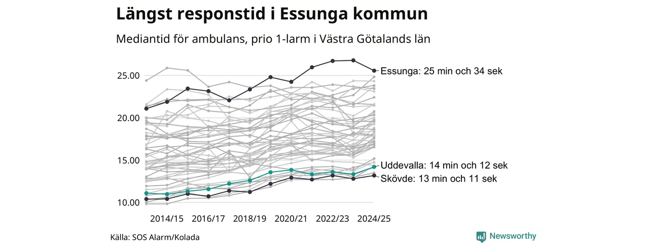 Essunga är alltså en av de kommuner som får vänta längst på ambulans i landet. Längst är väntan på ambulans i Pajala kommun, 37 minuter och 55 sekunder. Kommunerna med längst responstid finns i Norrlands inland eller i glesbygd.