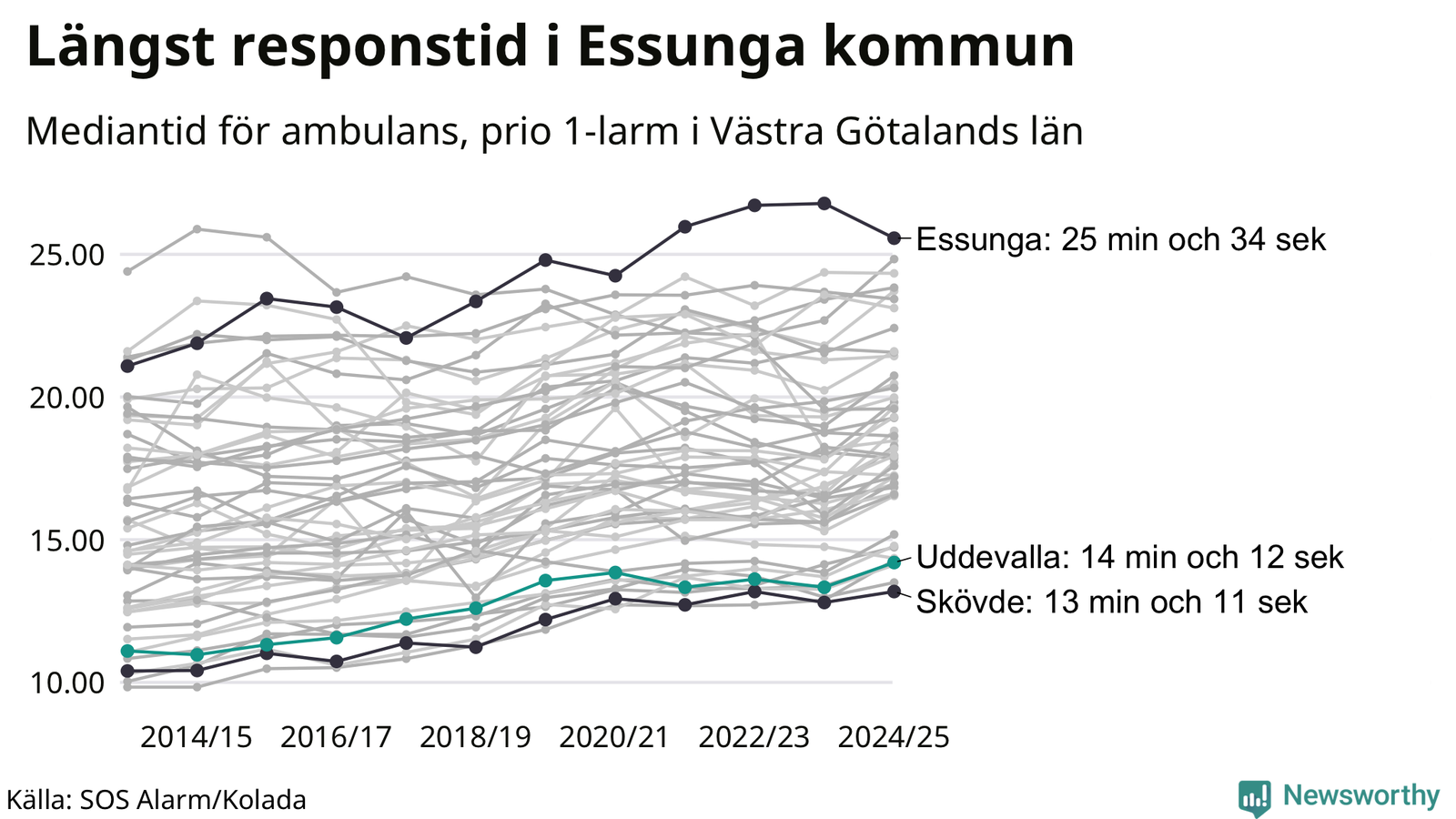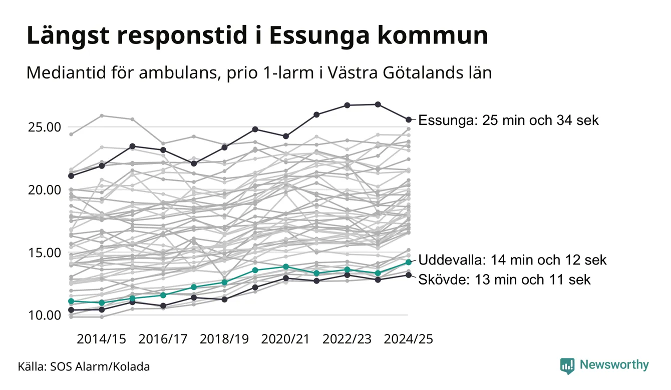 Men Uddevalla tillhör inte de kommuner i Västra Götalandsregionen som får vänta längst på ambulans – tvärt om. Längst är väntetiden i Essunga kommun, som också tillhör de tio kommuner i landet som får vänta längst på ambulans: 25 minuter och 34 sekunder. Snabbast var ambulansen framme i Skövde, där det tog 13 minuter och 11 sekunder från larmsamtalet 2024/2025.