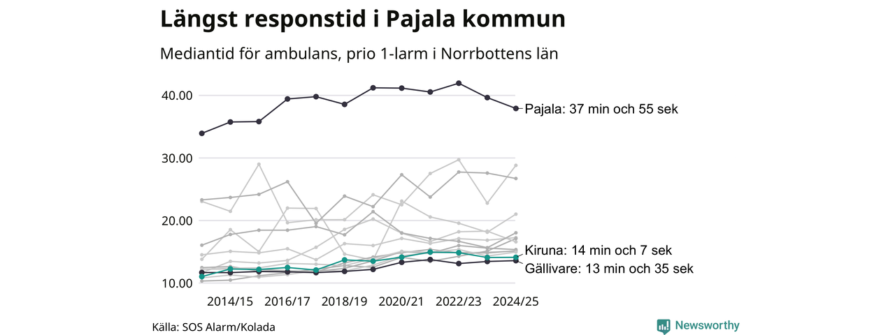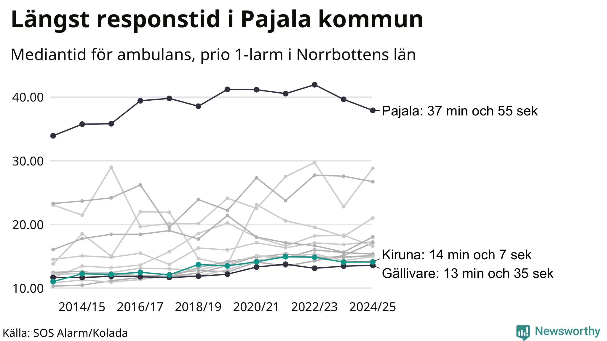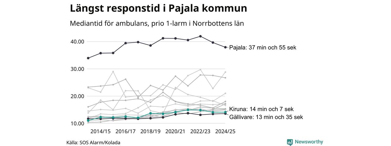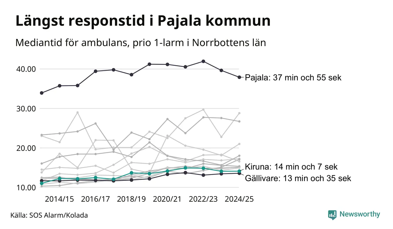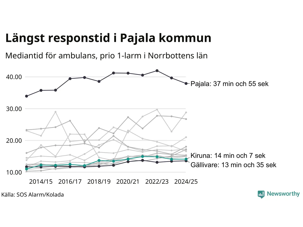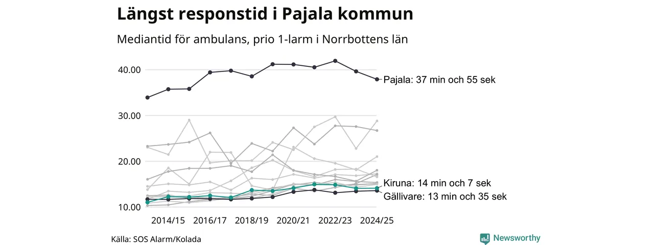 Bland kommunerna i Region Norrbotten nåddes Kiruna näst snabbast av ambulans under 2024/2025. Bara i Gällivare kommer ambulansen snabbare. Längst är väntetiden i Pajala kommun, som också är den kommun i hela landet som får vänta längst på ambulans: 37 minuter och 55 sekunder. Där har väntetiden ändå kapats med 1 minut och 44 sekunder jämfört med året innan.
