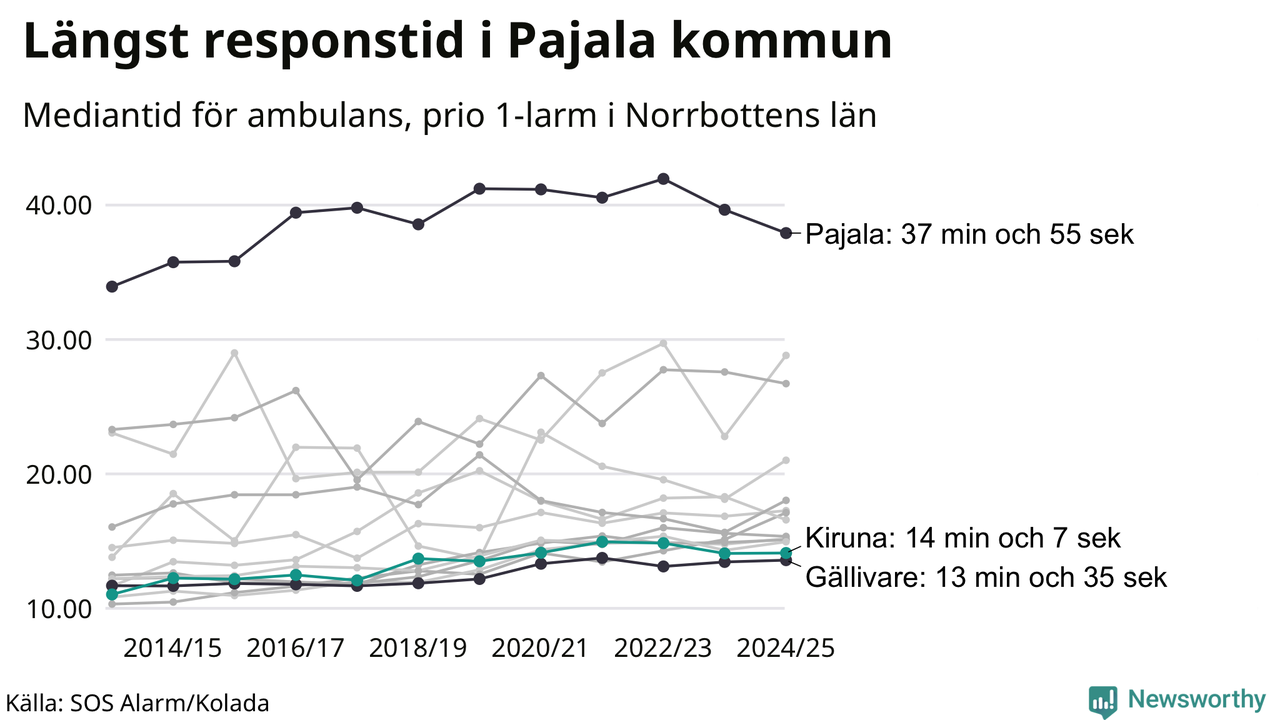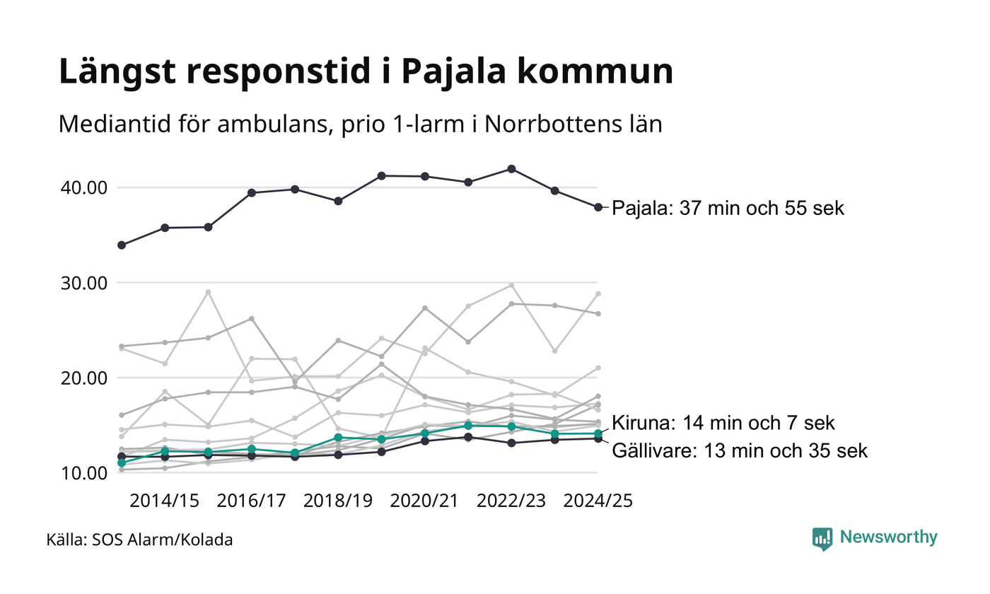 Det tar 14 minuter och 7 sekunder från att 112-samtalet når larmcentralen till att ambulansen är på plats i Kiruna kommun. Det visar de senaste siffrorna från SOS Alarm. Tiden är en mediantid för alla prio 1-larm mellan 1 juni 2024 och 31 maj 2025 och ett nyckeltal som redovisas varje år.