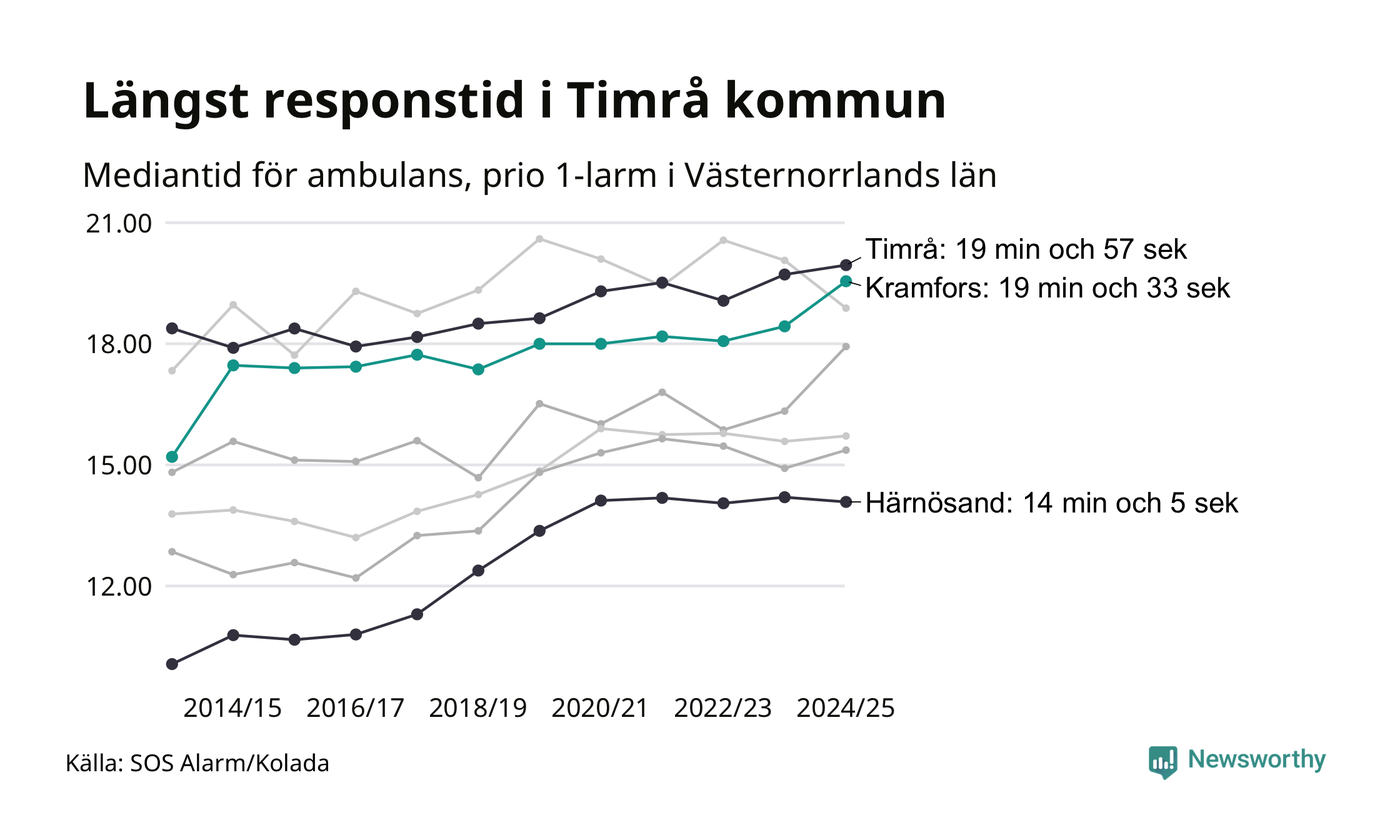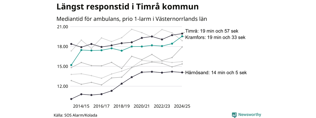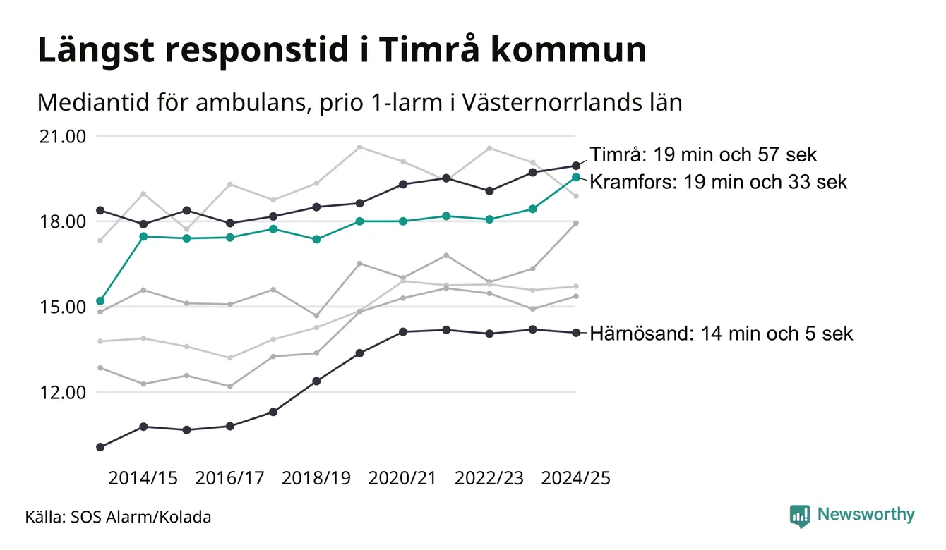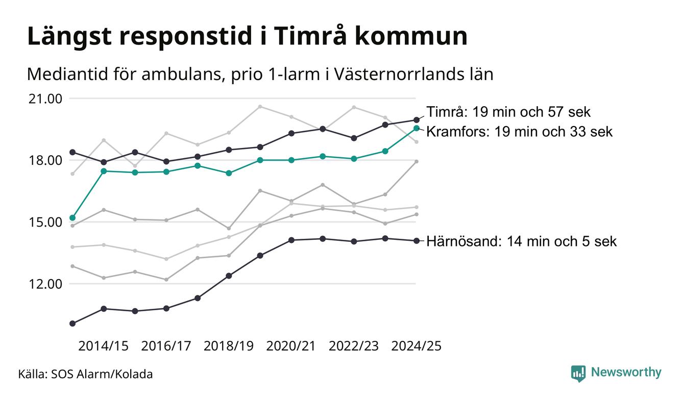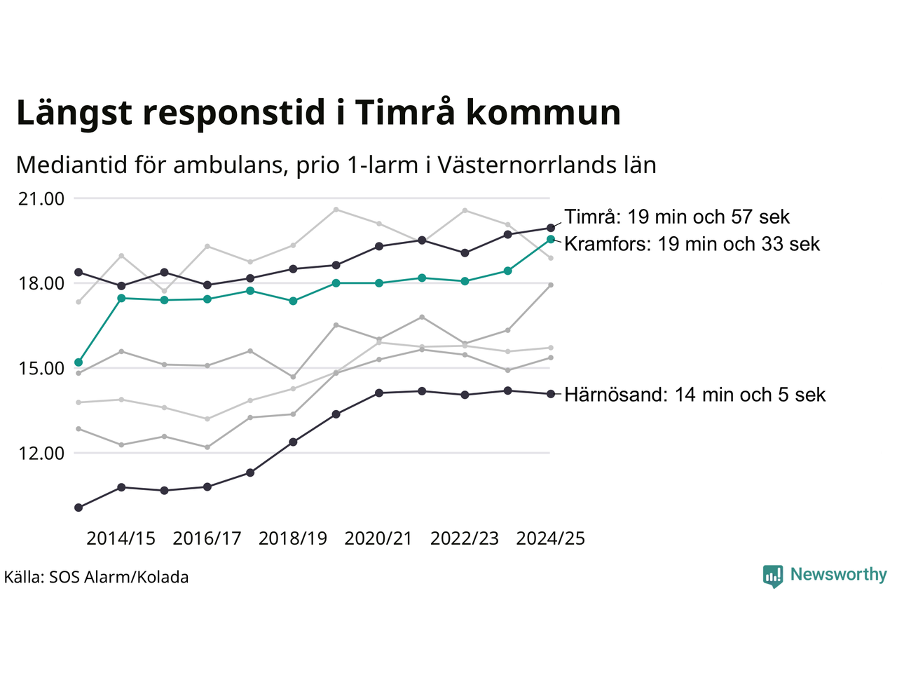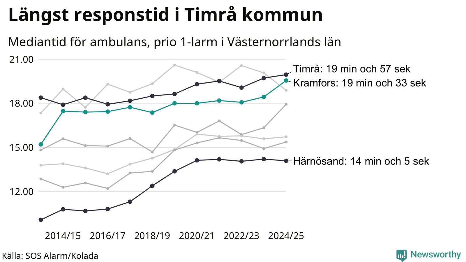 Det tar 19 minuter och 33 sekunder från att 112-samtalet når larmcentralen till att ambulansen är på plats i Kramfors kommun. Det visar de senaste siffrorna från SOS Alarm. Tiden är en mediantid för alla prio 1-larm mellan 1 juni 2024 och 31 maj 2025 och ett nyckeltal som redovisas varje år.