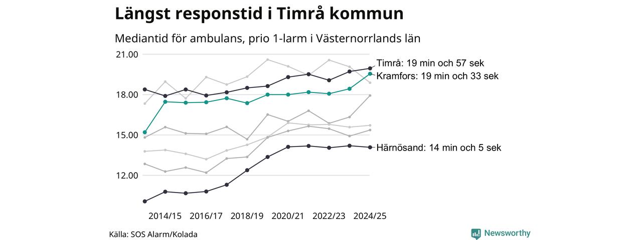 Bara i Timrå (19 minuter och 57 sekunder) får man vänta längre på ambulansen i Region Västernorrland. Snabbast är den framme i Härnösand: 14 minuter och 5 sekunder.