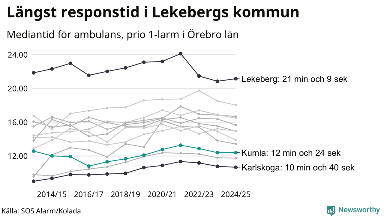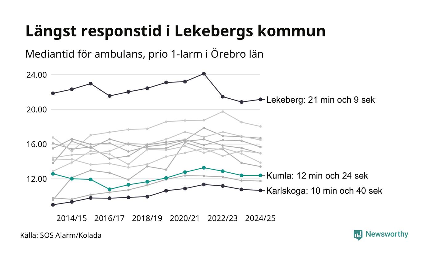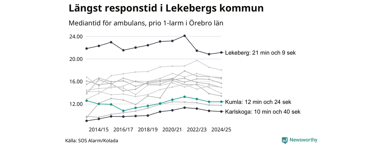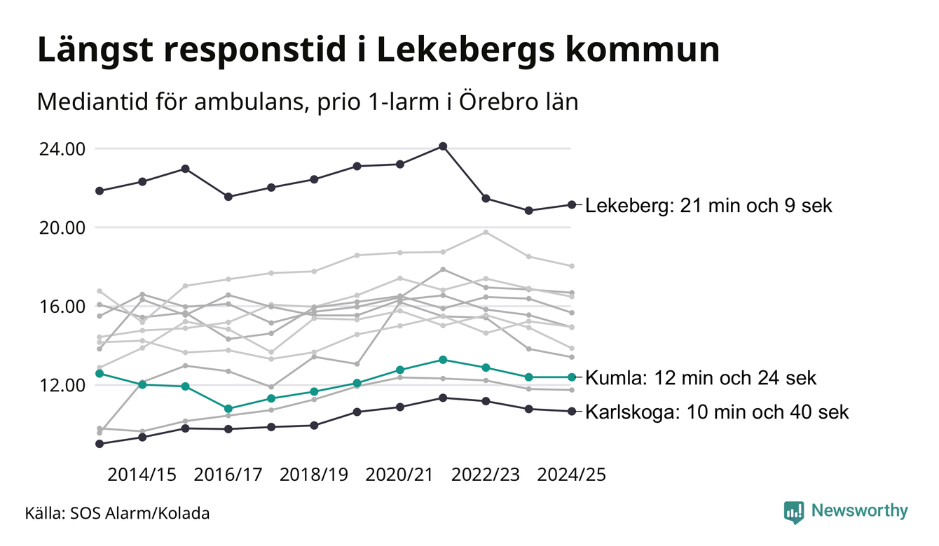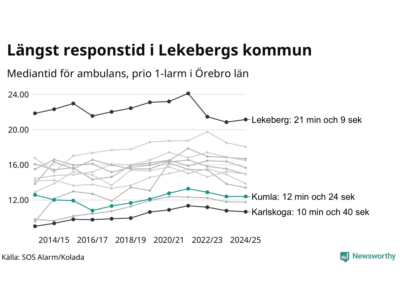 Det tar 12 minuter och 24 sekunder från att 112-samtalet når larmcentralen till att ambulansen är på plats i Kumla kommun. Det visar de senaste siffrorna från SOS Alarm. Tiden är en mediantid för alla prio 1-larm mellan 1 juni 2024 och 31 maj 2025 och ett nyckeltal som redovisas varje år.