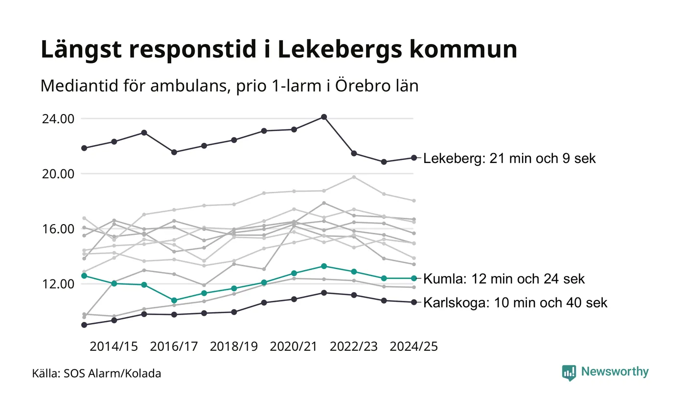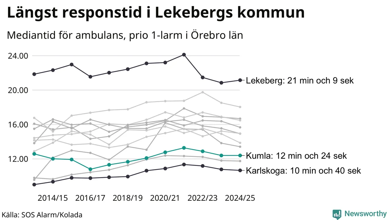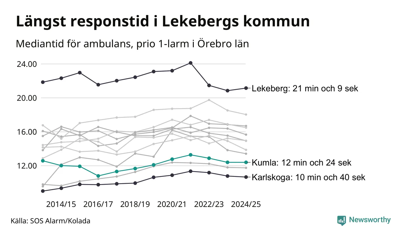 Men Kumla tillhör inte de kommuner i Region Örebro som får vänta längst på ambulans – tvärt om. Längst är väntetiden i Lekebergs kommun: 21 minuter och 9 sekunder. Snabbast var ambulansen framme i Karlskoga, där det tog 10 minuter och 40 sekunder från larmsamtalet 2024/2025.