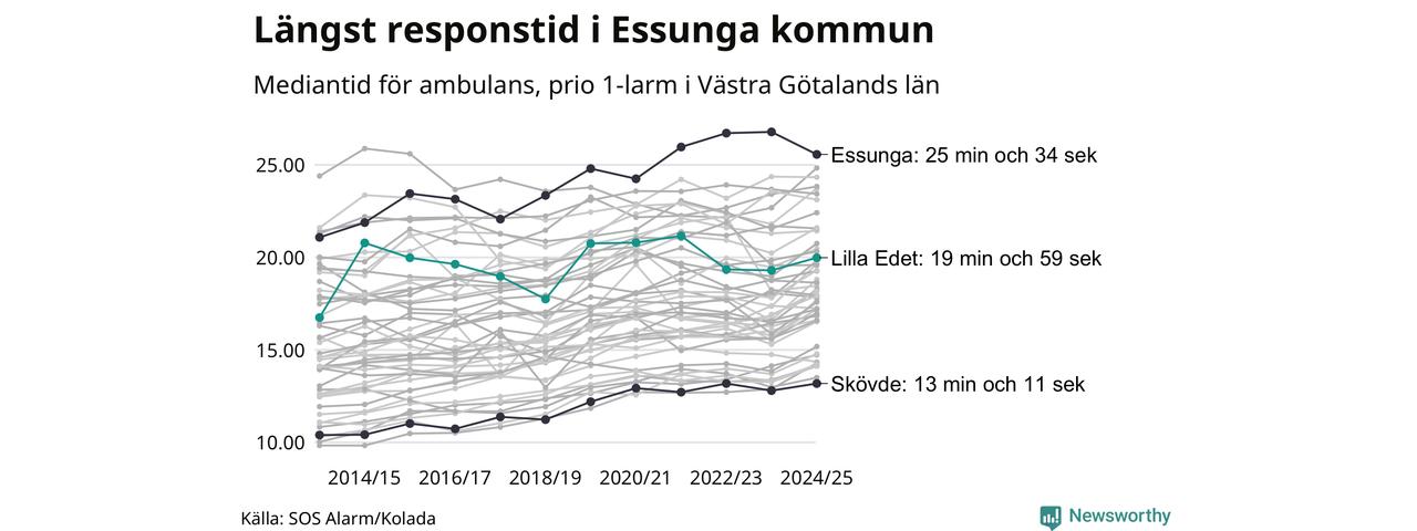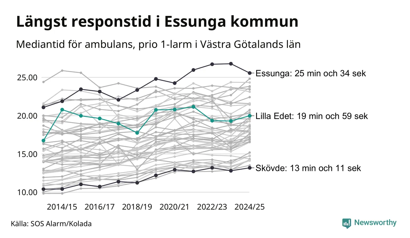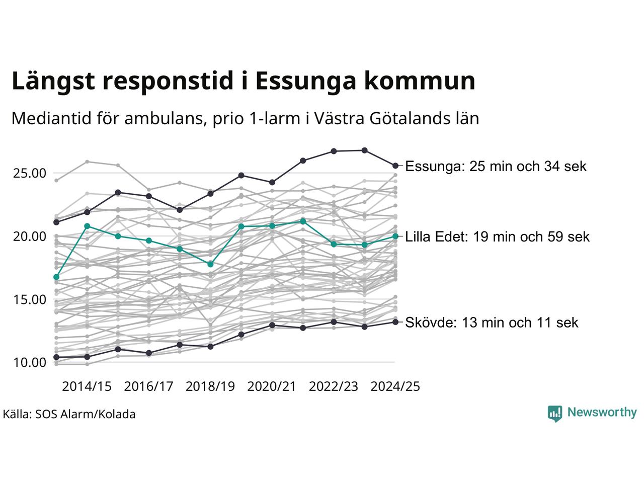 Lilla Edet tillhör de kommuner i Västra Götalandsregionen som får vänta längst på ambulansen. Längst är väntetiden i Essunga kommun, som också tillhör de tio kommuner i landet som får vänta längst på ambulans: 25 minuter och 34 sekunder. Snabbast var ambulansen framme i Skövde, där det tog 13 minuter och 11 sekunder från larmsamtalet 2024/2025.