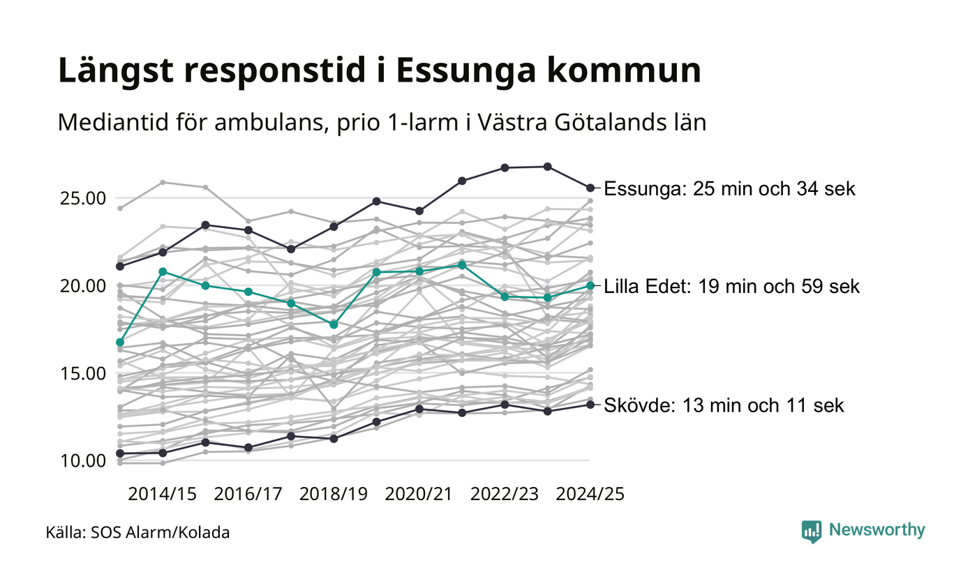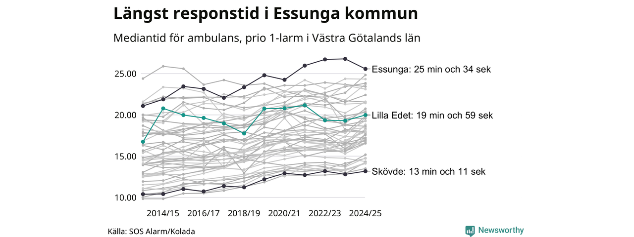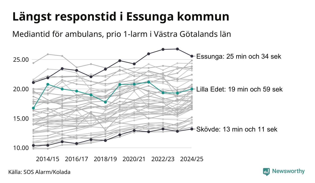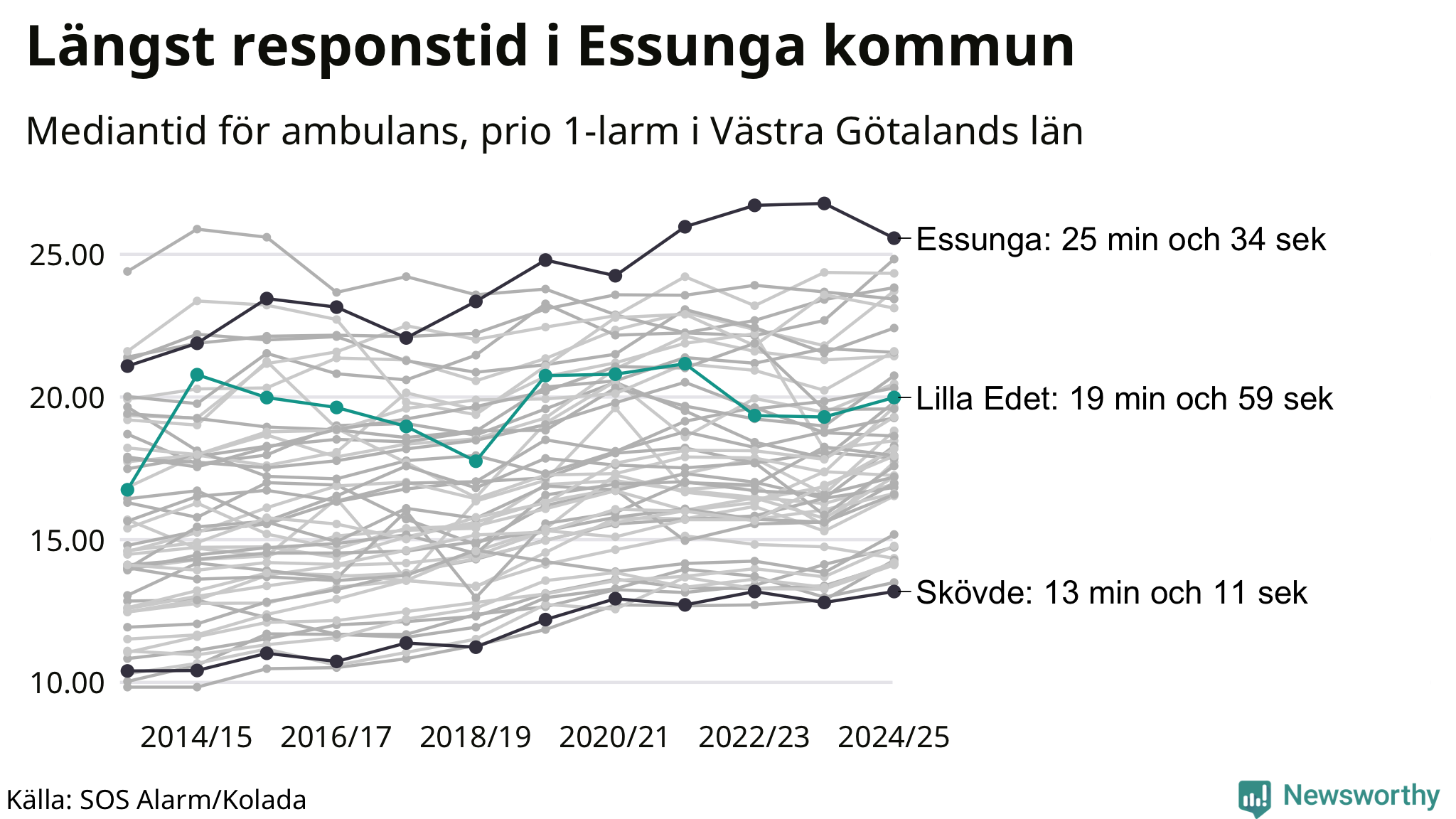 Lilla Edet tillhör de kommuner i Västra Götalandsregionen som får vänta längst på ambulansen. Längst är väntetiden i Essunga kommun, som också tillhör de tio kommuner i landet som får vänta längst på ambulans: 25 minuter och 34 sekunder. Snabbast var ambulansen framme i Skövde, där det tog 13 minuter och 11 sekunder från larmsamtalet 2024/2025.