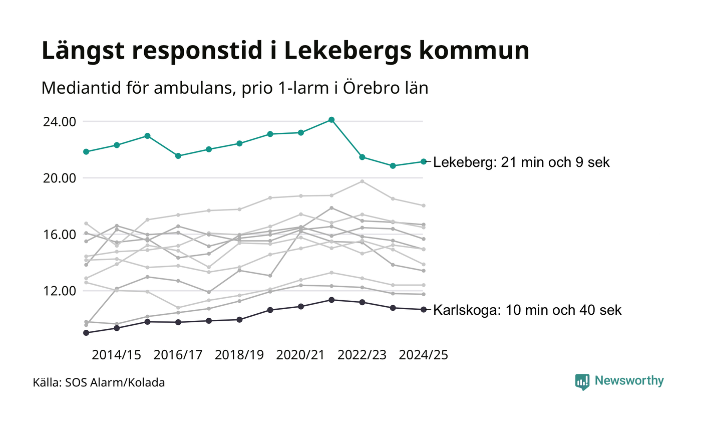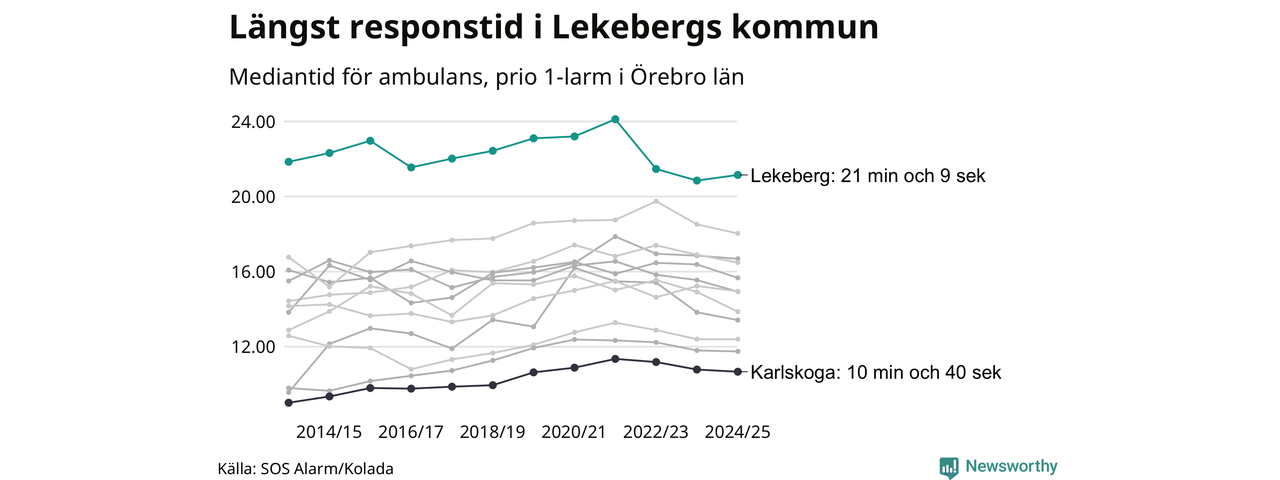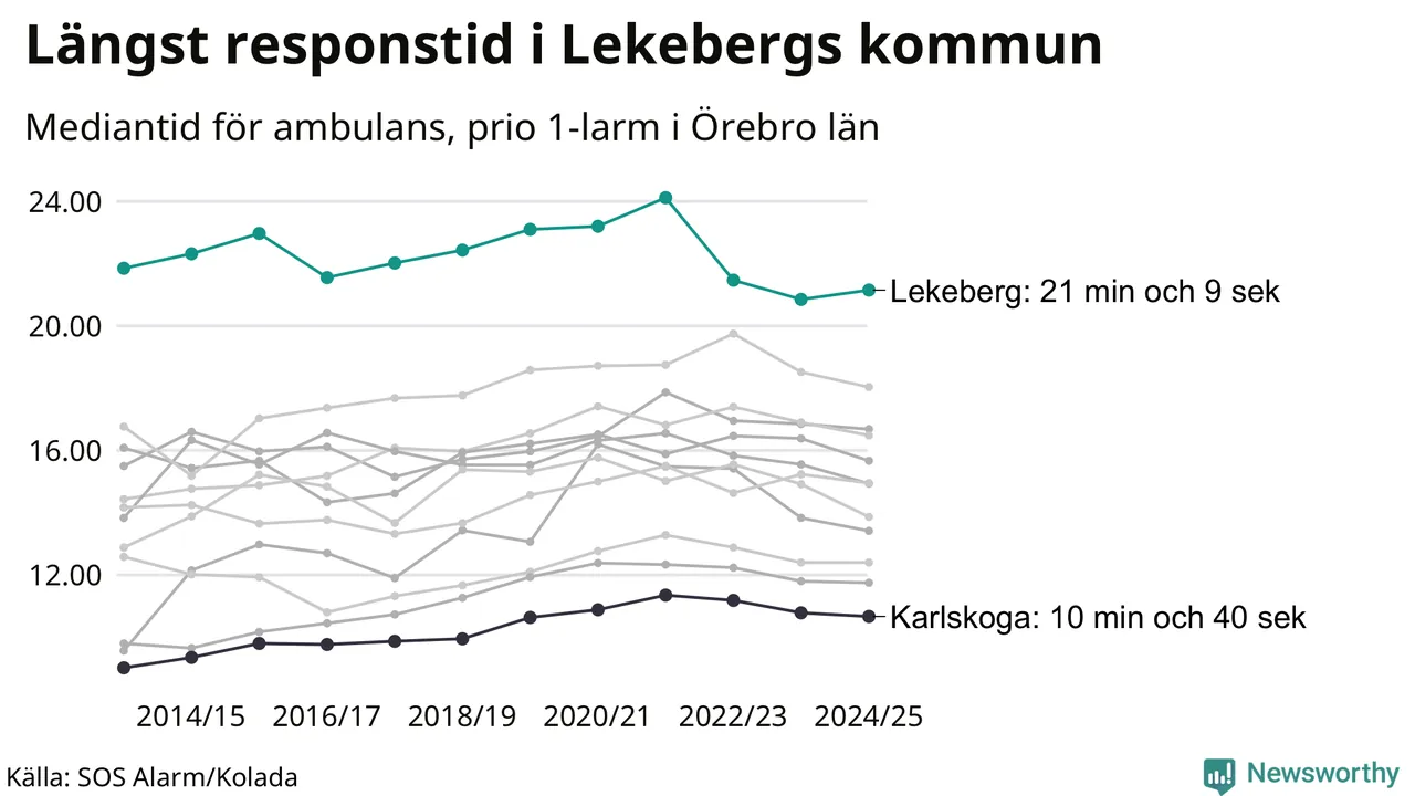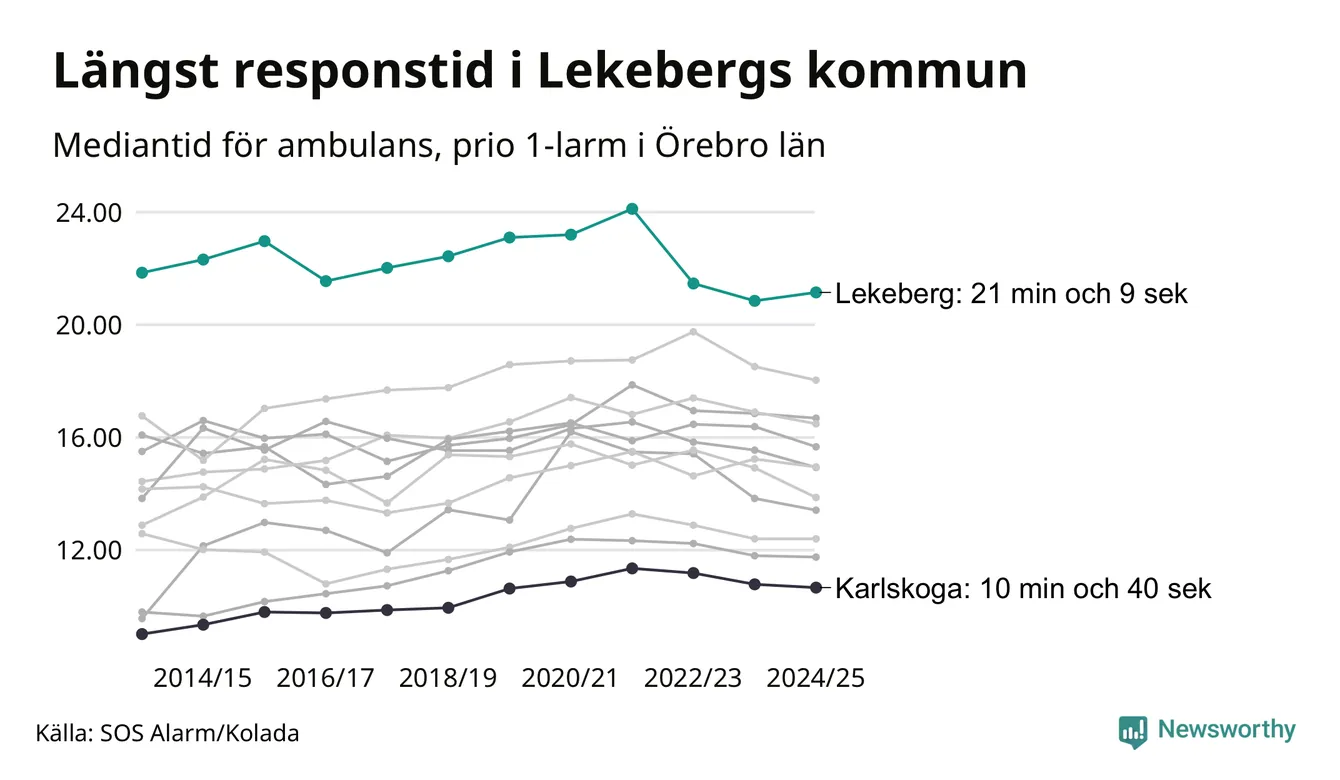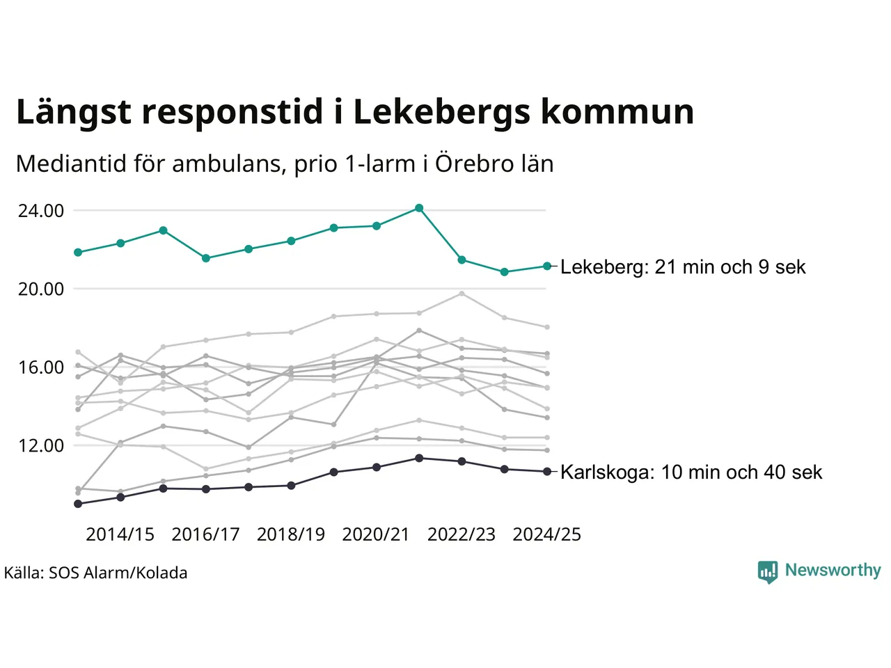 Det tar 21 minuter och 9 sekunder från att 112-samtalet når larmcentralen till att ambulansen är på plats i Lekebergs kommun. Det visar de senaste siffrorna från SOS Alarm. Tiden är en mediantid för alla prio 1-larm mellan 1 juni 2024 och 31 maj 2025 och ett nyckeltal som redovisas varje år.