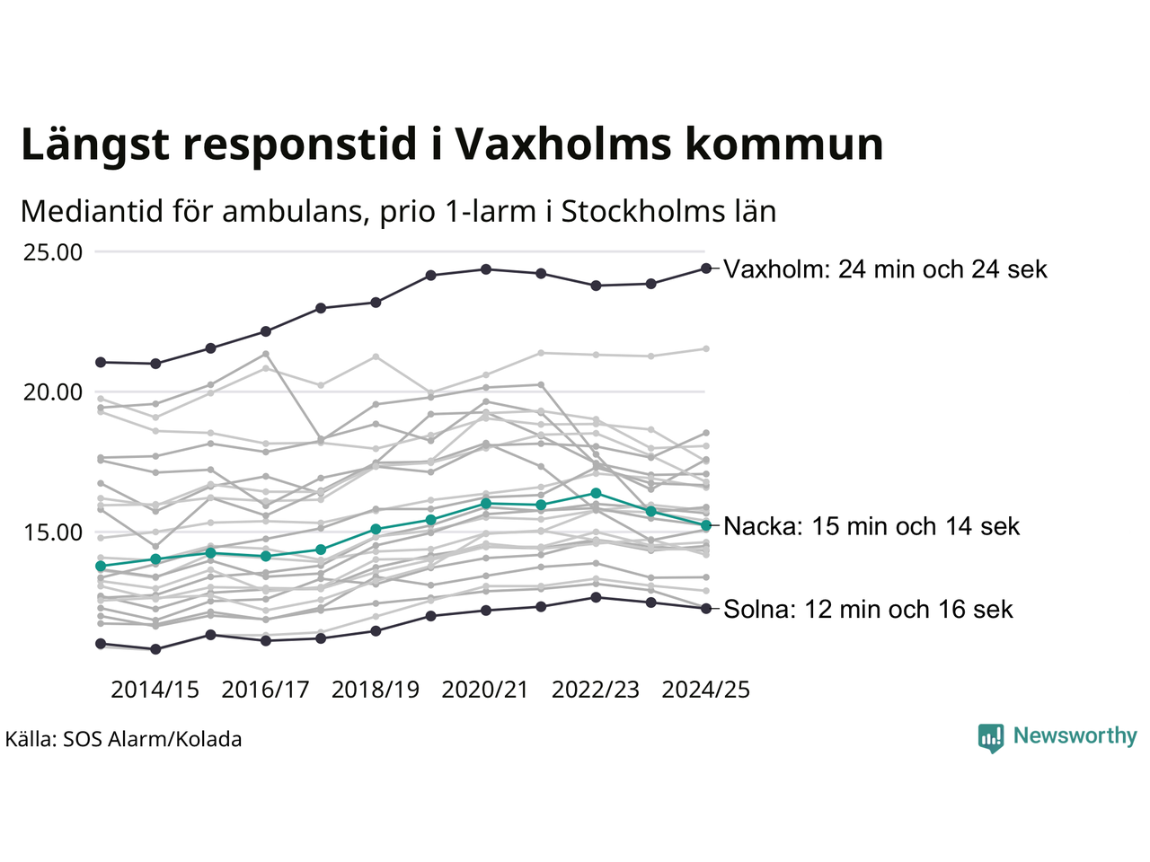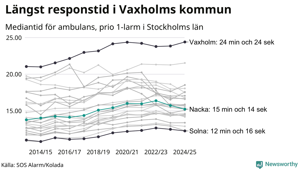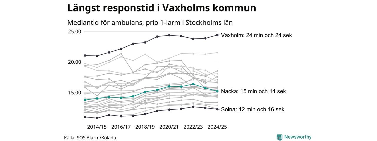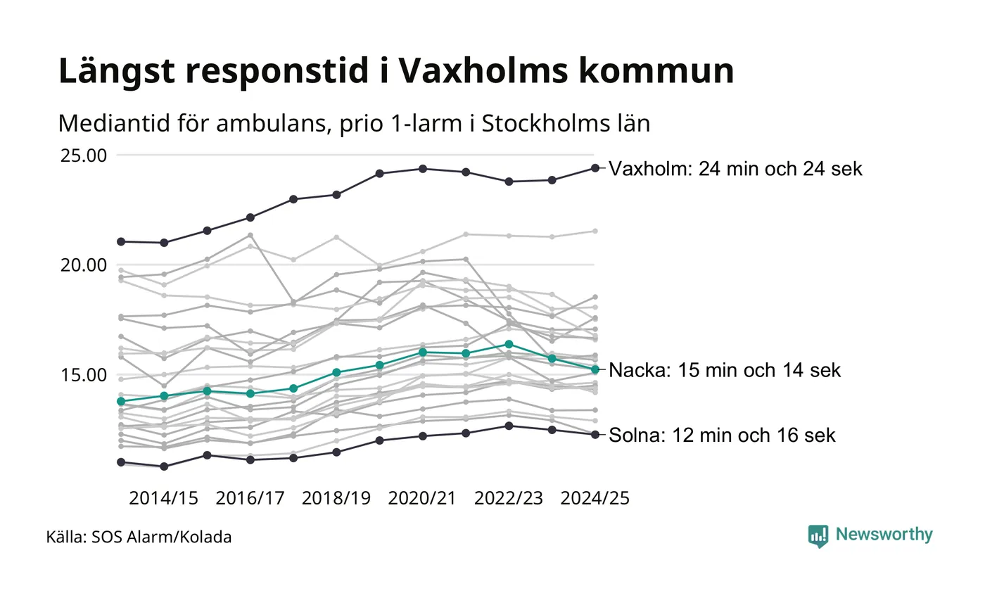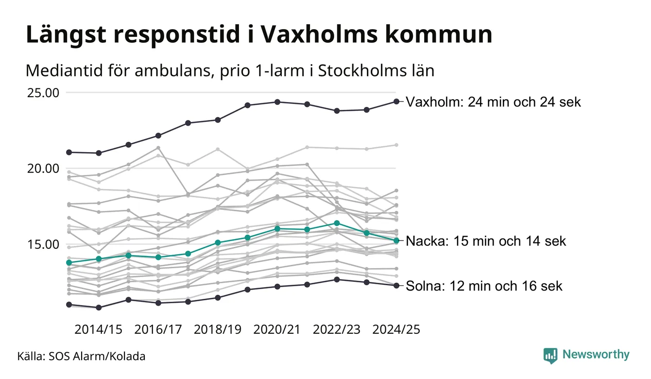 Nacka tillhör inte de kommuner i Region Stockholm som får vänta längst på ambulans – men inte heller de som får snabbast hjälp. Längst är väntetiden i Vaxholms kommun: 24 minuter och 24 sekunder. Snabbast var ambulansen framme i Solna, där det tog 12 minuter och 16 sekunder från larmsamtalet 2024/2025.