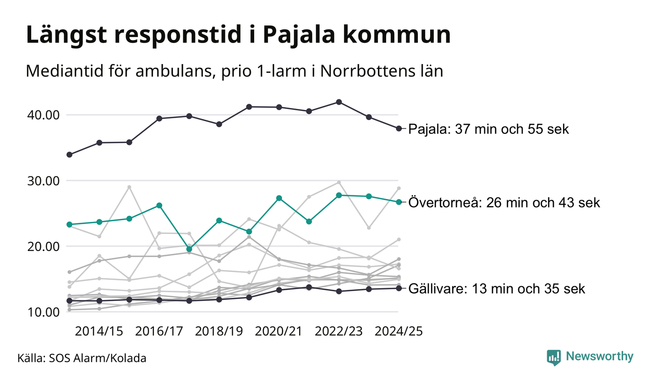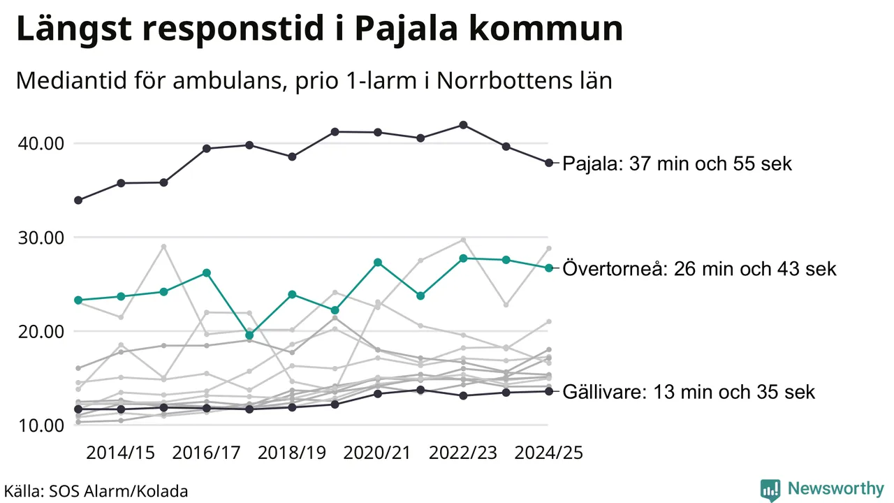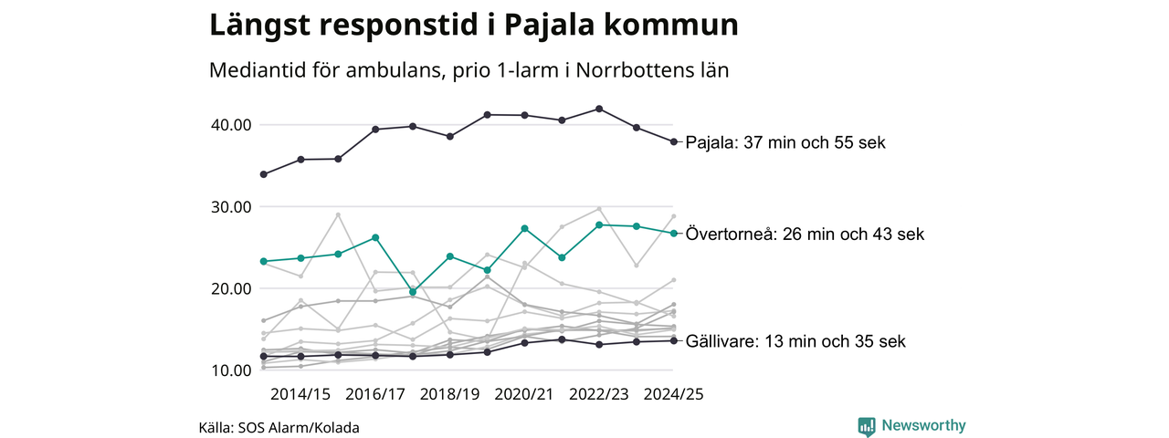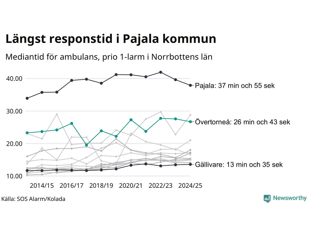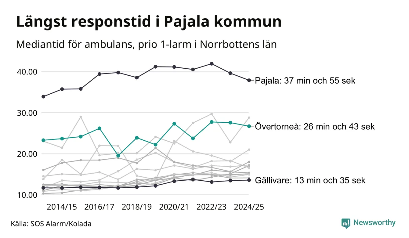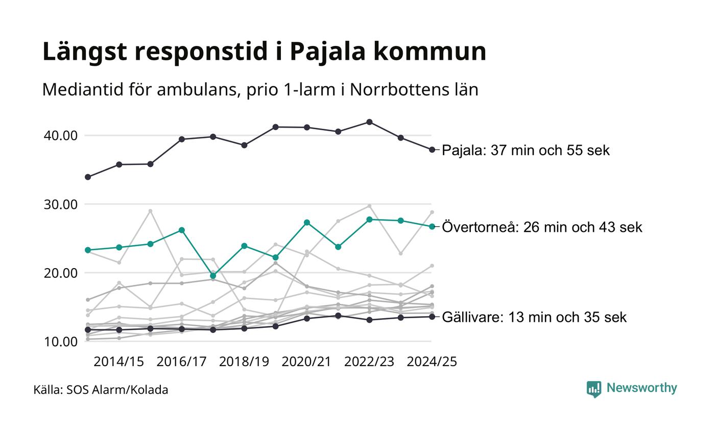 Det tar 26 minuter och 43 sekunder från att 112-samtalet når larmcentralen till att ambulansen är på plats i Övertorneå kommun. Det visar de senaste siffrorna från SOS Alarm. Tiden är en mediantid för alla prio 1-larm mellan 1 juni 2024 och 31 maj 2025 och ett nyckeltal som redovisas varje år.