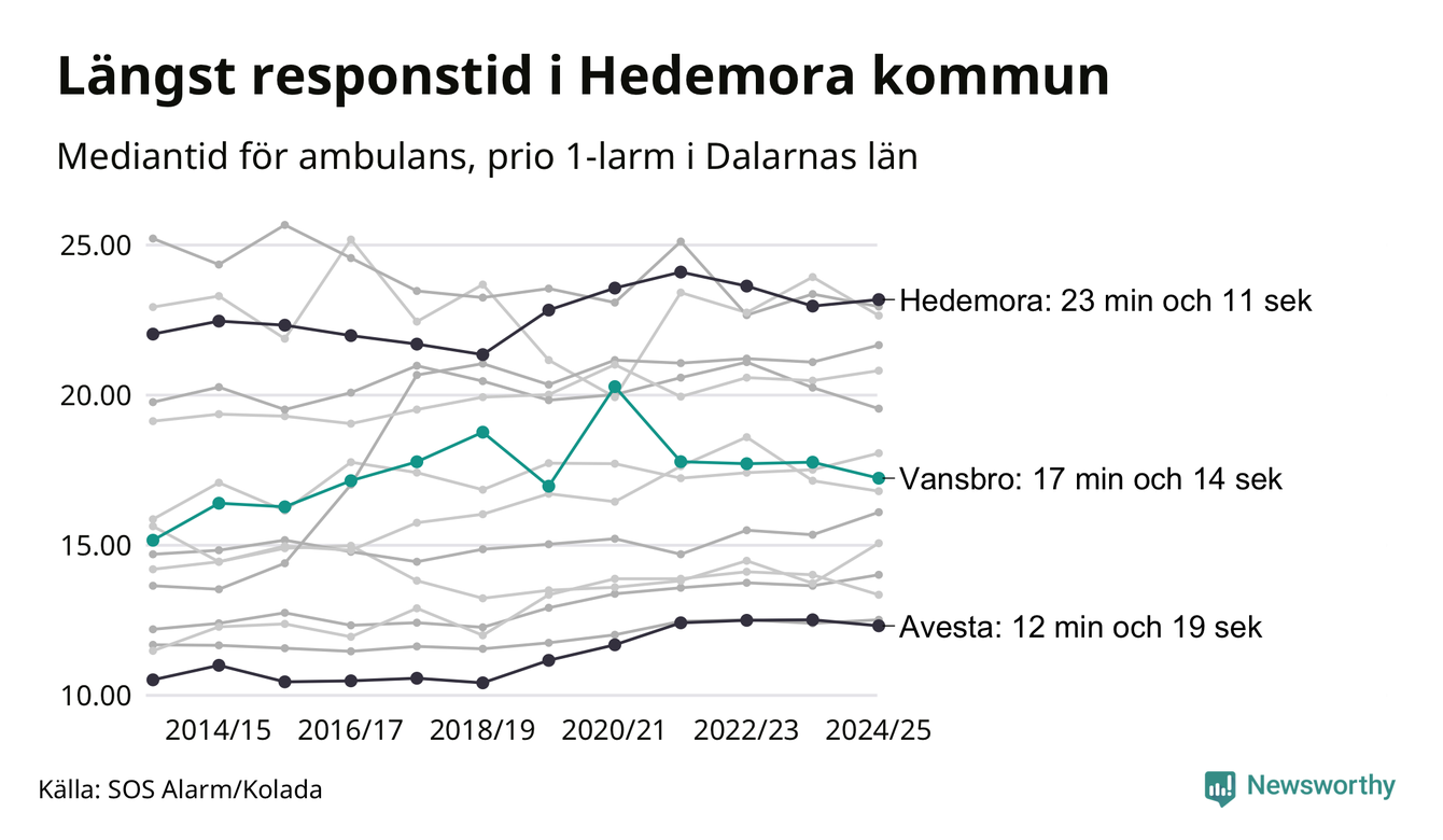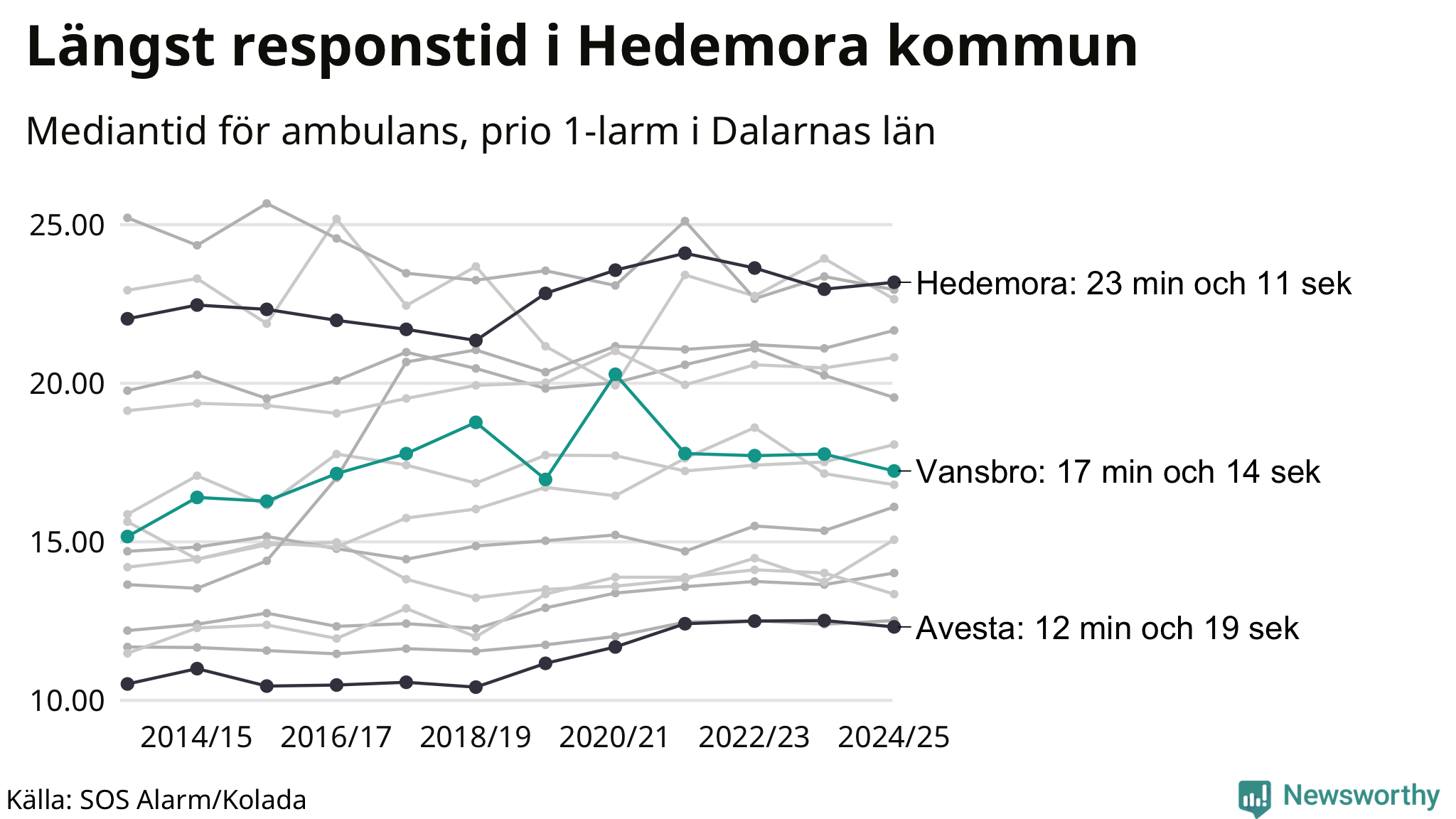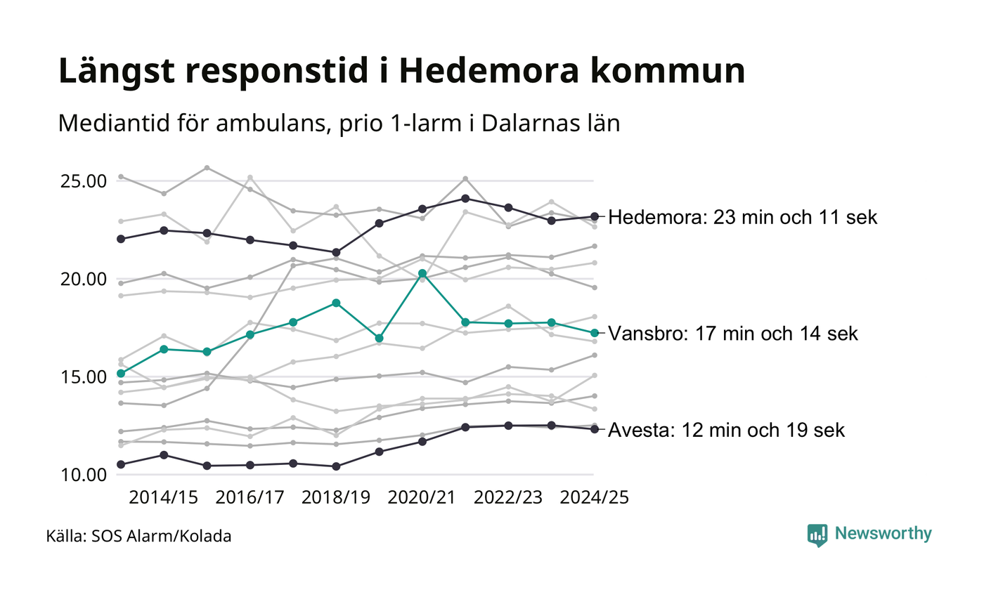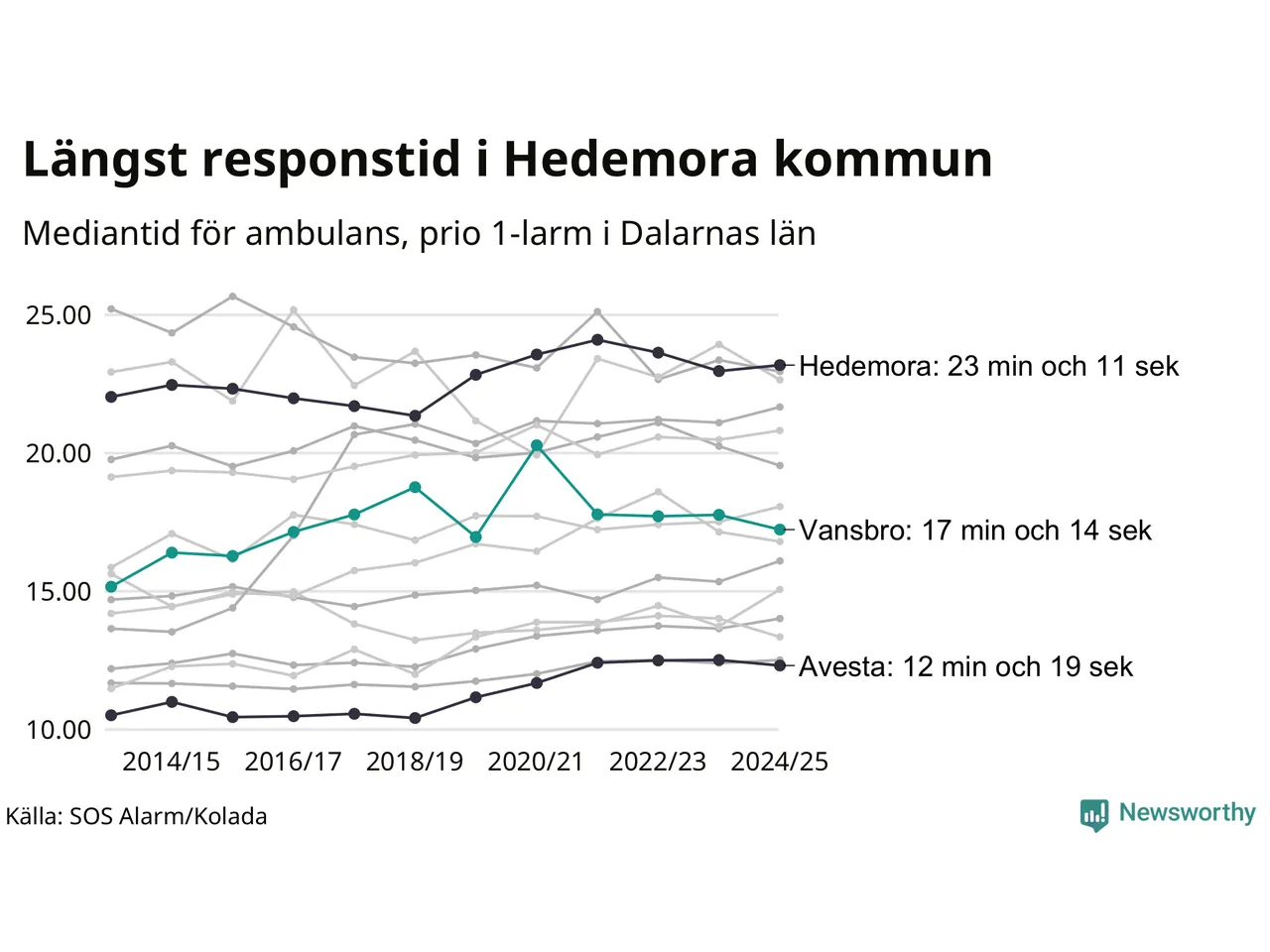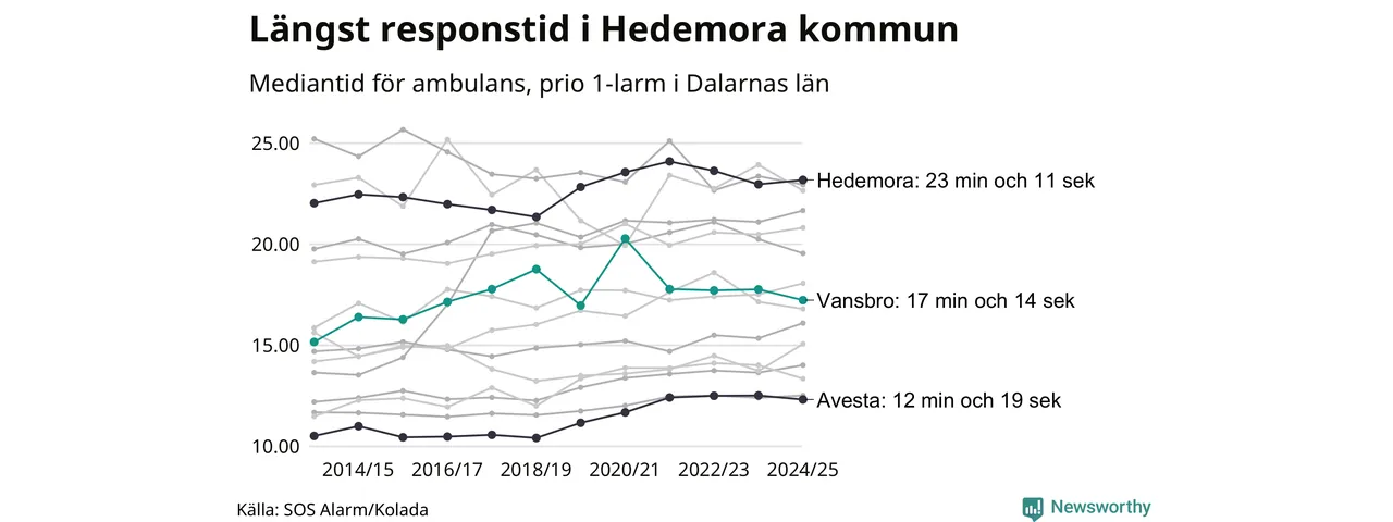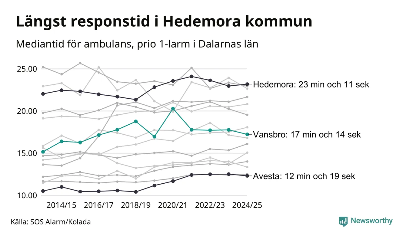 Vansbro tillhör inte de kommuner i Region Dalarna som får vänta längst på ambulans – men inte heller de som får snabbast hjälp. Längst är väntetiden i Hedemora kommun: 23 minuter och 11 sekunder. Snabbast var ambulansen framme i Avesta, där det tog 12 minuter och 19 sekunder från larmsamtalet 2024/2025.