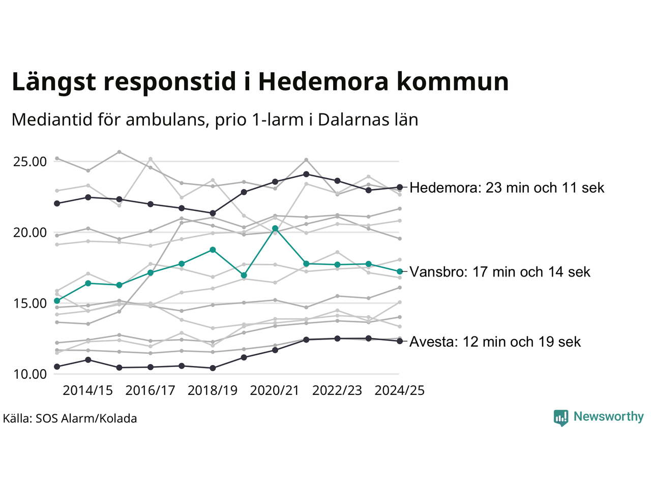 Även om väntan i Hedemora är lång för att vara Region Dalarna krävs ytterligare 1 minut och 55 sekunder för att ta sig in på topp tiolistan över kommuerna i landet med längst väntetid. Längst är väntan på ambulans i Pajala kommun, 37 minuter och 55 sekunder. Kommunerna med längst responstid finns i Norrlands inland eller i glesbygd.