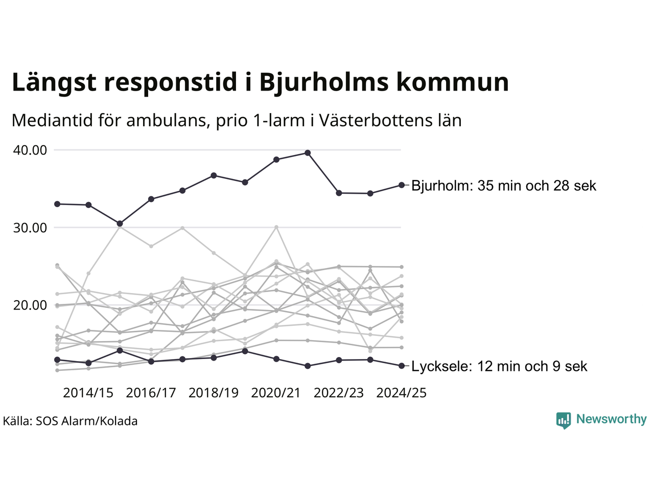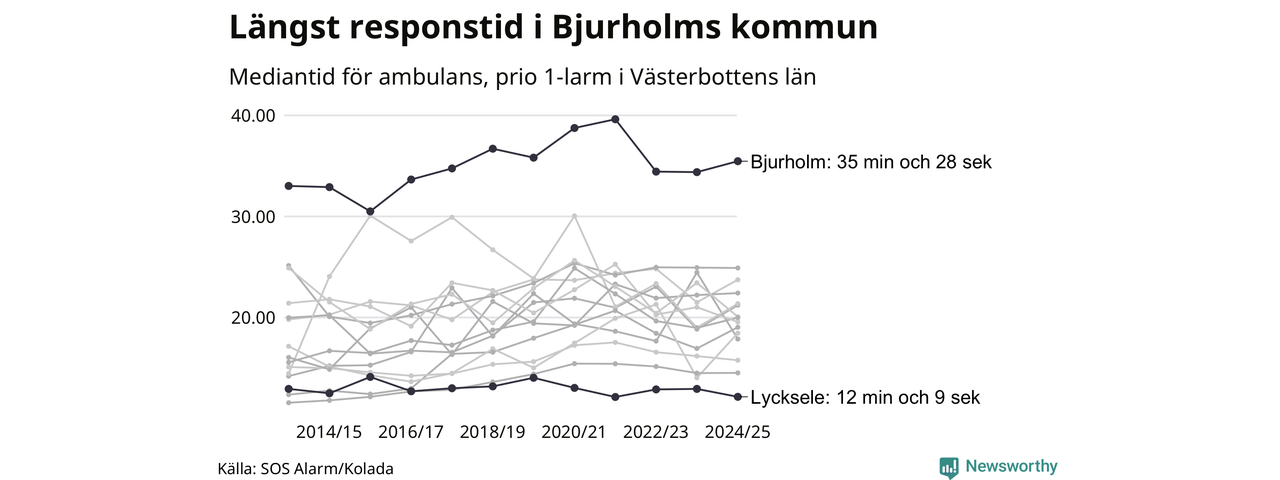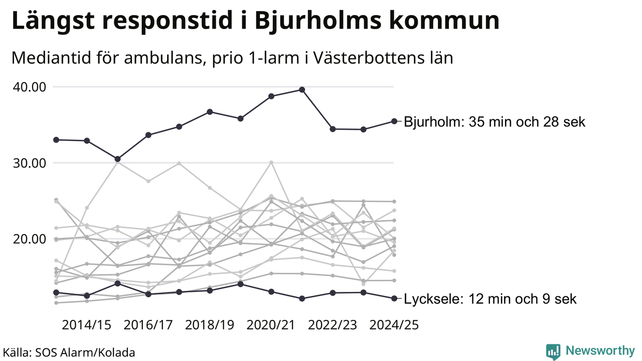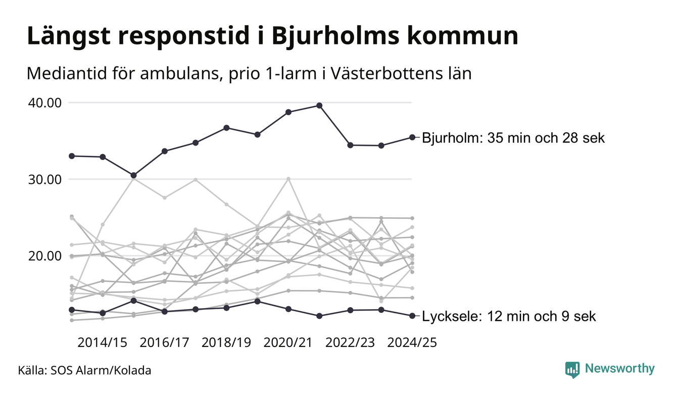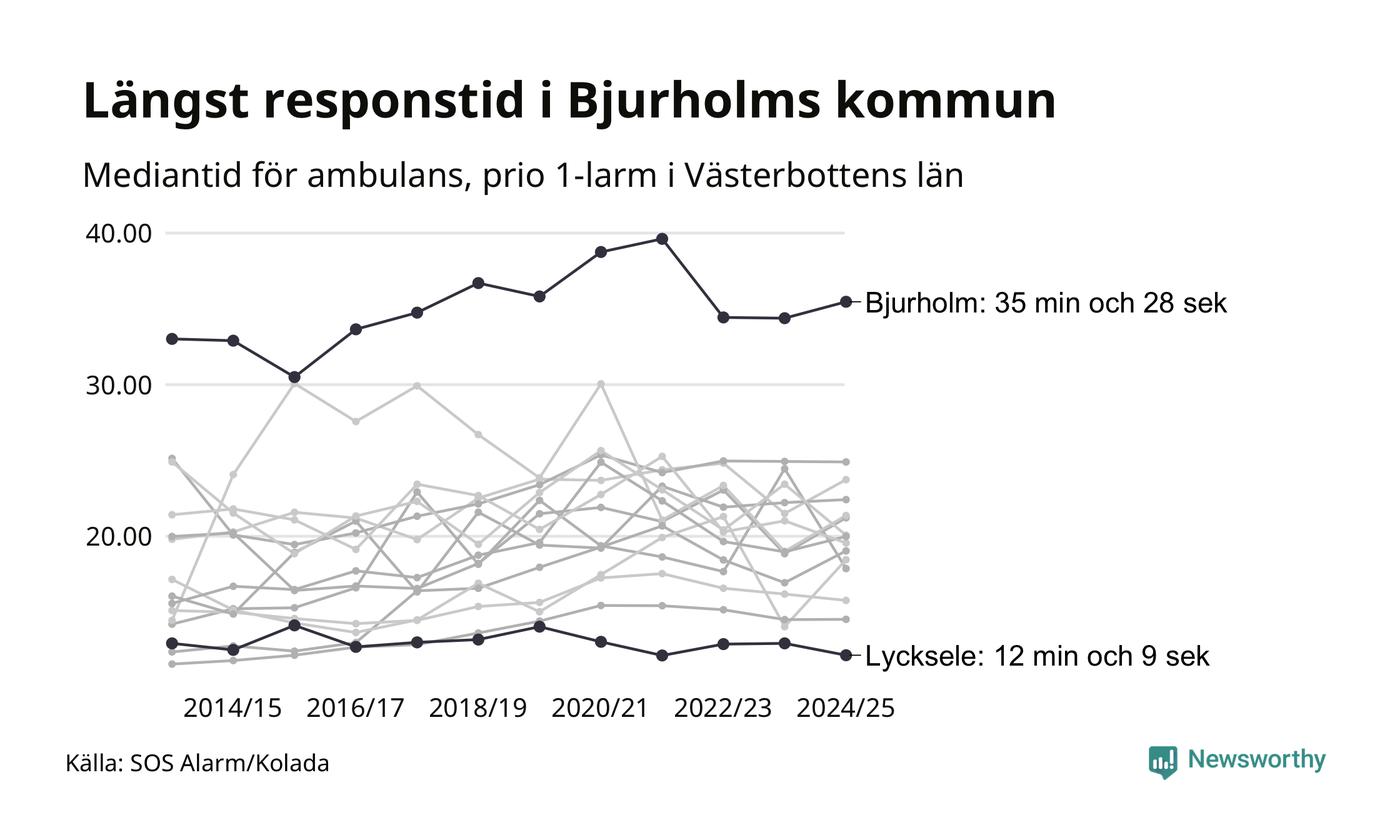 Det tar 35 minuter och 28 sekunder från att 112-samtalet når larmcentralen till att ambulansen är på plats i Bjurholms kommun. I Lycksele dröjer den 12 minuter och 9 sekunder. Det visar de senaste siffrorna från SOS Alarm. Tiden är en mediantid för alla prio 1-larm mellan 1 juni 2024 och 31 maj 2025 och ett nyckeltal som redovisas varje år.