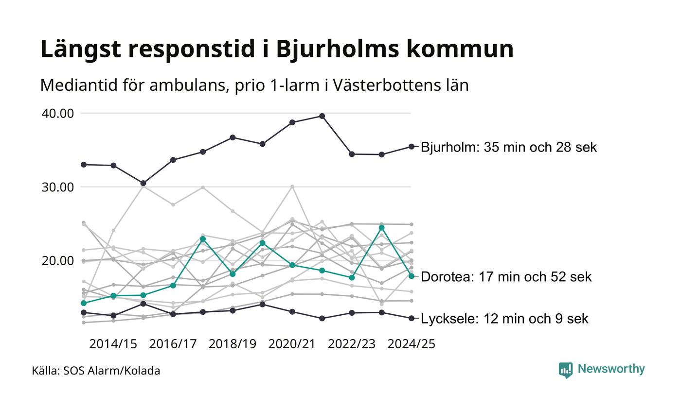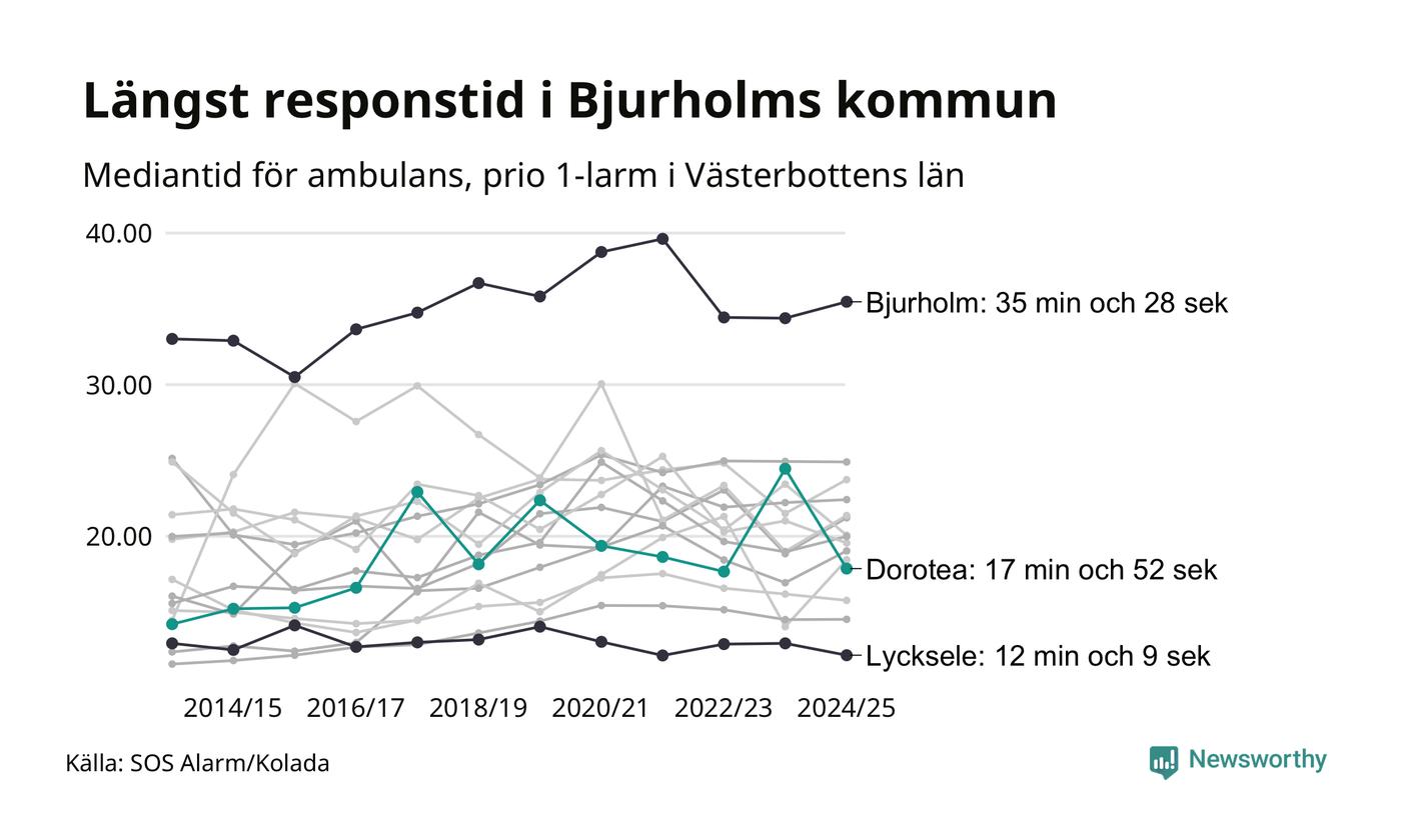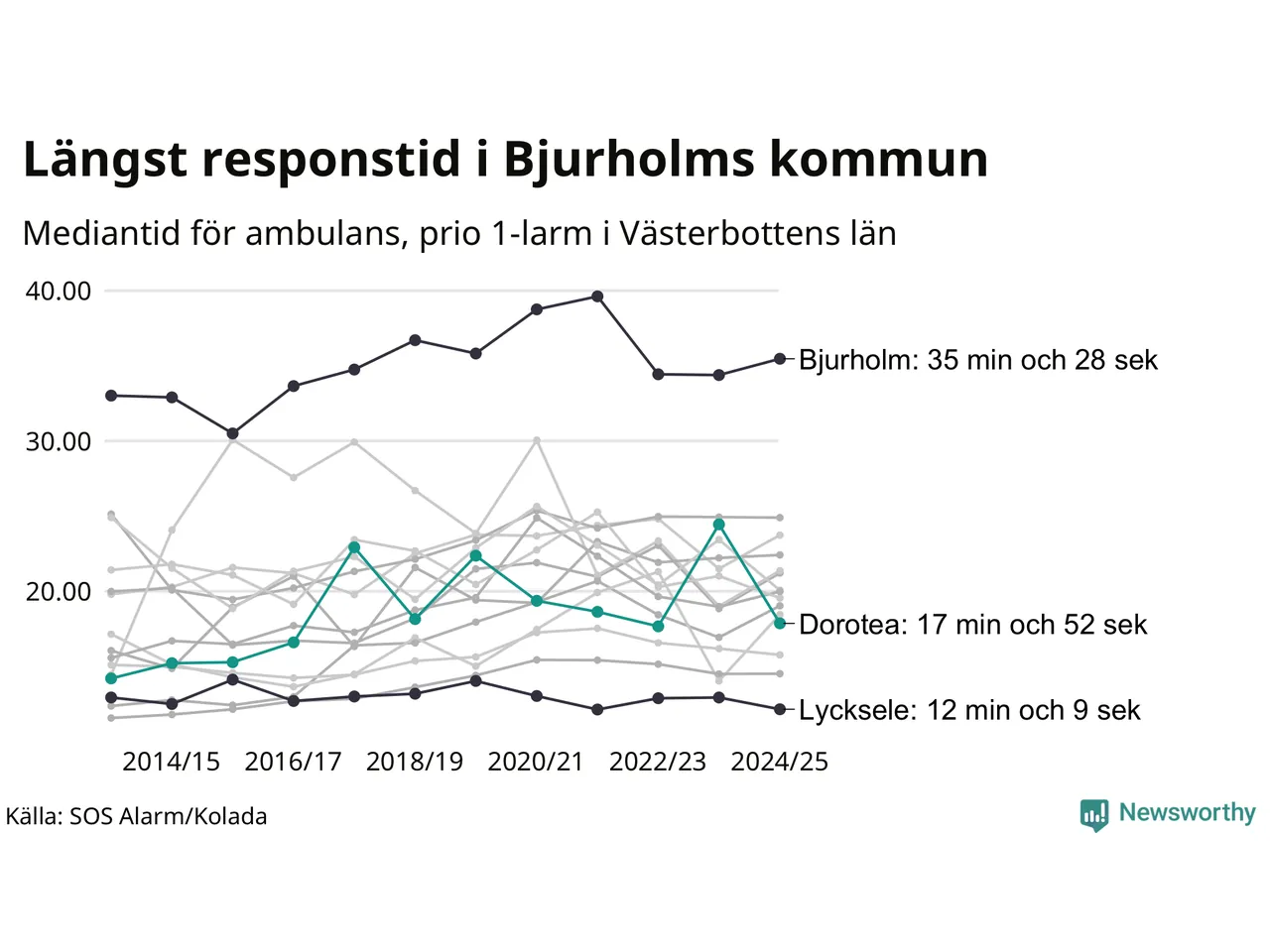 Bjurholm är alltså en av de kommuner som får vänta längst på ambulans i landet. Längst är väntan på ambulans i Pajala kommun, 37 minuter och 55 sekunder. Kommunerna med längst responstid finns i Norrlands inland eller i glesbygd.