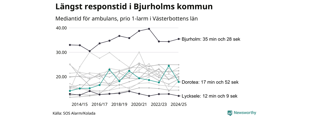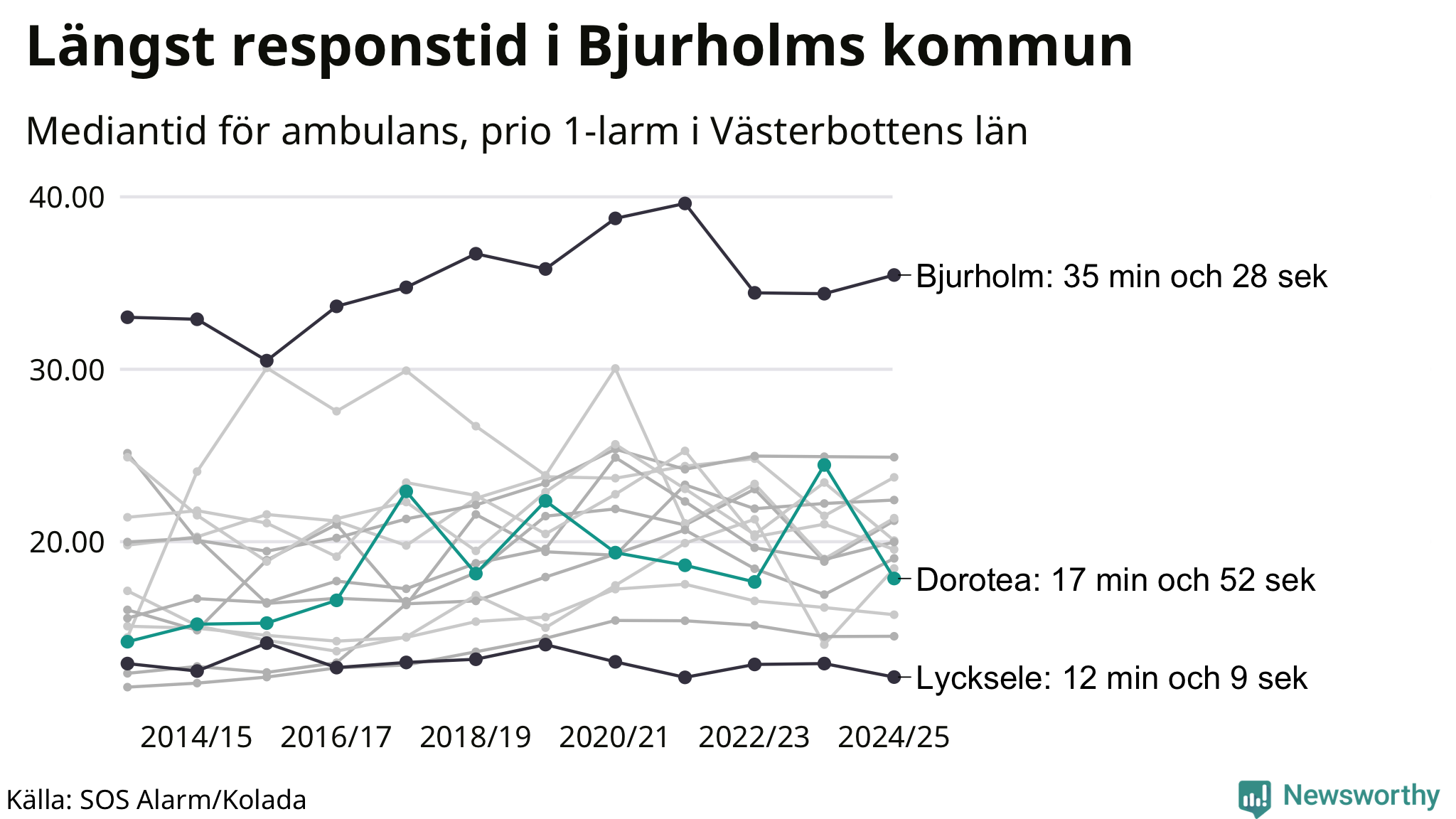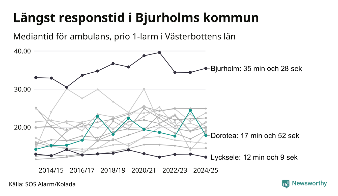 Bjurholm är alltså en av de kommuner som får vänta längst på ambulans i landet. Längst är väntan på ambulans i Pajala kommun, 37 minuter och 55 sekunder. Kommunerna med längst responstid finns i Norrlands inland eller i glesbygd.